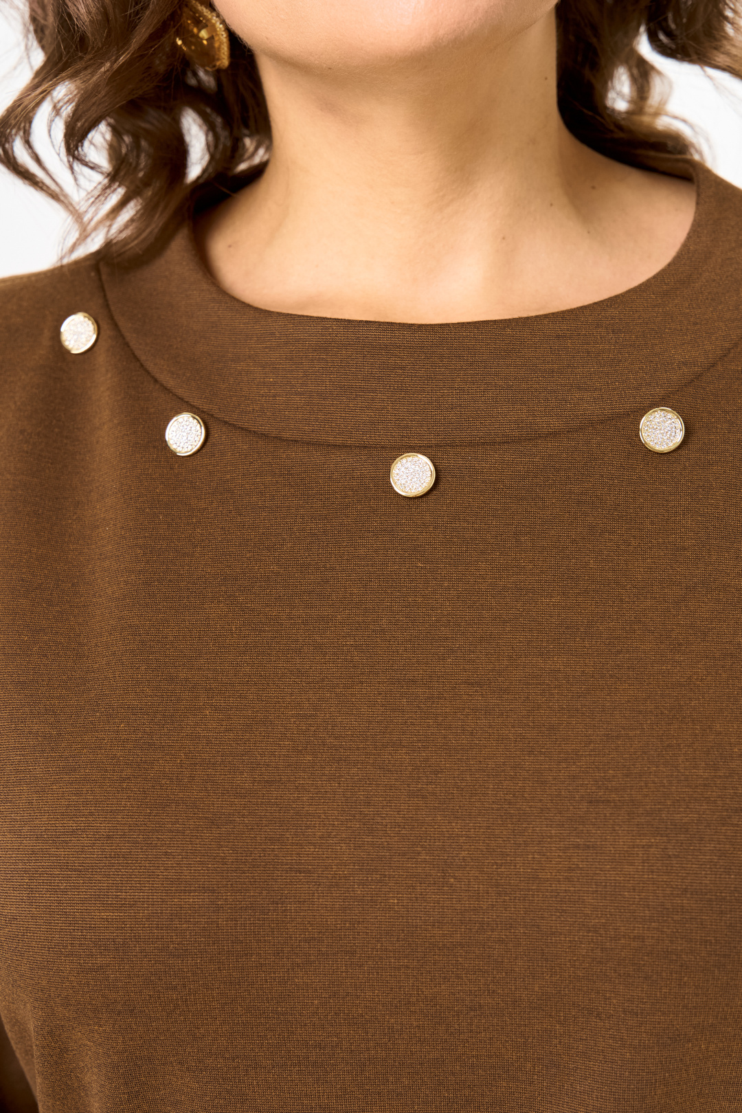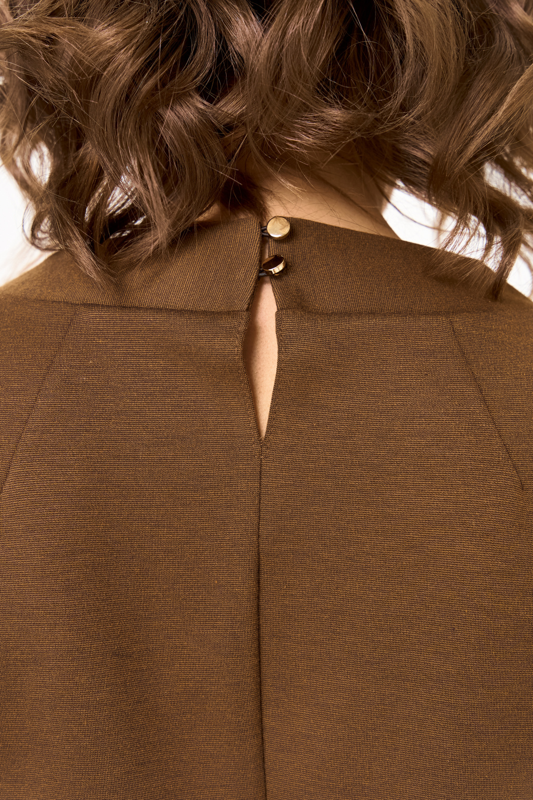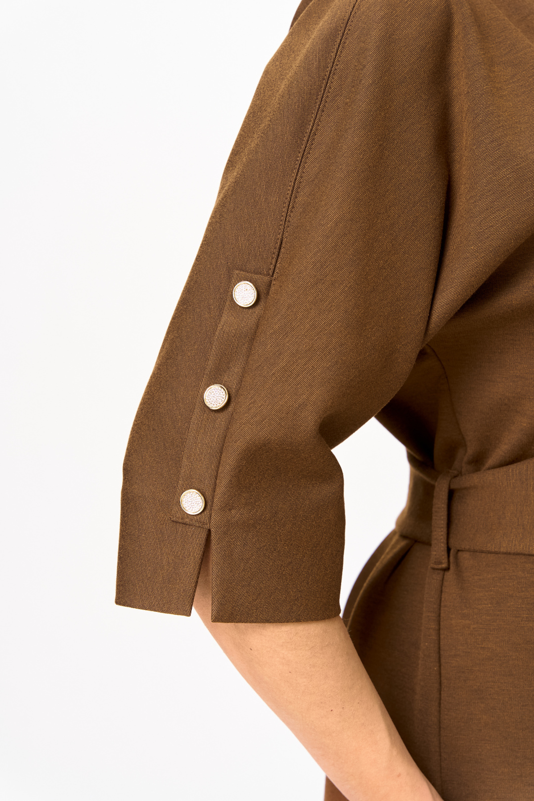 В верхнем шве рукава обработана декоративная планка с пуговицами и разрез по низу. Горловина широкая с воротником-стойка. Со стороны спинки в воротнике обработана застежка с навесными петлями и пуговцами. Вдоль шва горловины расположены декоративные пуговицы.