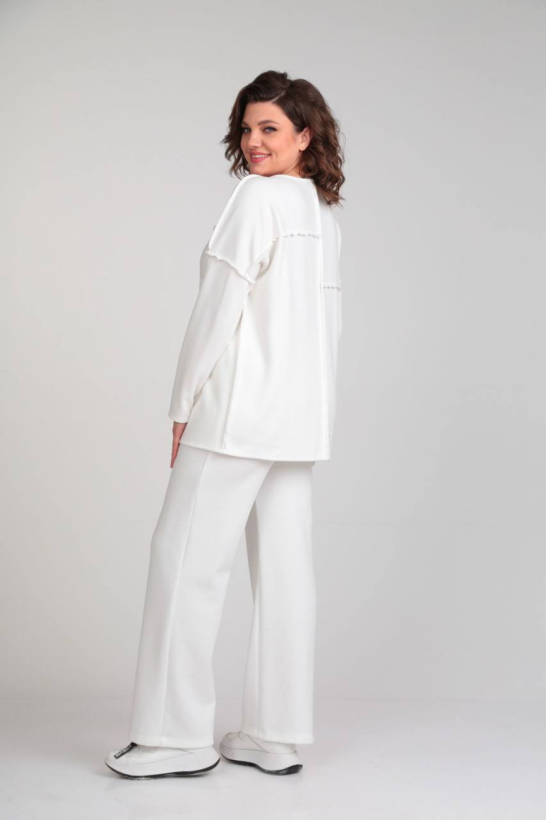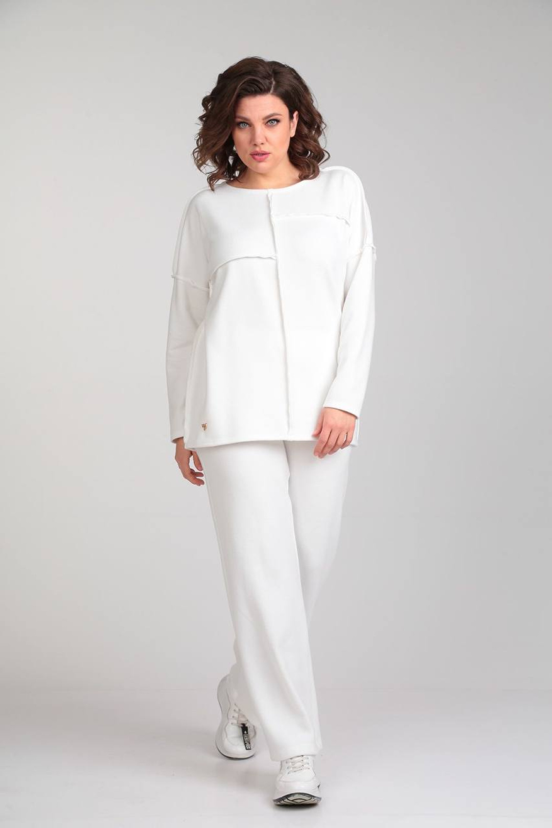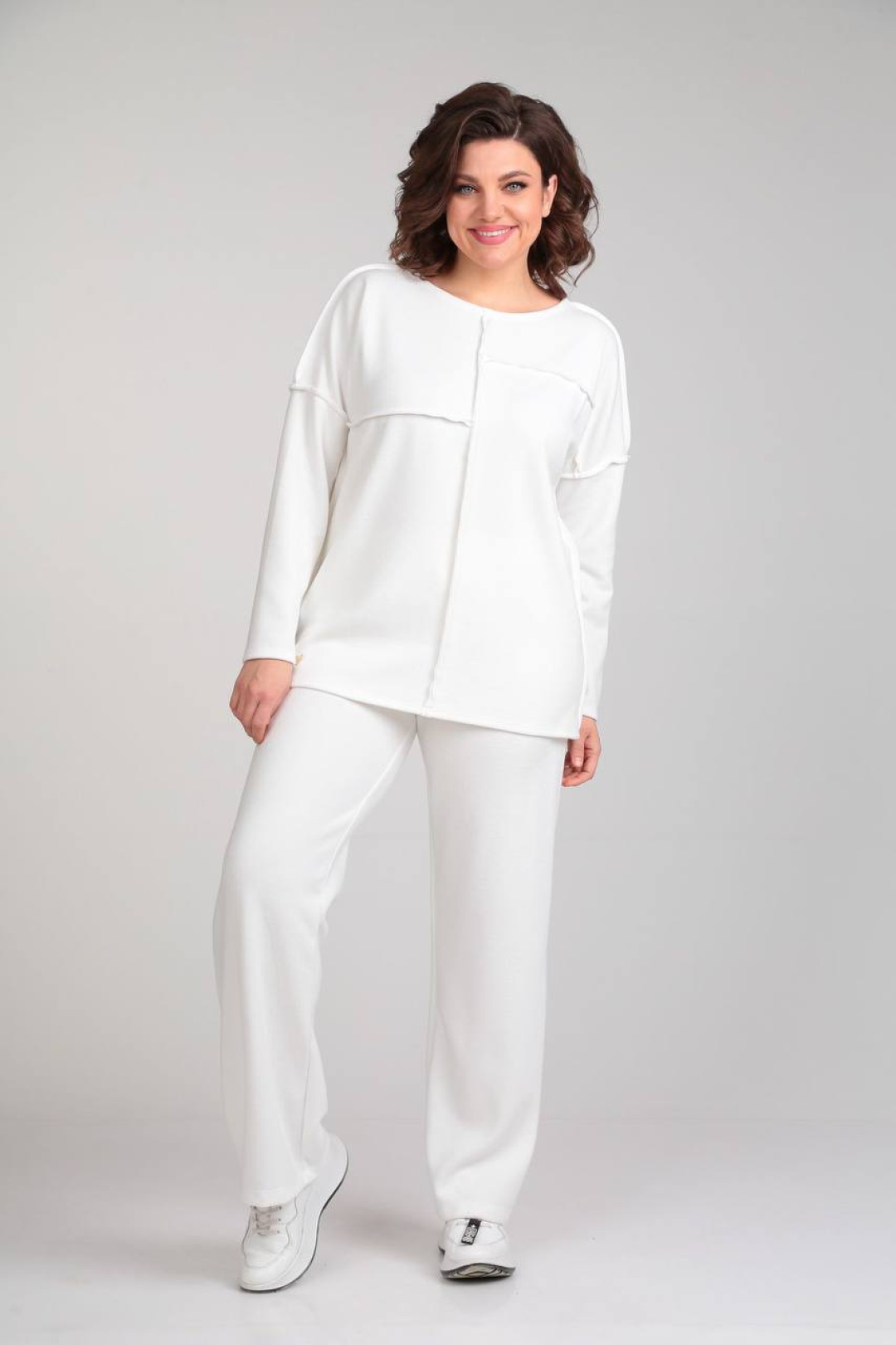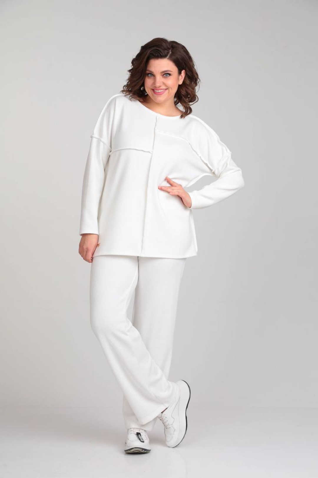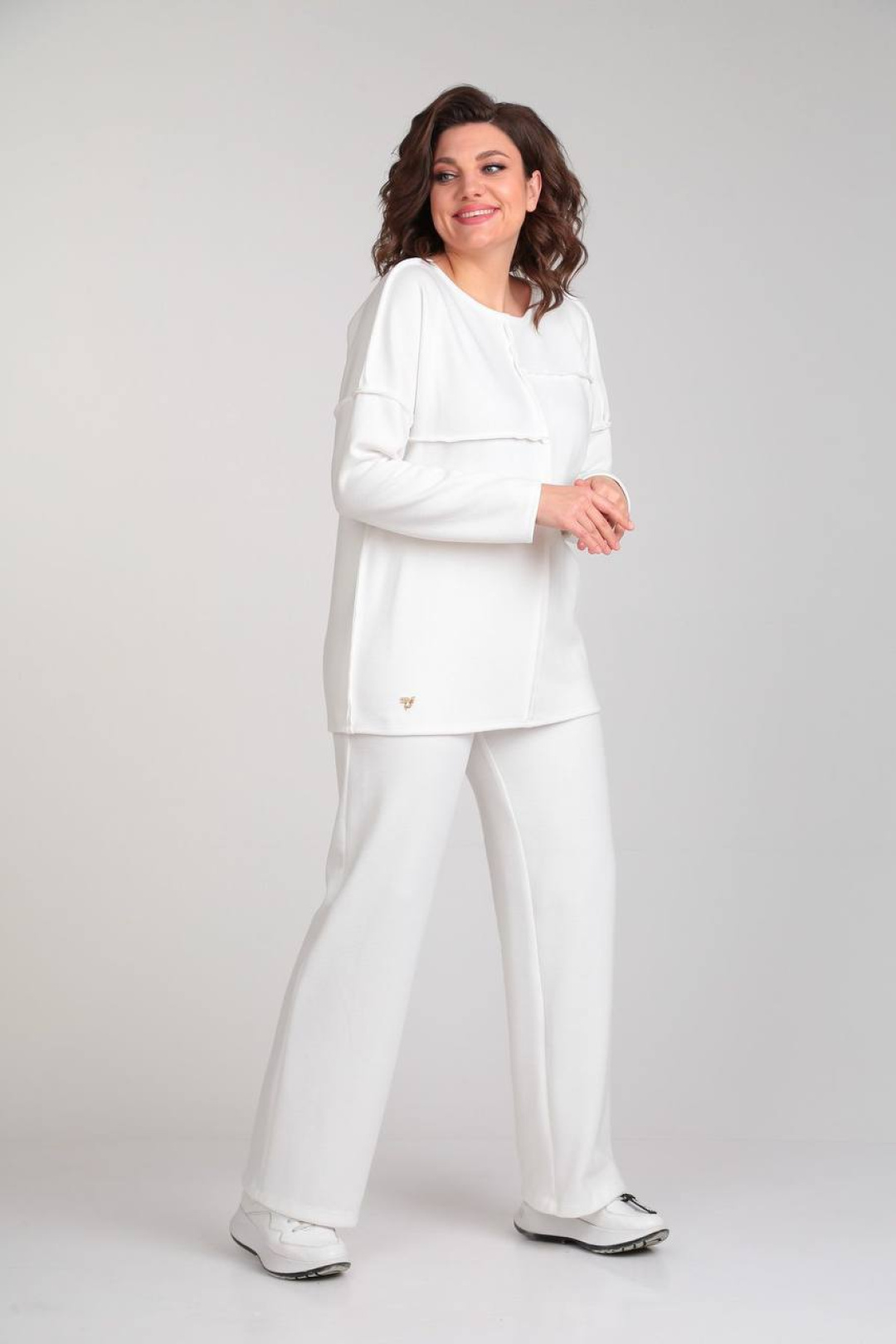 Комплект брючный : джемпер и брюки из трикотажного полотна. Джемпер с разрезными на 4 части передом и спинкой,швы обработаны припусками на лицо. Горловина округллой формы обработана распошивочным швом. Низ рукава и изделия тоже обработаны распошивочным швом. Брюки прямые. Цельнокроенный пояс на резинке.