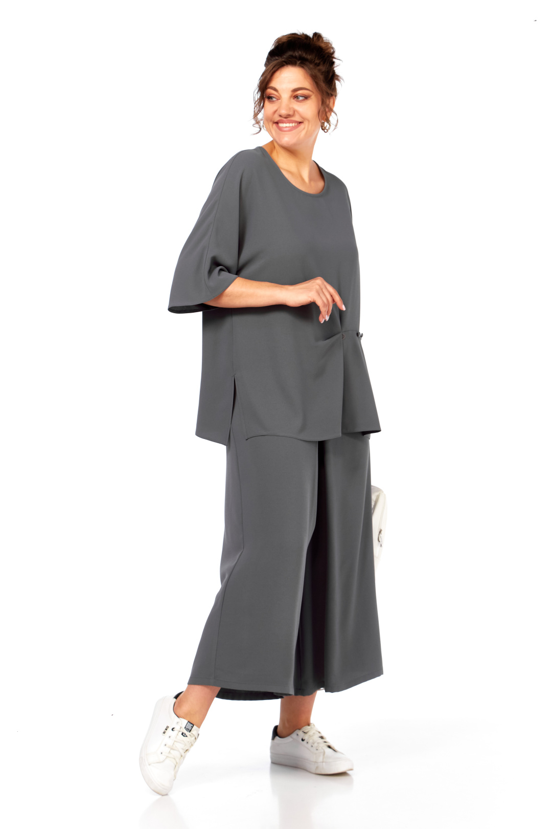 Комплект брючный состоит из блузы и кюлот. Блуза полуприлегающего силуэта с цельнокроенным рукавом. По боковым швамх разрезы, по переду застрочены вертикальные и горизонтальные складки в области талии (фиксируются навесной петлей и пуговицей). Кюлоты с центральной встречной складкой на передней половинке. Застежка-потайная тесьма-молния в боковом шве, верхний срез обработан поясом с резинкой. Имитация кармана в боковых швах. Длина по спинке 67 см, ширина плеча+длина рукава 43-45 см. Длина брюк 91 см.