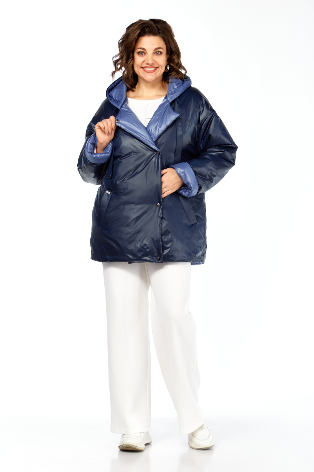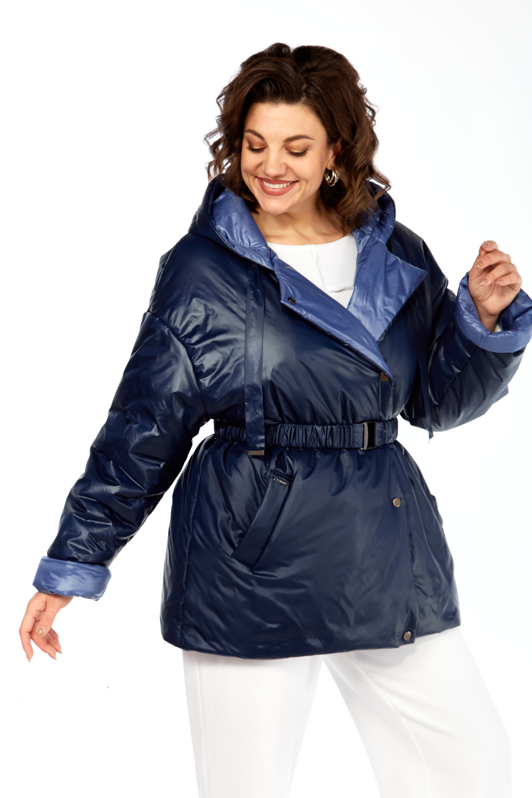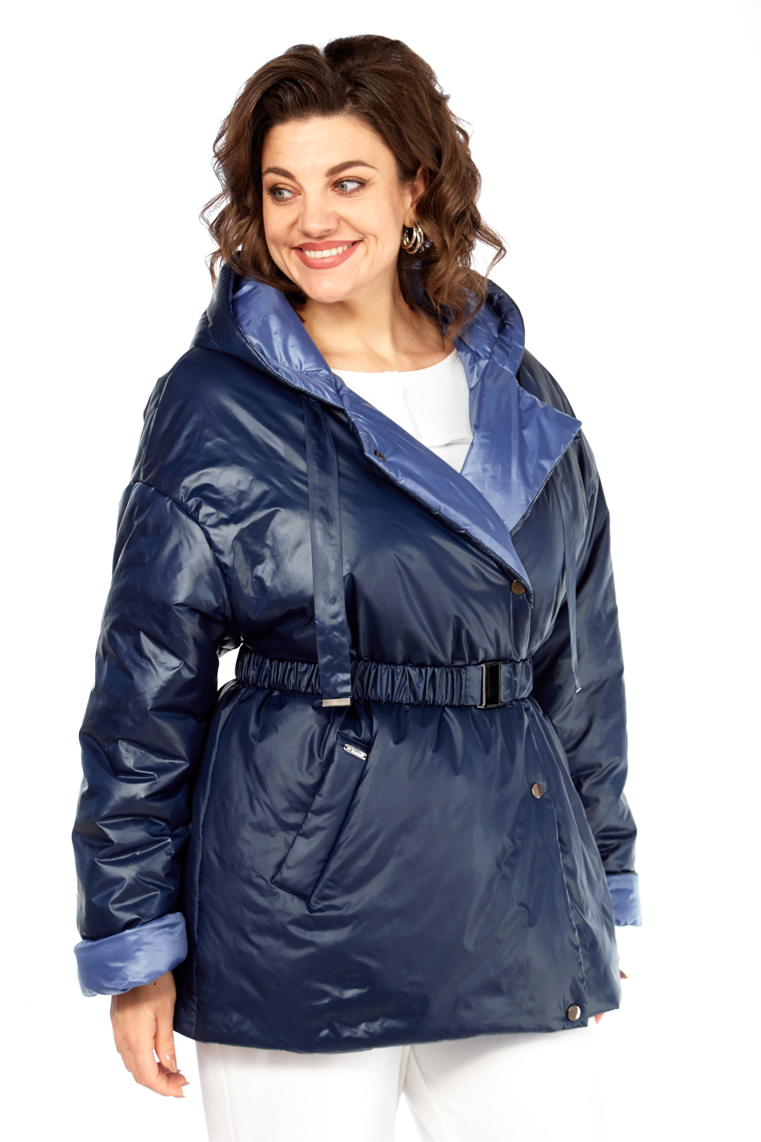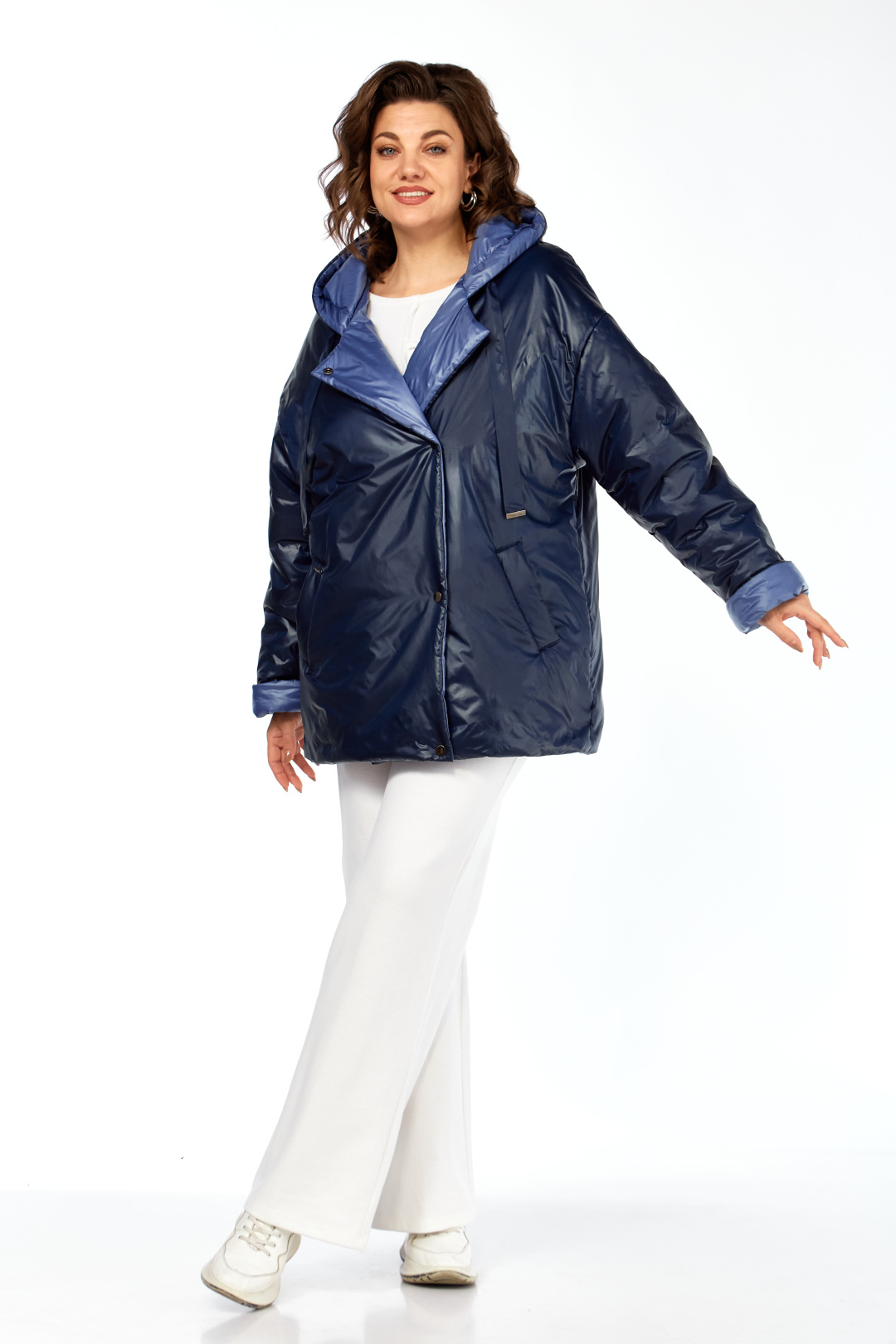 Куртка женская двухсторонняя с центральной бортовой застежкой на кнопки. Спинка простая. Перед с боковыми карманами с одной стороны "с листочкой", а внутренняя сторона с карманами в боковых швах. Рукав втачной одношовный со спущенной линией плеча. Воротник-капюшон с кулисой. Есть пояс на резинке с застежкой на пряжку. Куртка утепленная. Температурный режим до - 10 градусов. Фурнитура может отличаться от заявленной на фото. Длина по спинке 80 см, длина рукава 55 см.