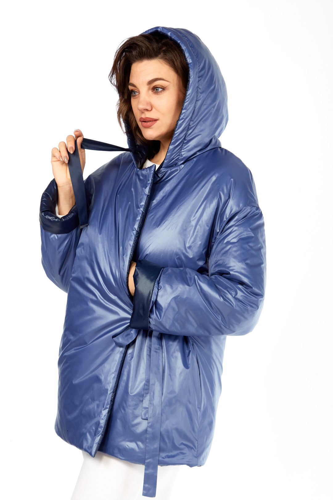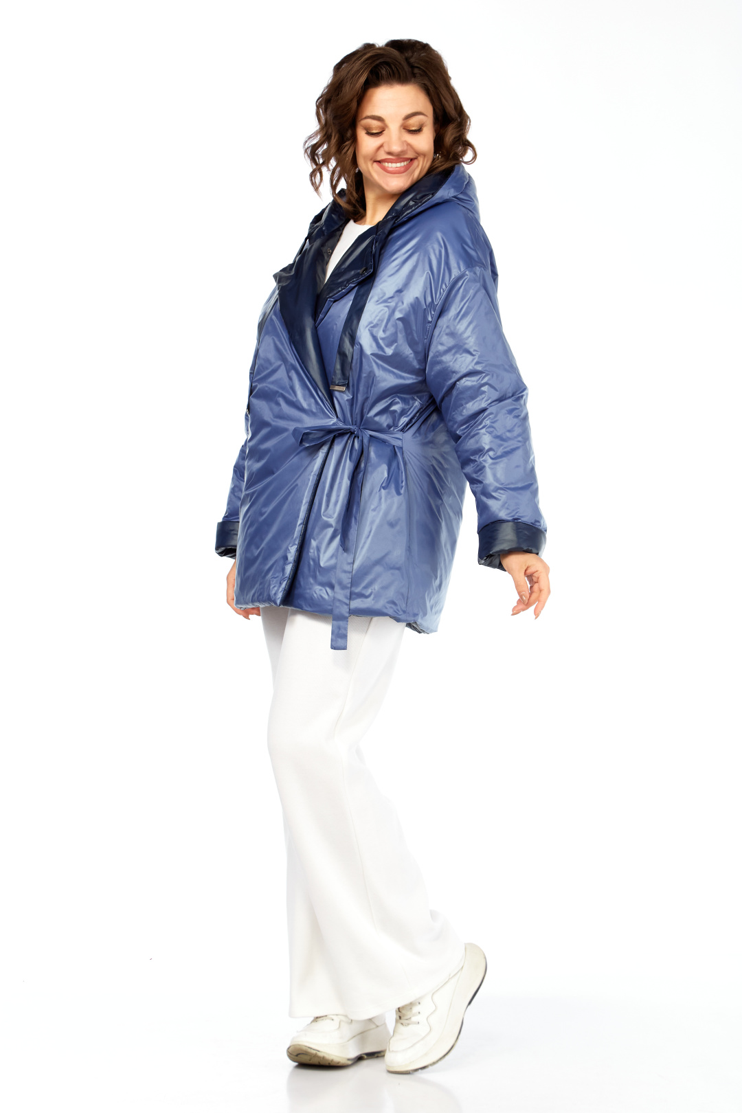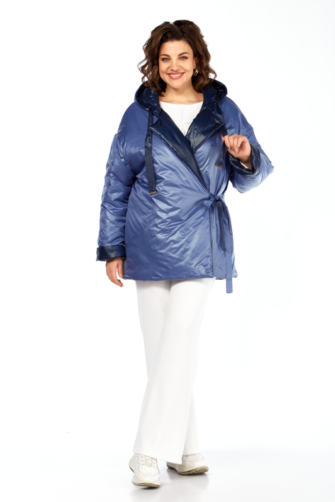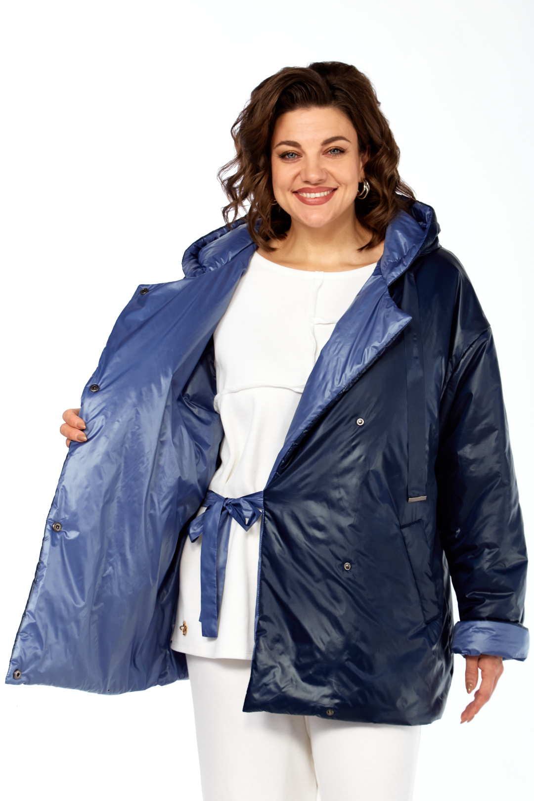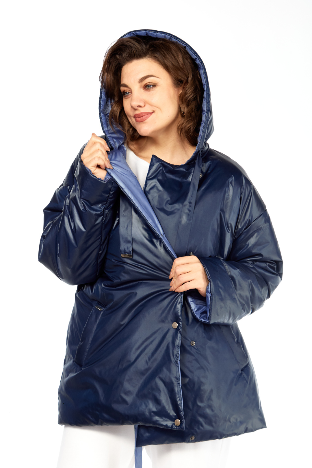 Куртка женская двухсторонняя с центральной бортовой застежкой на кнопки. Спинка простая. Перед с боковыми карманами с одной стороны "с листочкой", а внутренняя сторона с карманами в боковых швах. Рукав втачной одношовный со спущенной линией плеча. Воротник-капюшон с кулисой. Есть пояс на резинке с застежкой на пряжку. Куртка утепленная. Температурный режим до - 10 градусов. Фурнитура может отличаться от заявленной на фото. Длина по спинке 80 см, длина рукава 55 см.