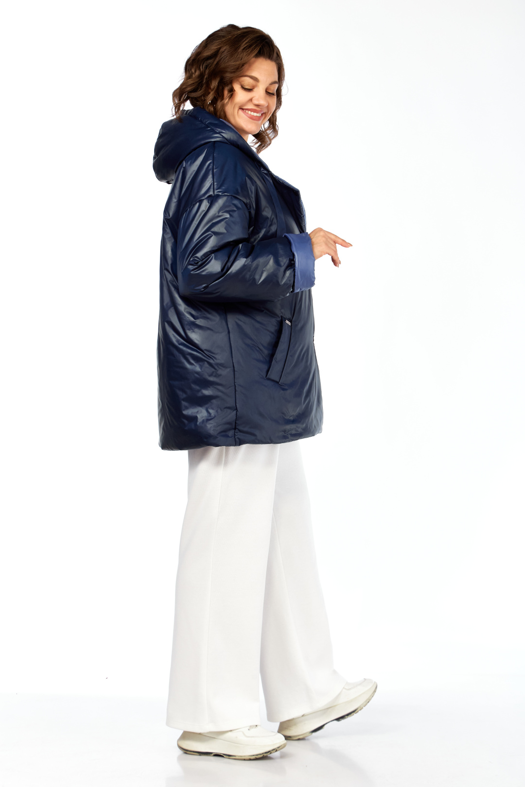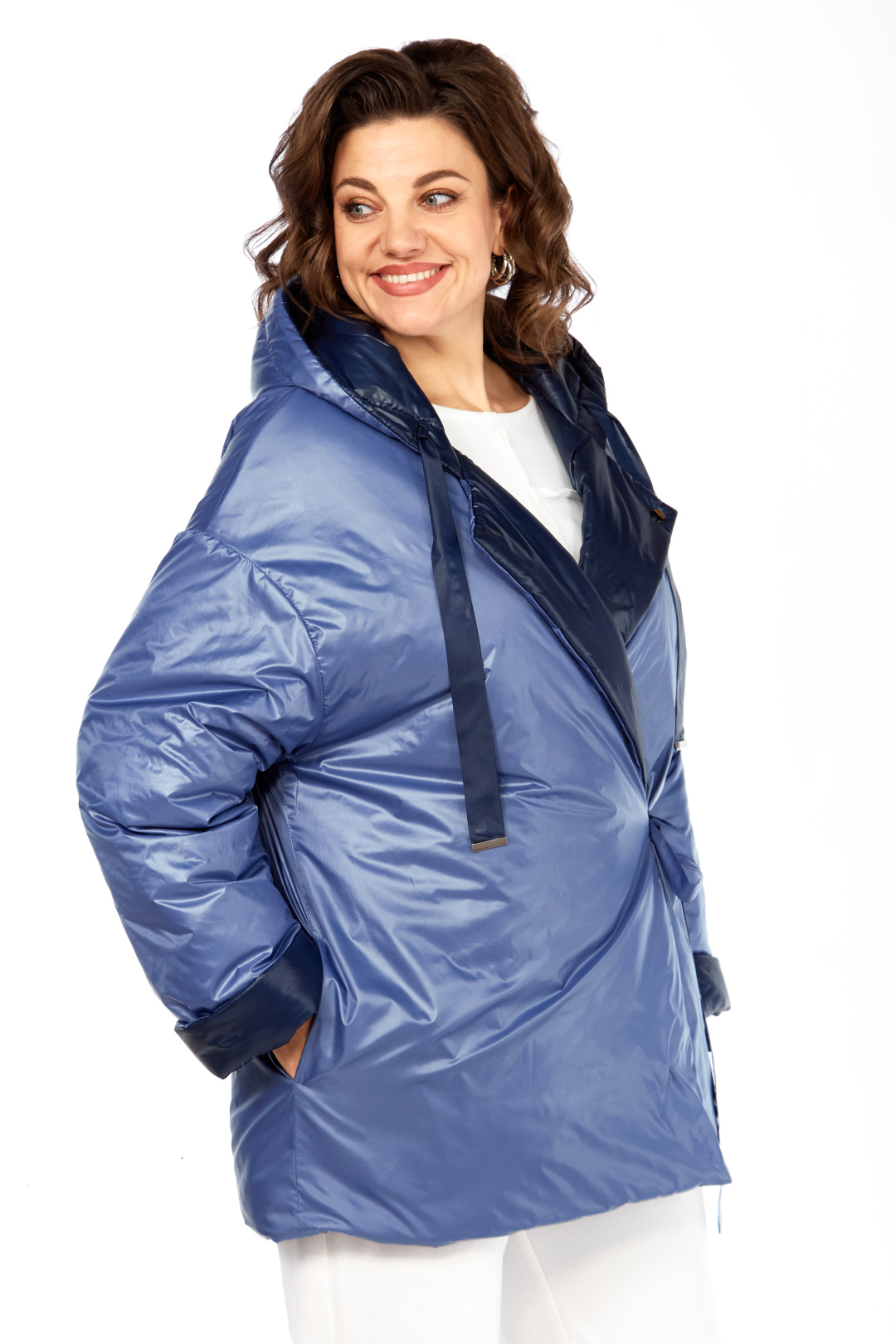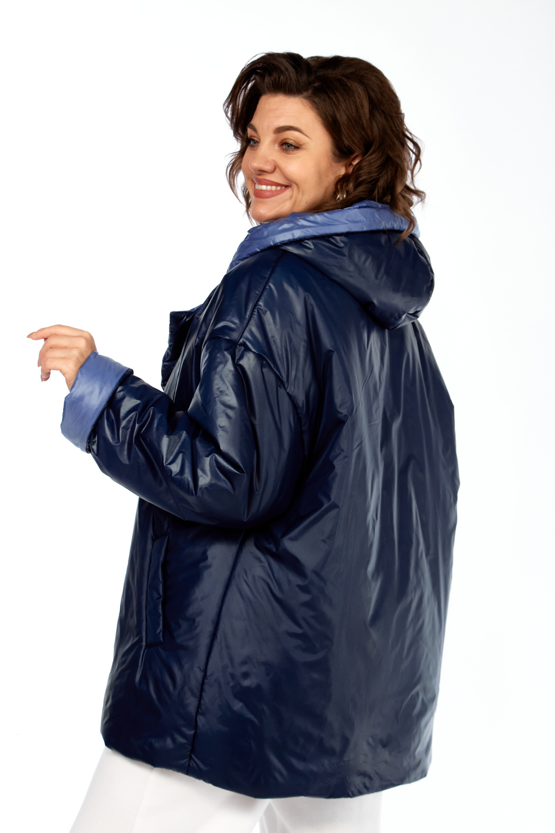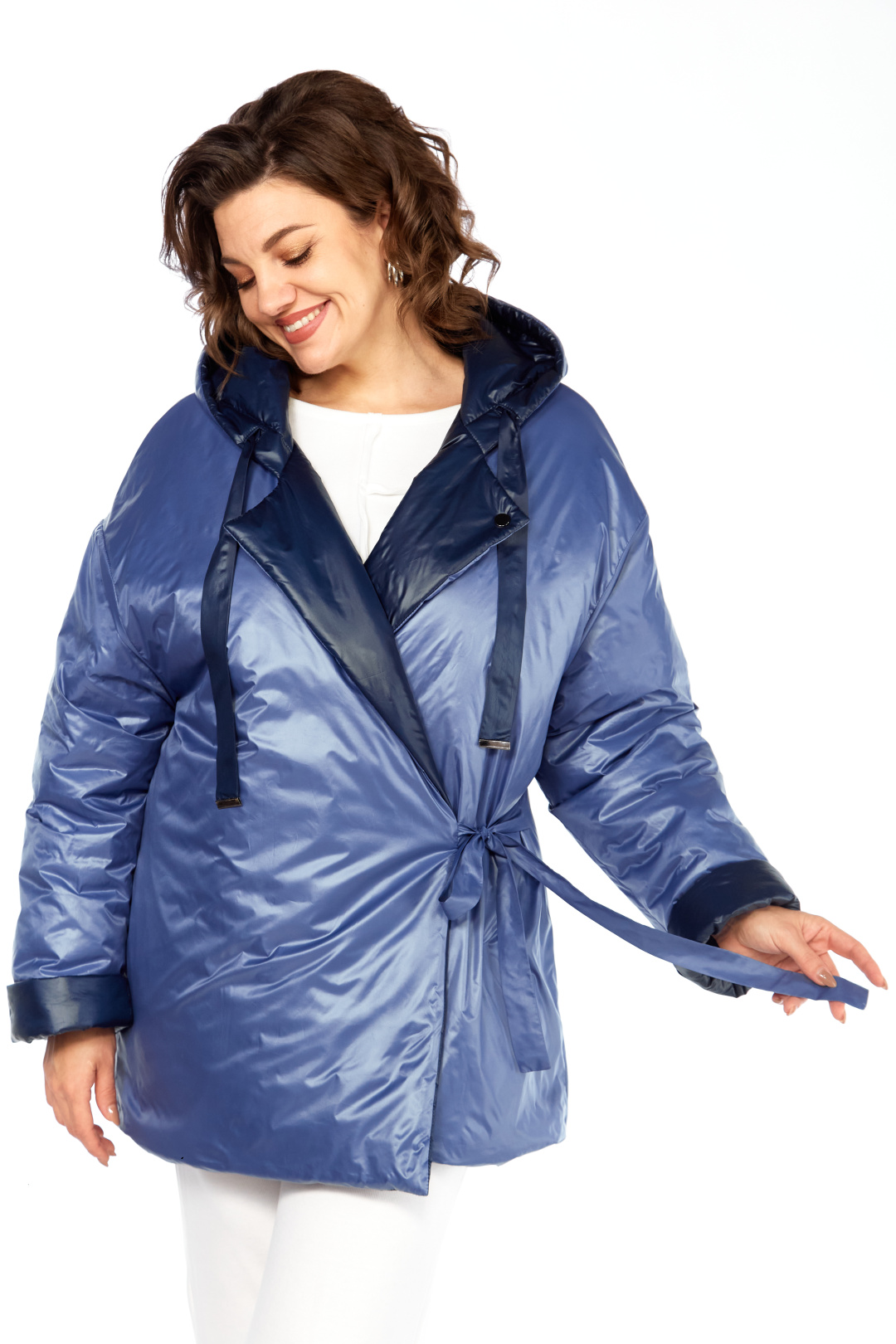 Куртка женская двухсторонняя с центральной бортовой застежкой на кнопки. Спинка простая. Перед с боковыми карманами с одной стороны "с листочкой", а внутренняя сторона с карманами в боковых швах. Рукав втачной одношовный со спущенной линией плеча. Воротник-капюшон с кулисой. Есть пояс на резинке с застежкой на пряжку. Куртка утепленная. Температурный режим до - 10 градусов. Фурнитура может отличаться от заявленной на фото. Длина по спинке 80 см, длина рукава 55 см.
