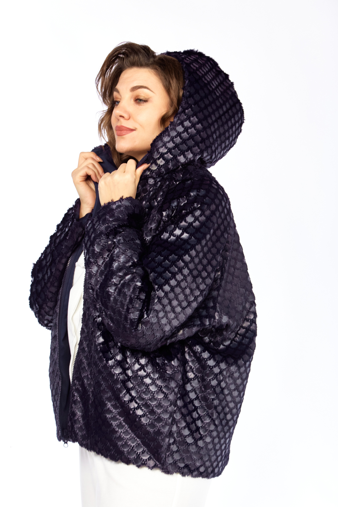 Куртка женская, О-образного силуэта с центральной застежкой на молнию. Спинка простая. Перед с боковыми карманами "с листочкой". Рукав-реглан . Воротник-капюшон. По низу куртки в подкладке обработана кулиса со шнуром и регулятором. Температурный режим до 0 градусов. Длина по спинке 69 см, длина рукава+ширина плеча 77 см.