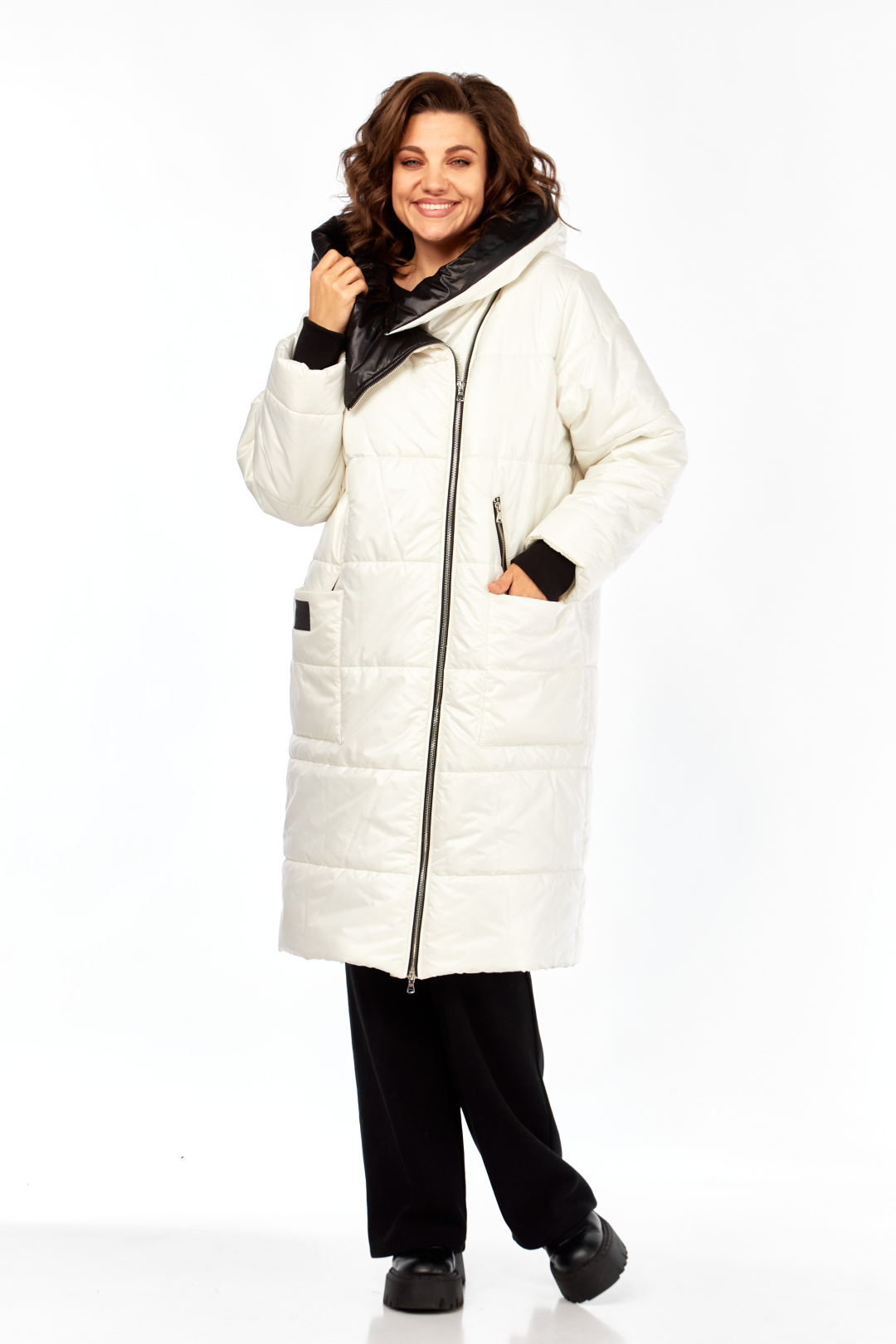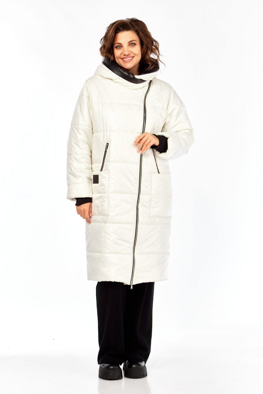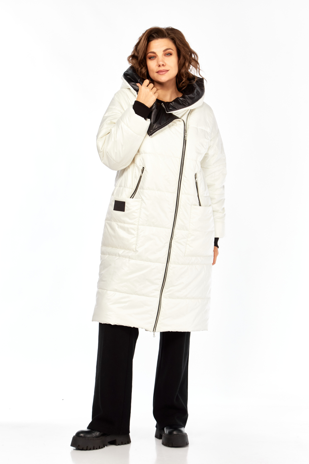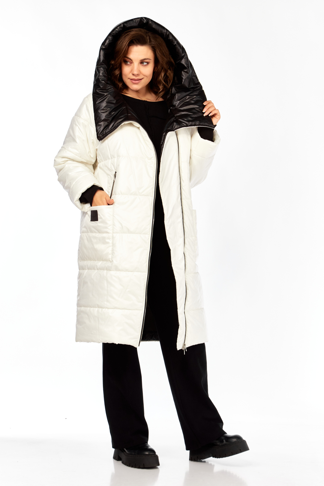 Пальто женское утепленное свободного кроя с ассиметричной застежкой на "молнию". Перед с прорезными карманами с "молнией" и накладными карманами. Правый накладной карман с отделочной нашивкой. Рукав втачной одношовный с трикотажным манжетом выходящим из-под подгибки. Объмный капюшон выполнен из 2-ух видов ткани. Утеплитель Hoopon 200, температурный режим до -10 градусов. Длина по спинке 107, длина рукава 61+5 см.