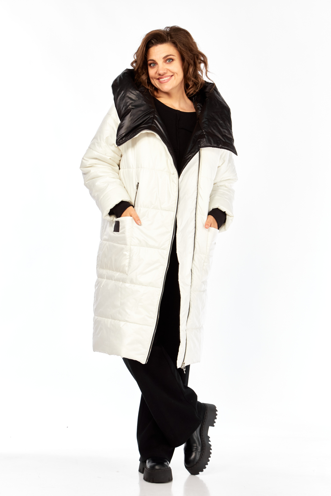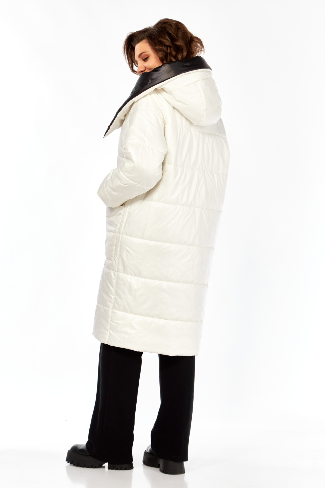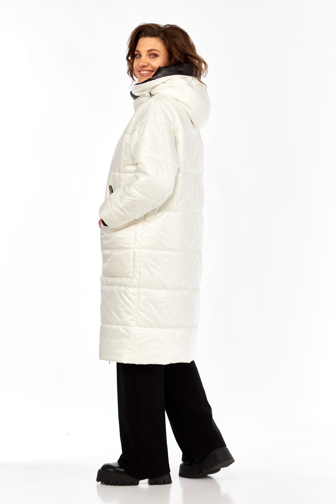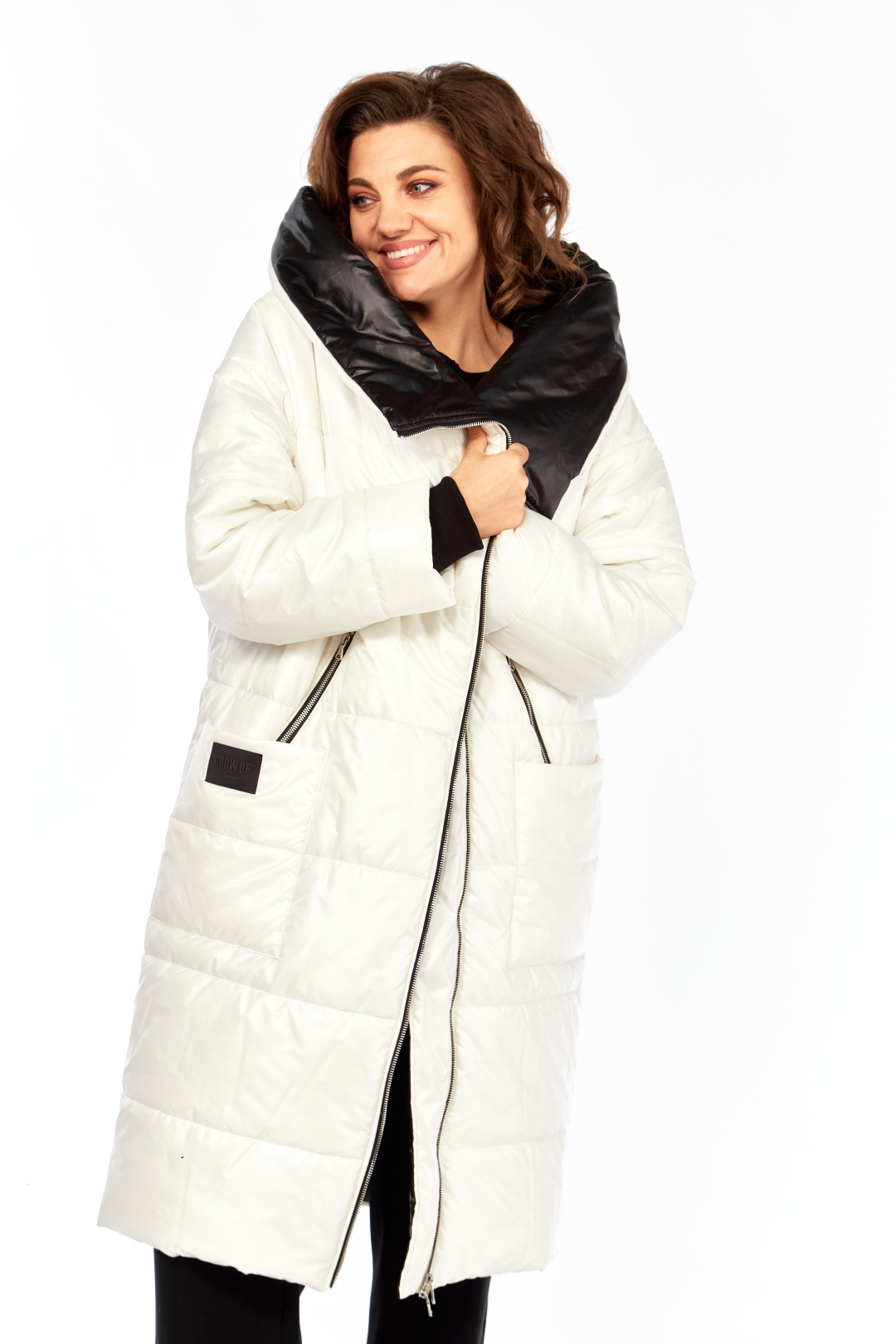 Пальто женское утепленное свободного кроя с ассиметричной застежкой на "молнию". Перед с прорезными карманами с "молнией" и накладными карманами. Правый накладной карман с отделочной нашивкой. Рукав втачной одношовный с трикотажным манжетом выходящим из-под подгибки. Объмный капюшон выполнен из 2-ух видов ткани. Утеплитель Hoopon 200, температурный режим до -10 градусов. Длина по спинке 107, длина рукава 61+5 см.
