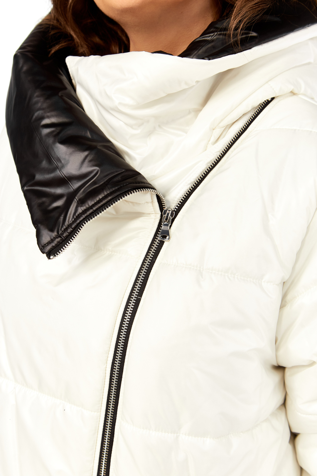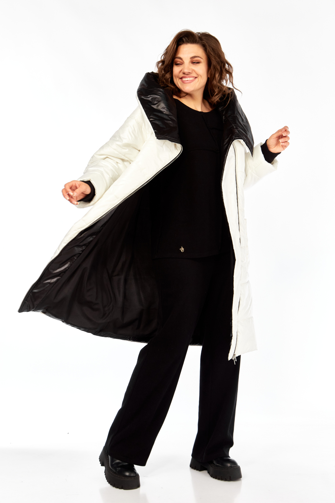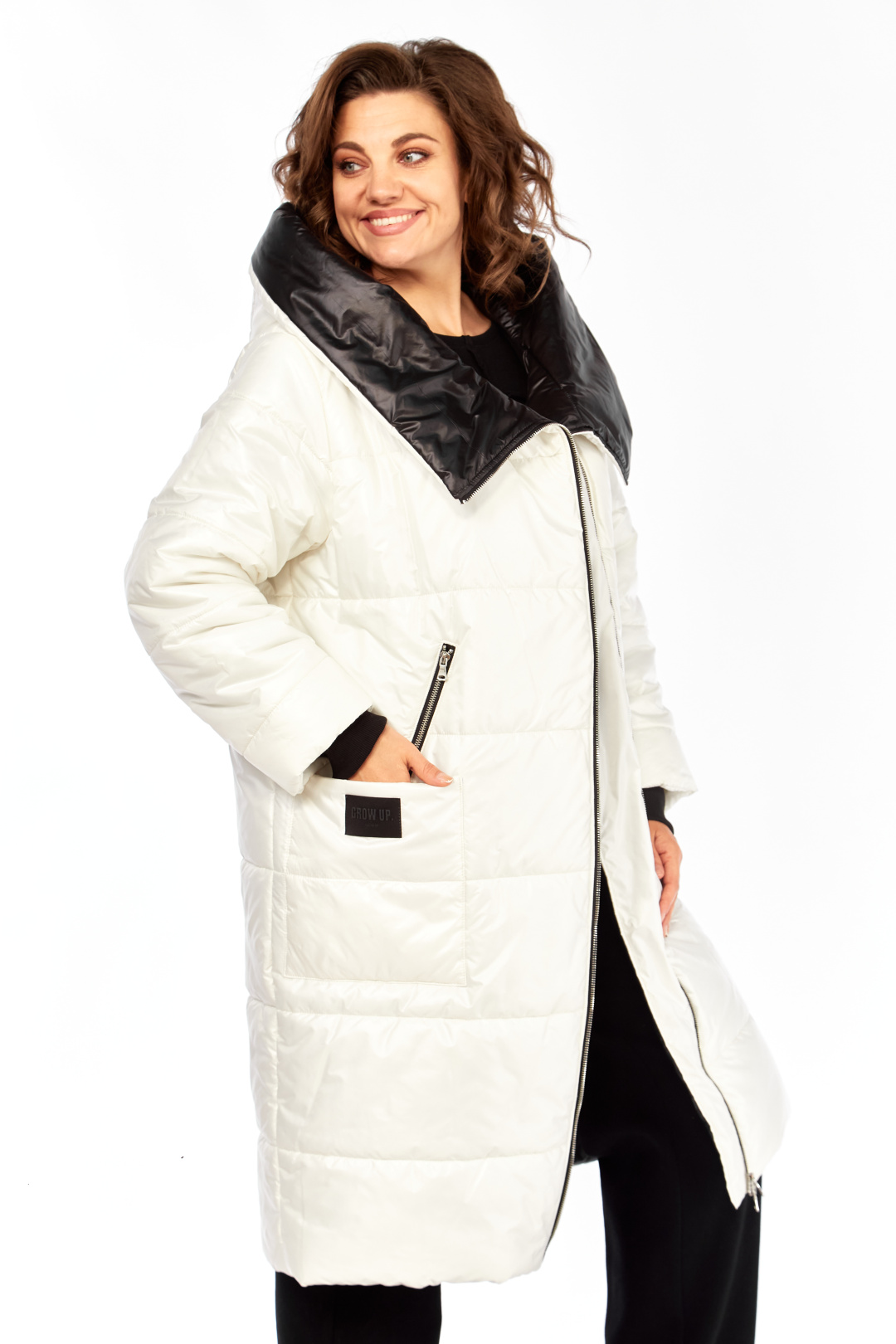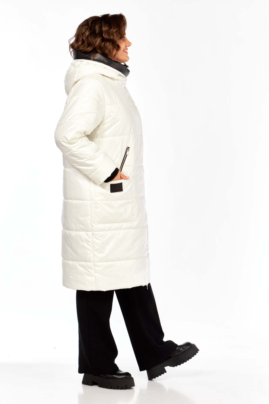 Пальто женское утепленное свободного кроя с ассиметричной застежкой на "молнию". Перед с прорезными карманами с "молнией" и накладными карманами. Правый накладной карман с отделочной нашивкой. Рукав втачной одношовный с трикотажным манжетом выходящим из-под подгибки. Объмный капюшон выполнен из 2-ух видов ткани. Утеплитель Hoopon 200, температурный режим до -10 градусов. Длина по спинке 107, длина рукава 61+5 см.