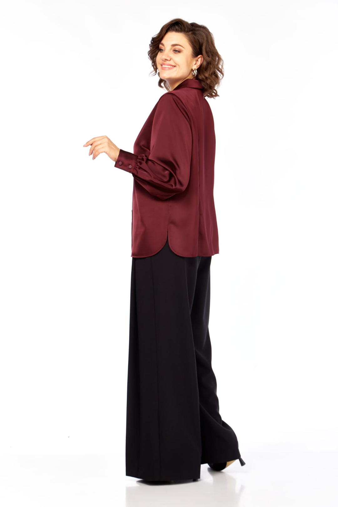 Комплект женский брючный 2-х предметный. Прекрасный вариант для визитов в офис, а так же в место, где уместен деловой стиль. Модель полуприлегающего силуэта с застежкой спереди на пуговицы. Воротник аккуратный отложной. Рукав втачной, по низу оформлен складками и притачной манжетой, застегивающейся на пуговицы. В боковых швах скругленные разрезы. Спинка с вертикальными выточками. Невероятно комфортные, элегантные брюки-палаццо, образ в котором будет привлекать к себе внимание окружающих. Идеально подходит как для офиса, так и для вечернего выхода. Брюки свободные. По переду заложены складки, в боковых швах расположены боковые карманы, застежка-молния. Пояс притачной, сзади на резинке, это обеспечивает комфортную посадку. Широкий крой палаццо добавляет образу легкость и непринужденность, стрелки визуально удлиняют силуэт.