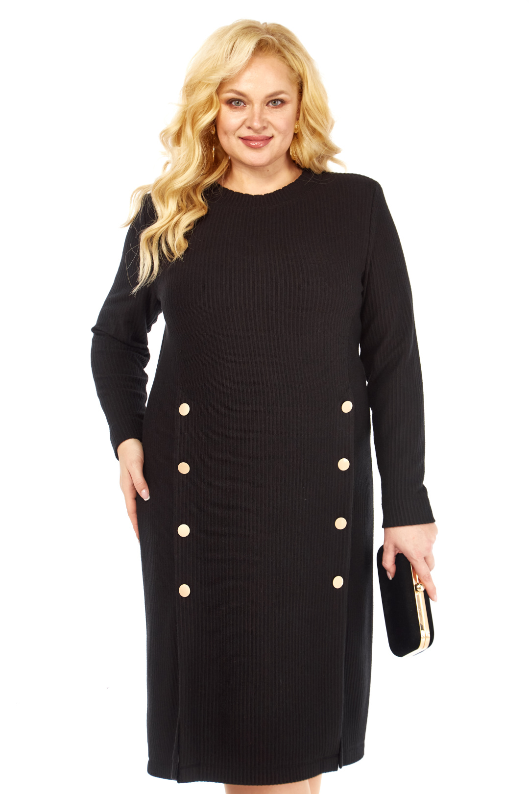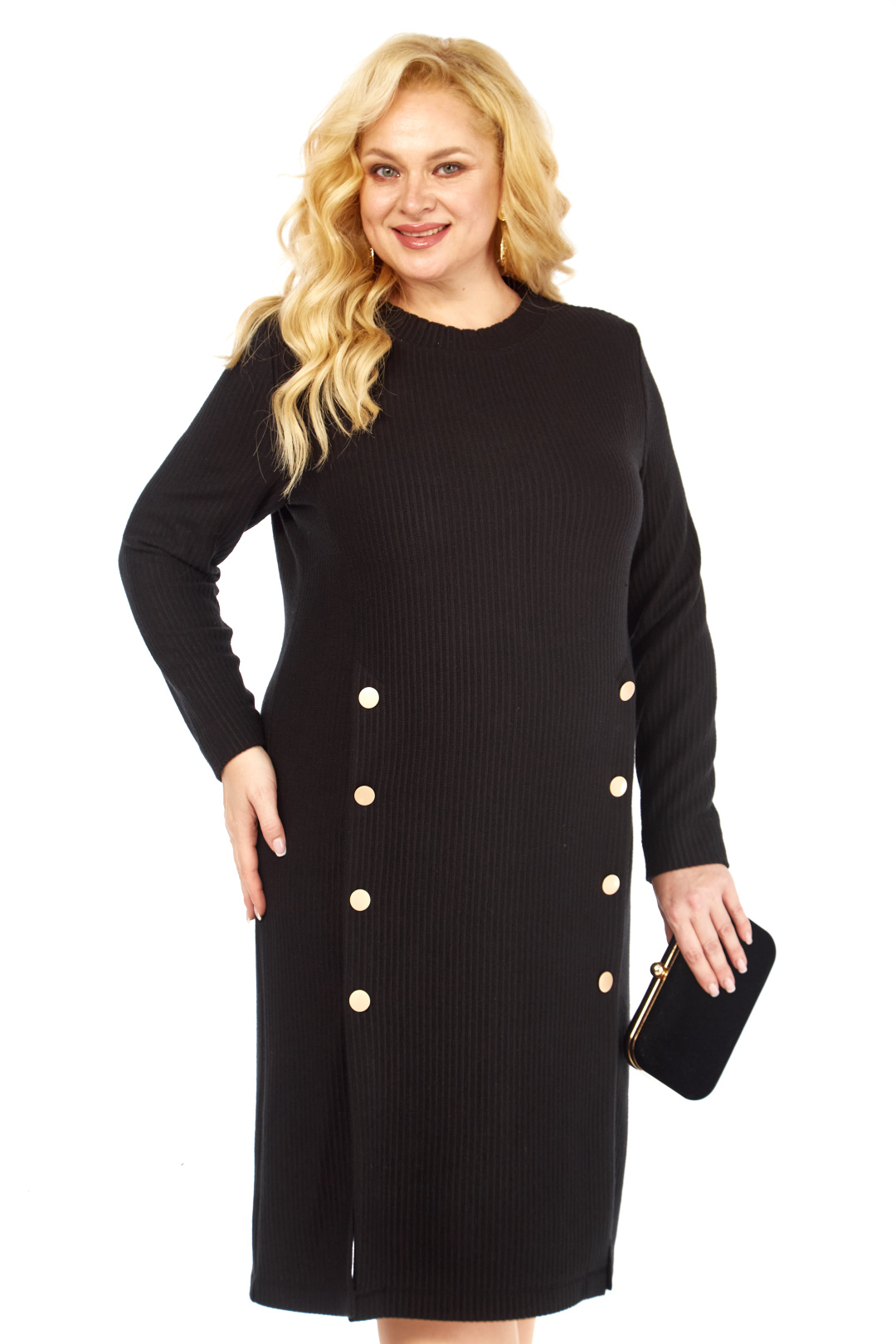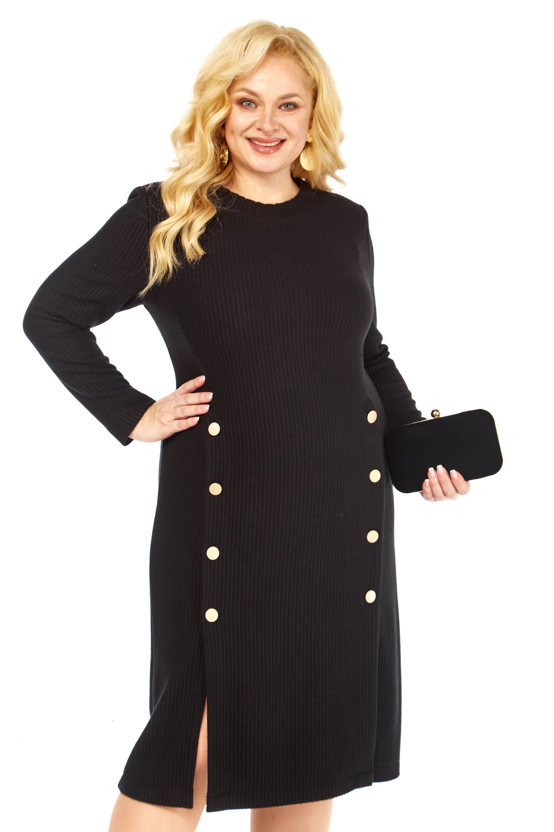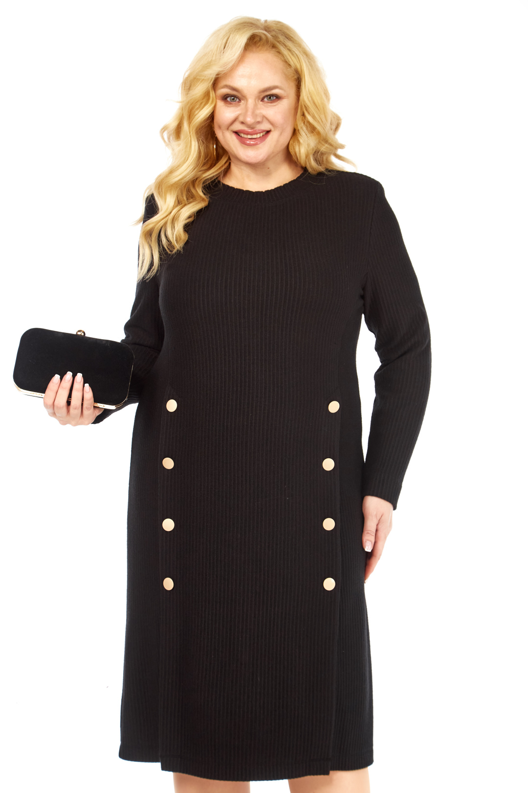 Стильное платье полуприлегающего силуэта выполнено из трикотажной ткани, контрастные декоративные пуговицы визуально создают красивый акцент. Фасон интересен тем, что модельные линии, как нельзя лучше подчеркивают плавные изгибы женской фигуры. Вырез горловины классический овальный. Рукав втачной, полной длины.
