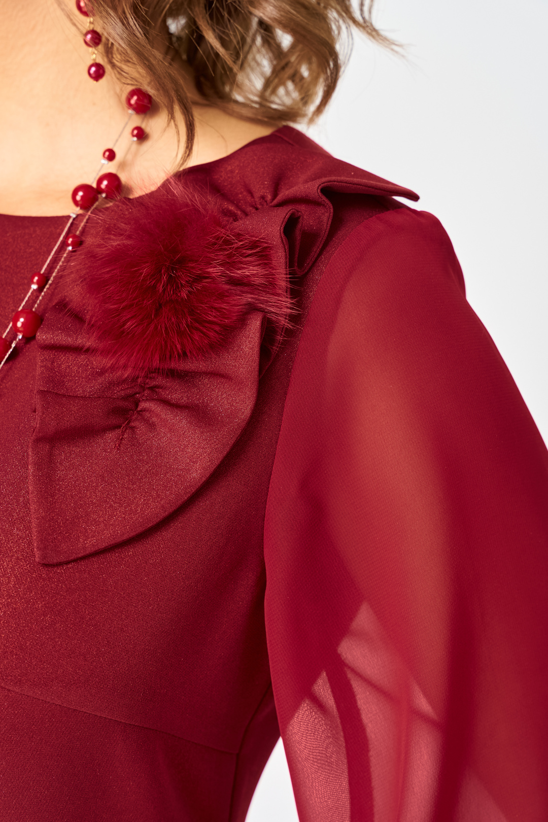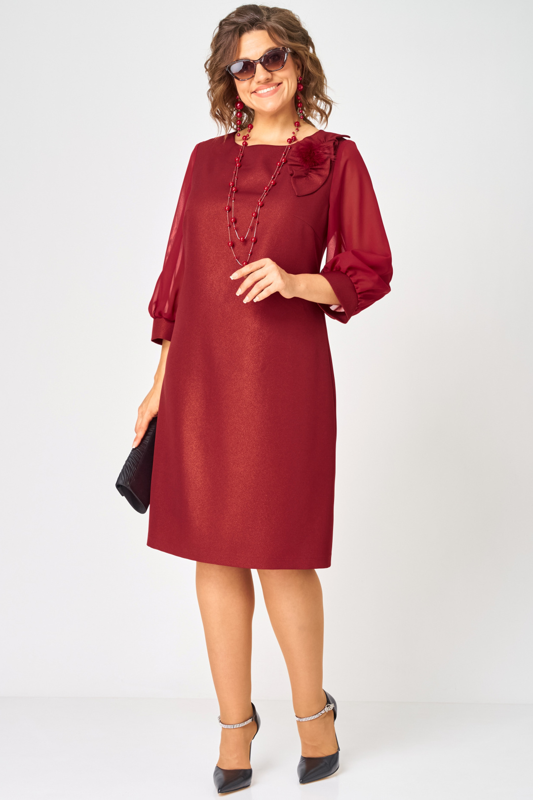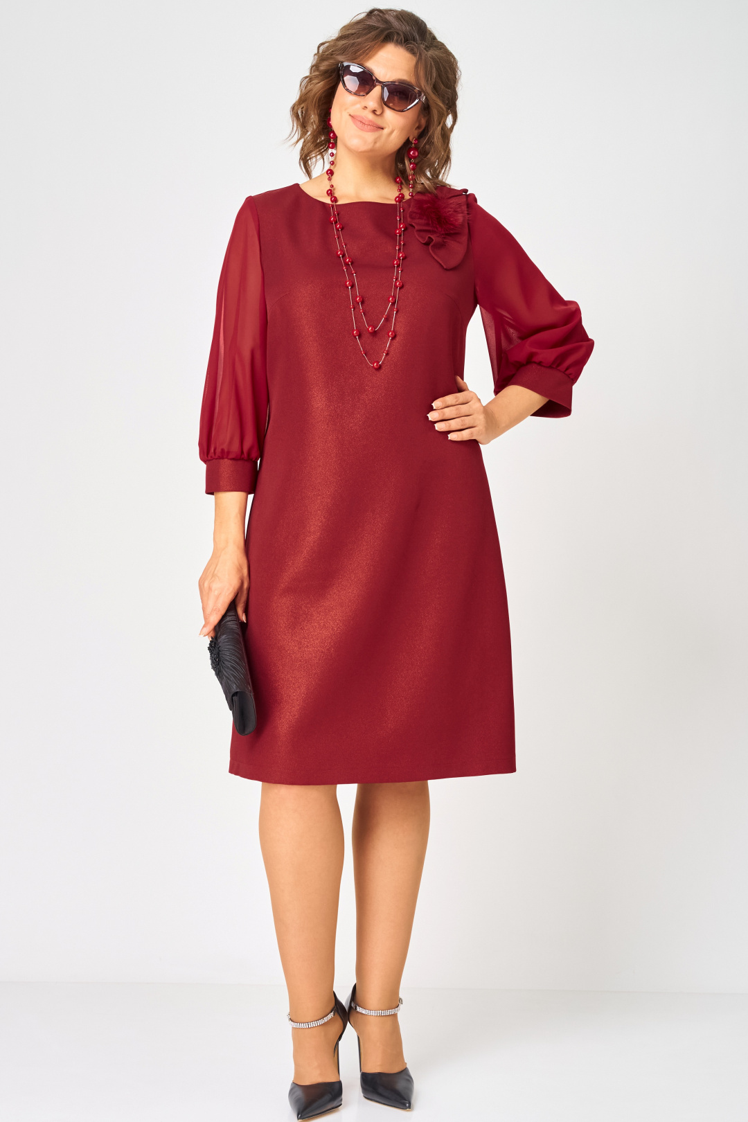 Платье женское полуприлегающего силуэта выполнено из плательной ткани с мерцающим пропитанным блеском (не сыпется) в сочетании с шифоном. Вырез горловины круглый на обтачке, по полочке нагрудные втачки, рукав втачной из шифона 7/8 по низу на сборке и притачной манжете. По спинке потайная тесьма - молния и вытачки.Декором платья служит декоративный пришивной элемент со съемной брошью.
