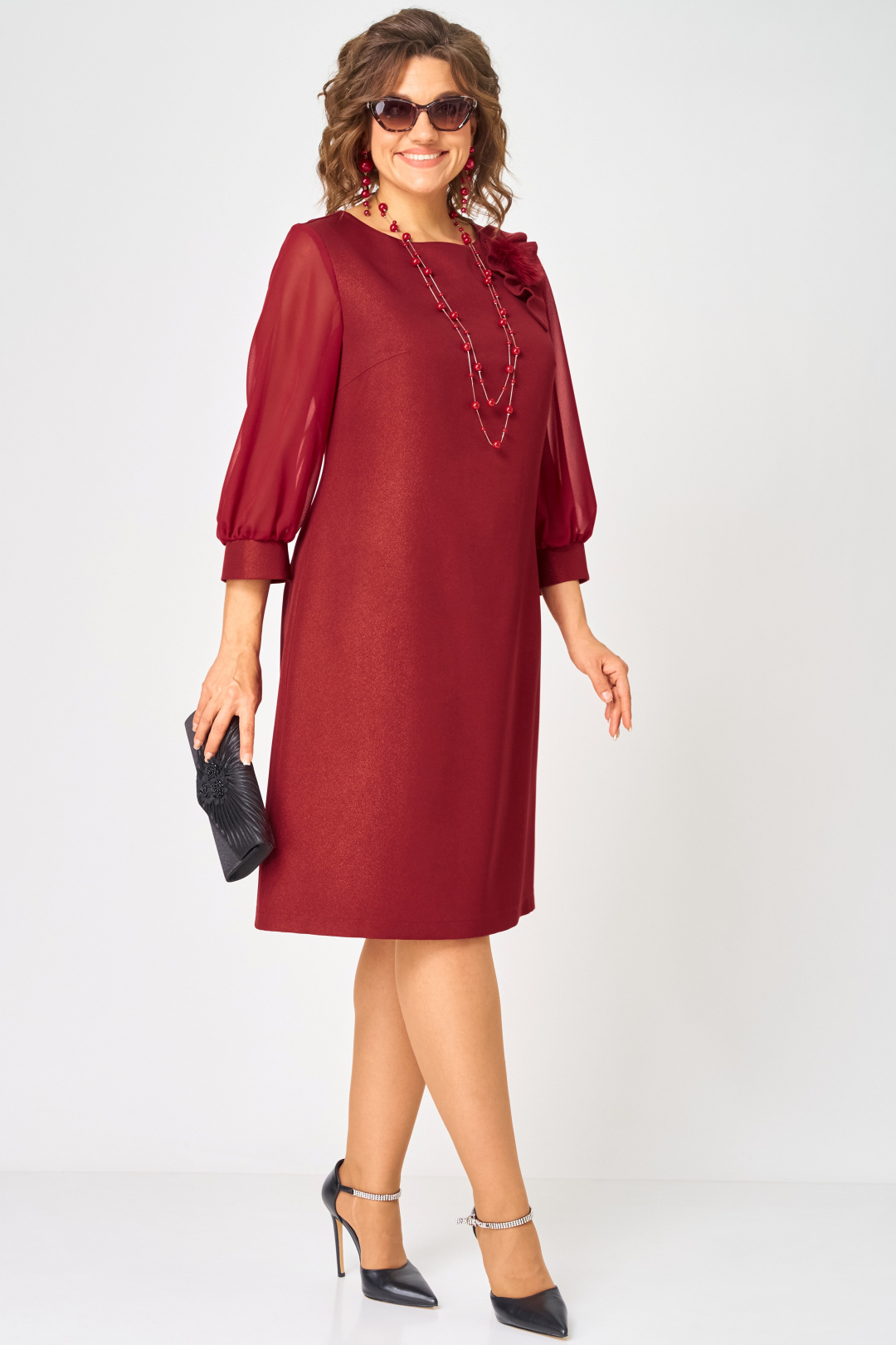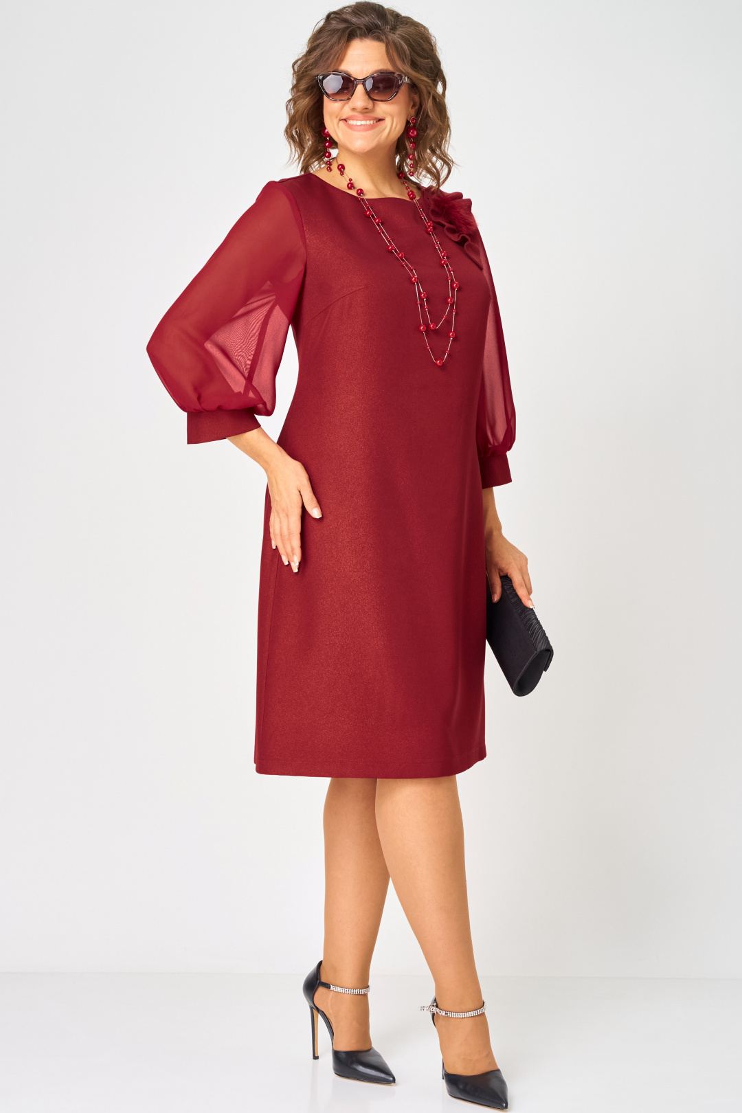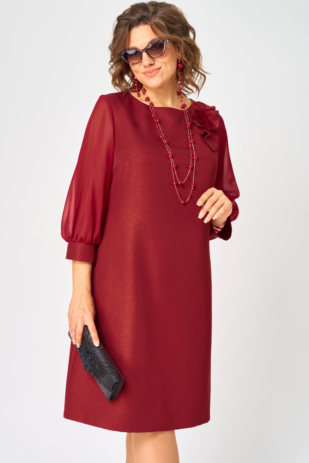Платье женское полуприлегающего силуэта выполнено из плательной ткани с мерцающим пропитанным блеском (не сыпется) в сочетании с шифоном. Вырез горловины круглый на обтачке, по полочке нагрудные втачки, рукав втачной из шифона 7/8 по низу на сборке и притачной манжете. По спинке потайная тесьма - молния и вытачки.Декором платья служит декоративный пришивной элемент со съемной брошью.