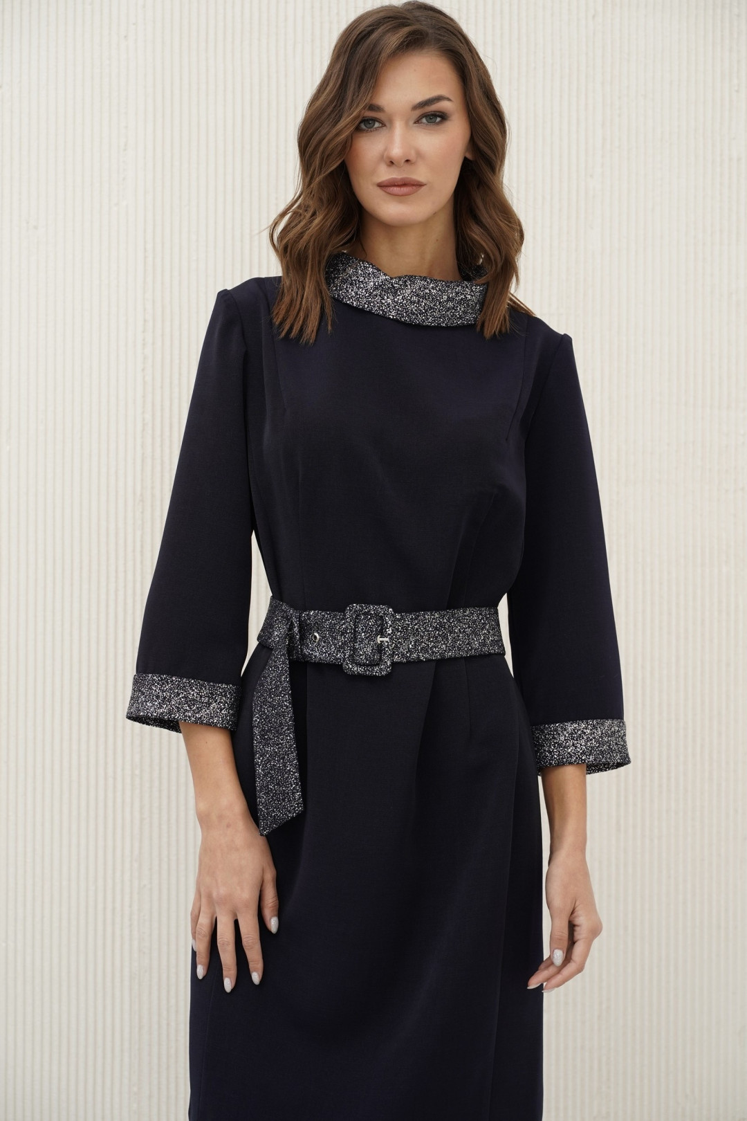 Платье дополняет съёмный пояс, застёгивающийся на пряжку, обтянутую отделочной тканью.