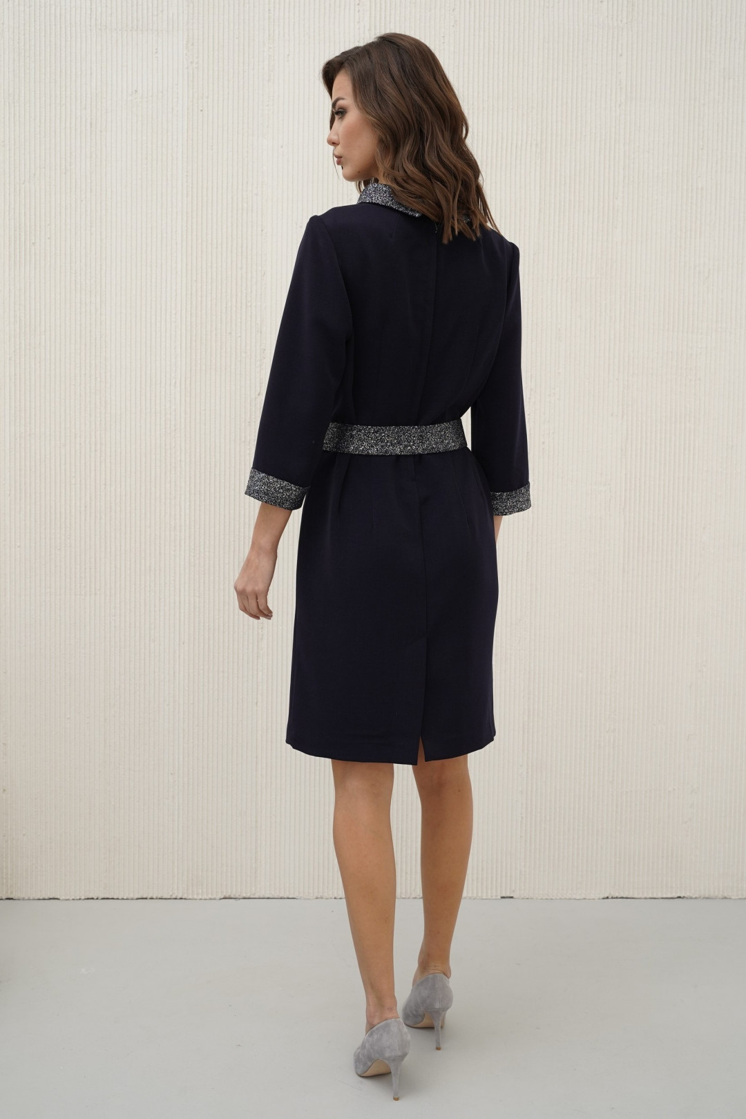Воротник, манжеты рукавов, съёмный пояс выполнены из отделочной ткани с серебристым напылением, имеющим деликатное мерцание.
