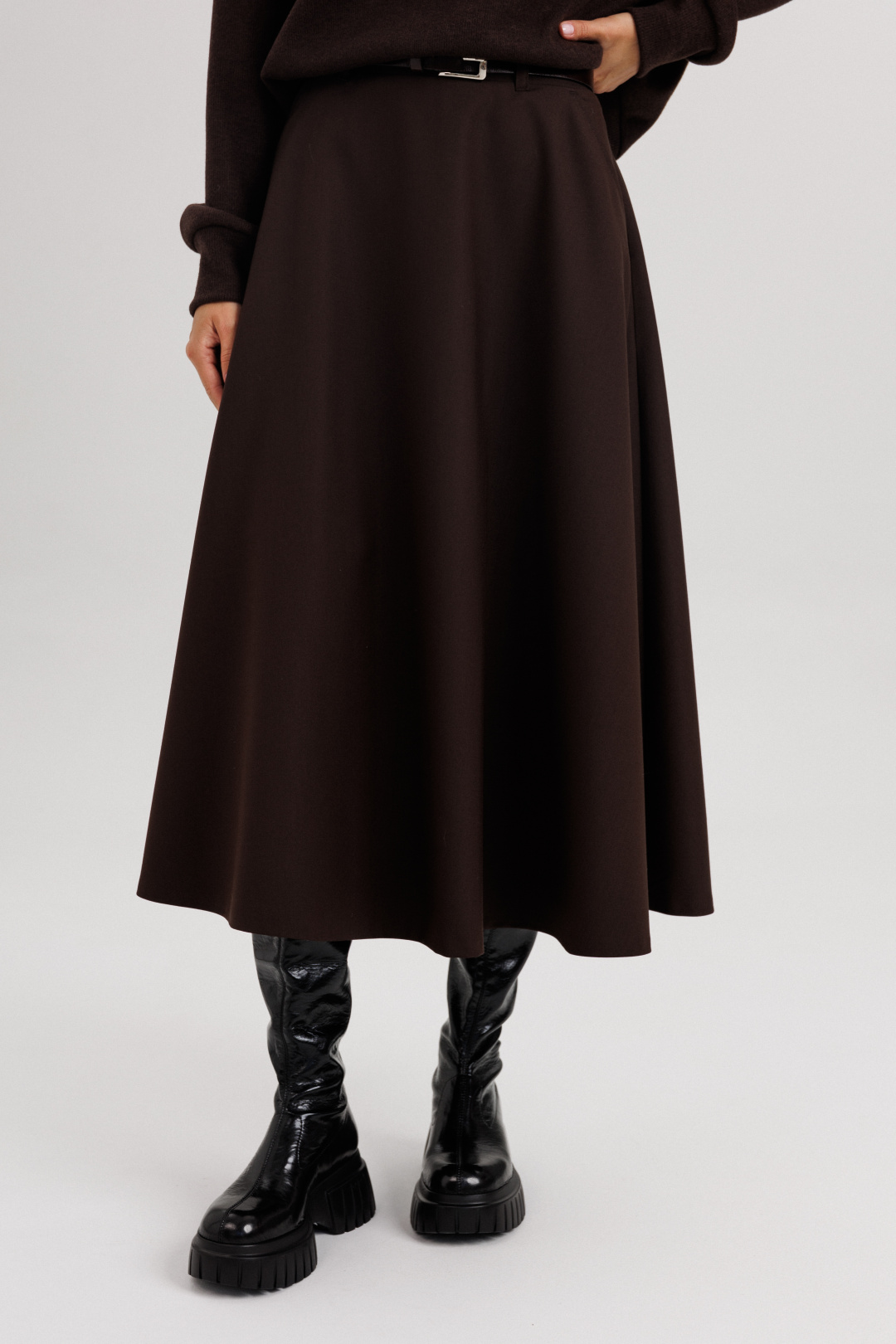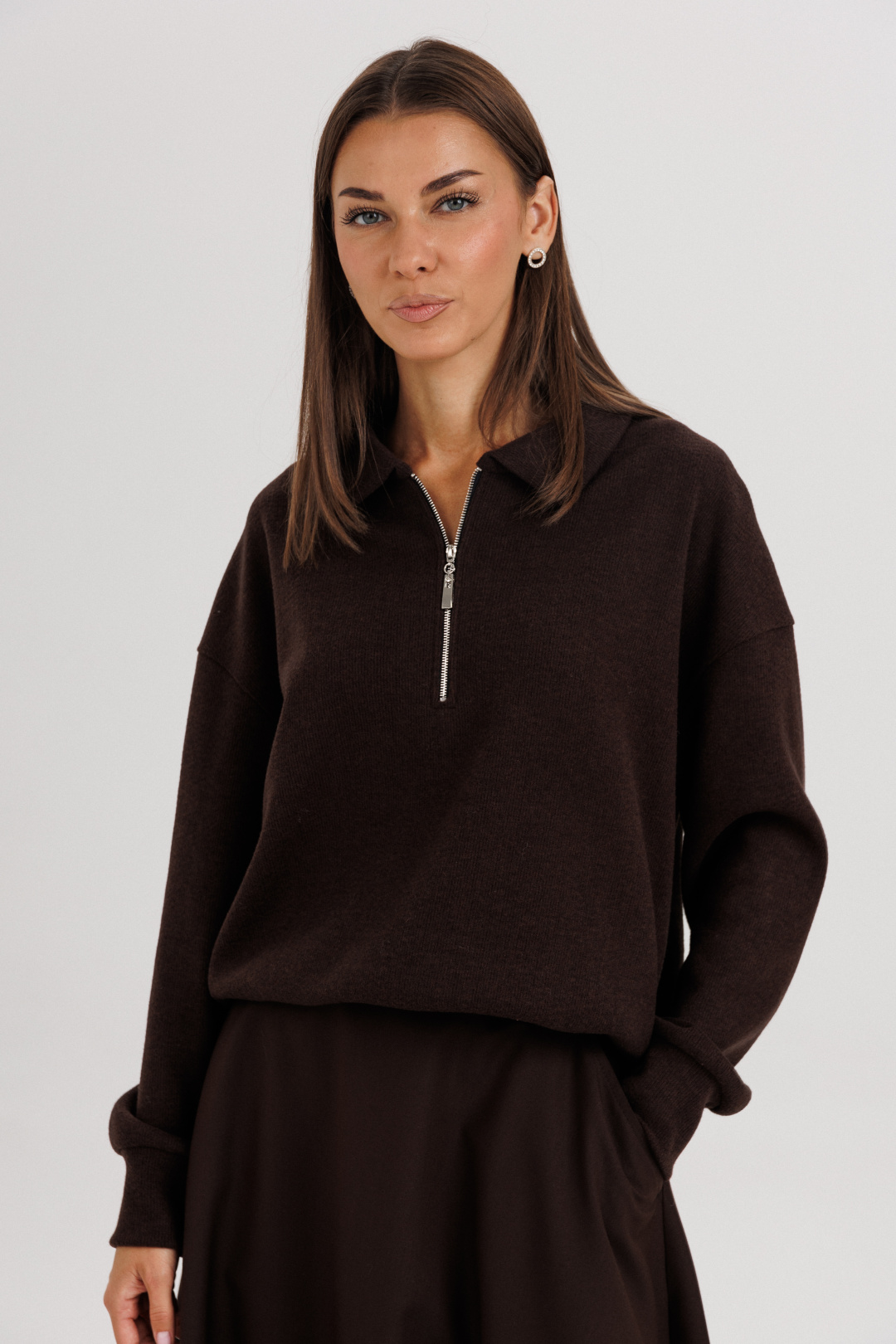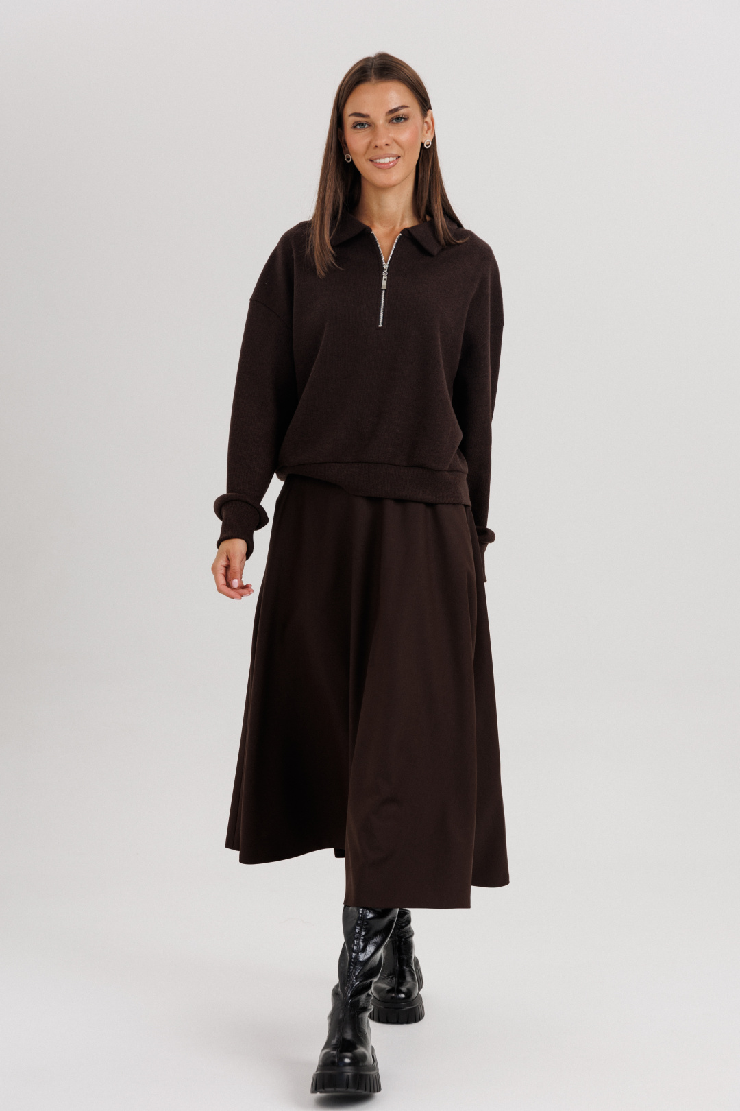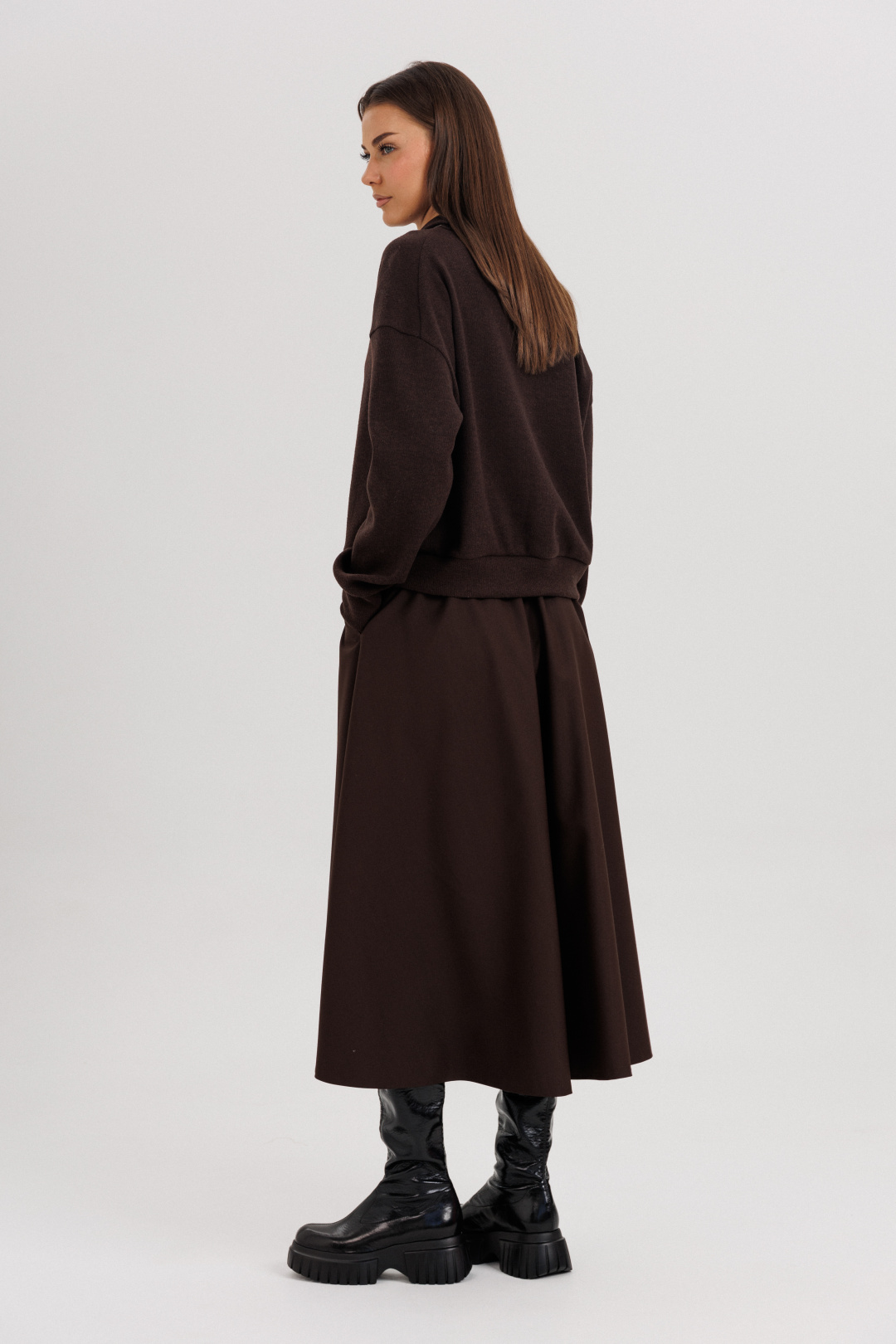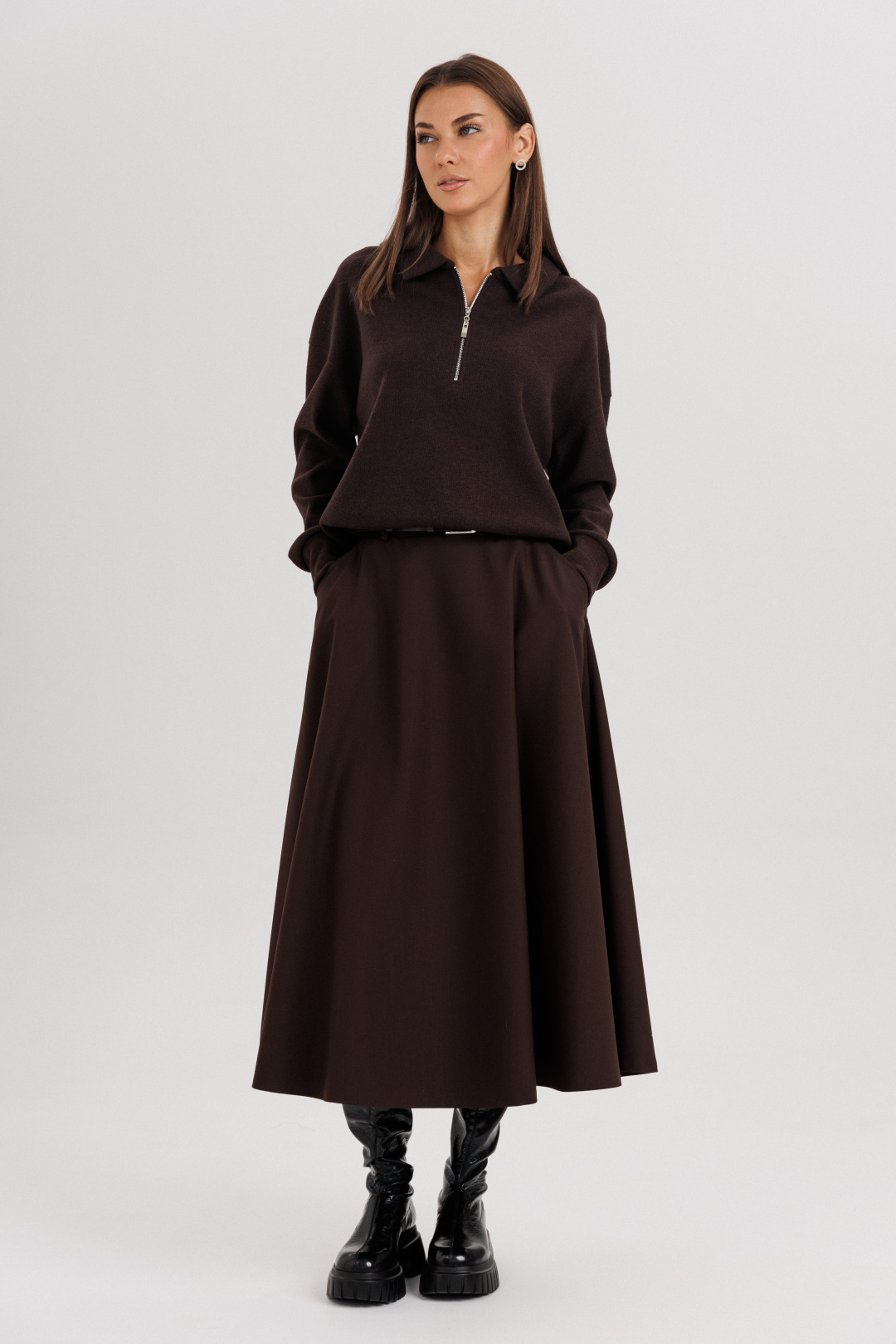 Джемпер из трикотажа. Это одна из базовых вещей осенне-зимнего сезона. Он тёплый, удобный и невероятно комфортный. К тому же, настолько универсален, что его можно стилизовать абсолютно разными способами. Свободный покрой с заниженной линией плеча, рукав рубашечного покроя на отрезной манжете, воротник классический, по центру полочки частичная застёжка-молния. По низу джемпера - отрезной пояс. Юбка коническая, длины миди на притачном поясе, частично эластичном в области спинки. По боковым швам - наклонные карманы, застёжка по центру заднего полотнища на тесьму-молнию и петлю пуговицу. Поя в комплект не вхолит. Длина юбки около 72 см