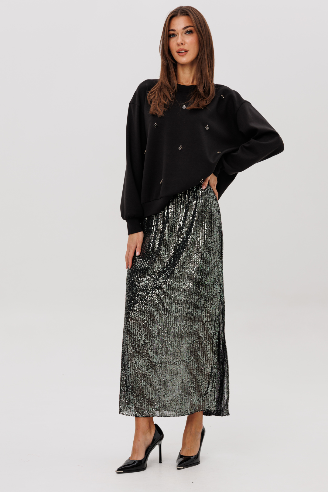 Стильный комплект, сочетающий уют и женственность. Мягкий свитшот из комфортного трикотажа украшен ручной расшивкой декоративными элементами в форме «клевера» — утончённая деталь, создающая акцент на естественной элегантности. Юбка выполнена из трендового полотна в пайетку. Юбка прямая, длинная на эластичном поясе и подкладке. Длина юбки около 90 см.