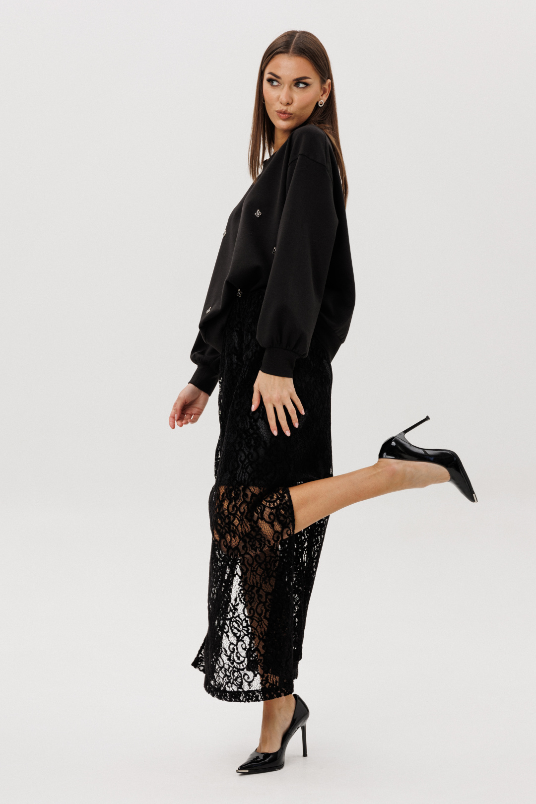 Стильный комплект, сочетающий уют и женственность. Мягкий свитшот из комфортного трикотажа украшен ручной расшивкой декоративными элементами в форме «клевера» — утончённая деталь, создающая акцент на естественной элегантности. Юбка выполнена из трендового шенилового гипюра с укороченной подкладкой, что придаёт образу лёгкость и современную многослойность.