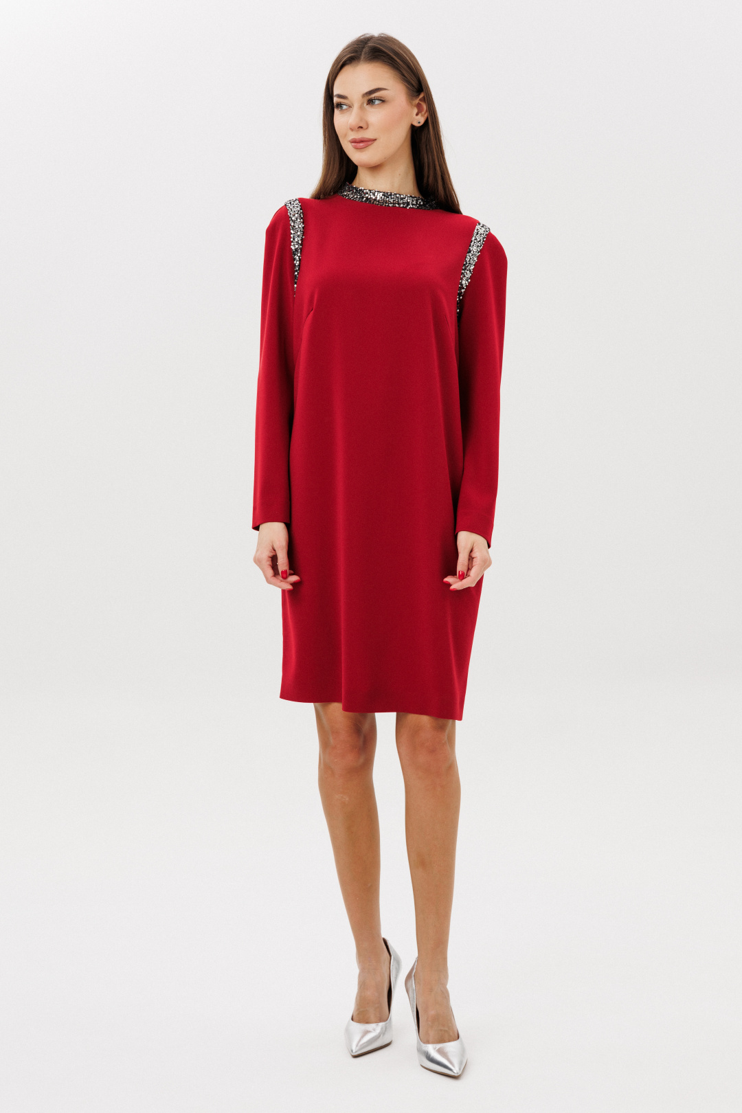 Свободный упрямленный силуэт, покрой-полуреглан, воротник-стойка, застежка по центру спинки на потайную молнию. По линиям пройм на полочке и спинке, стойка из отделочного полотна в пайетку. Полочка с нагрудной вытачкой. Длина платья около 100 см. Длина рукава около 62 см.