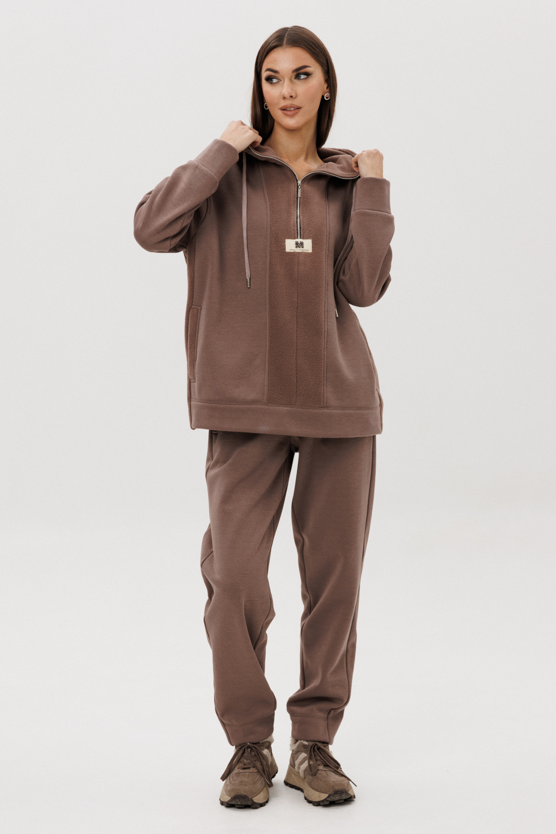 Уютный костюм из тёплого футера с мягким начёсом «барашек» — идеальный выбор для прохладного сезона. Толстовка свободного силуэта с объёмным капюшоном и функциональной молнией спереди создаёт стильный и комфортный образ. Акцентная отделка и фирменная нашивка добавляют современный штрих. Брюки прямого кроя с эластичным поясом и манжетами обеспечивают удобную посадку и свободу движений.