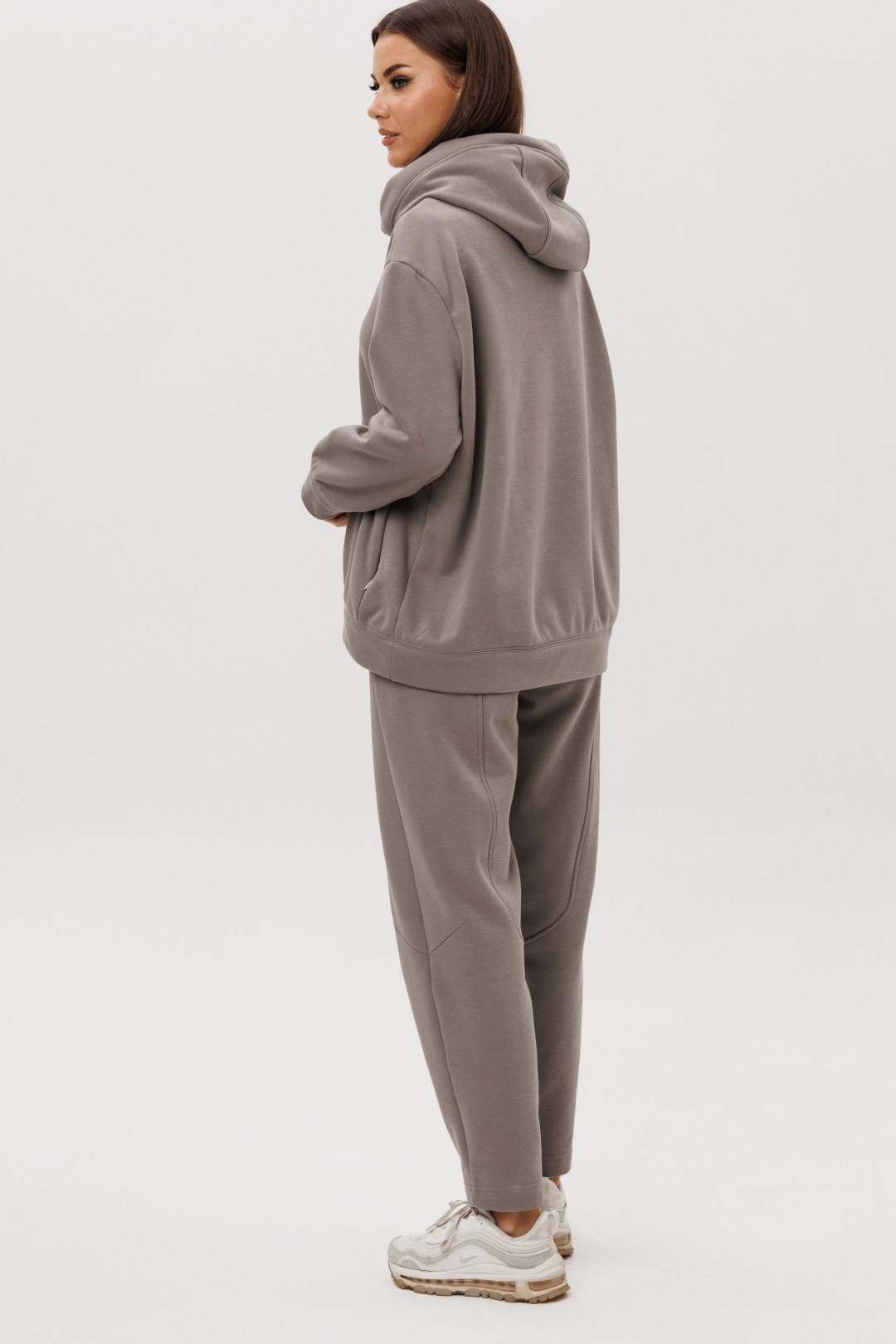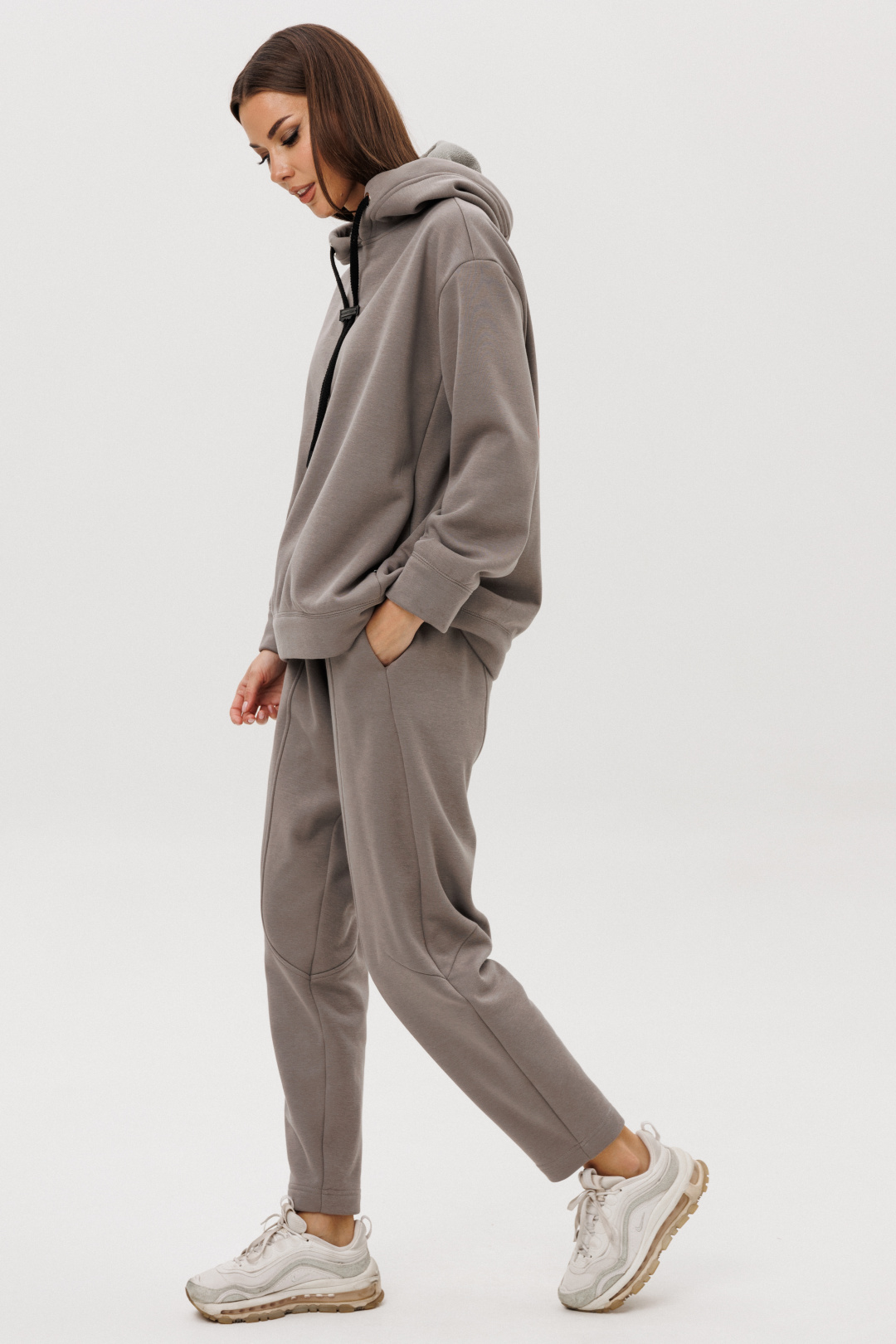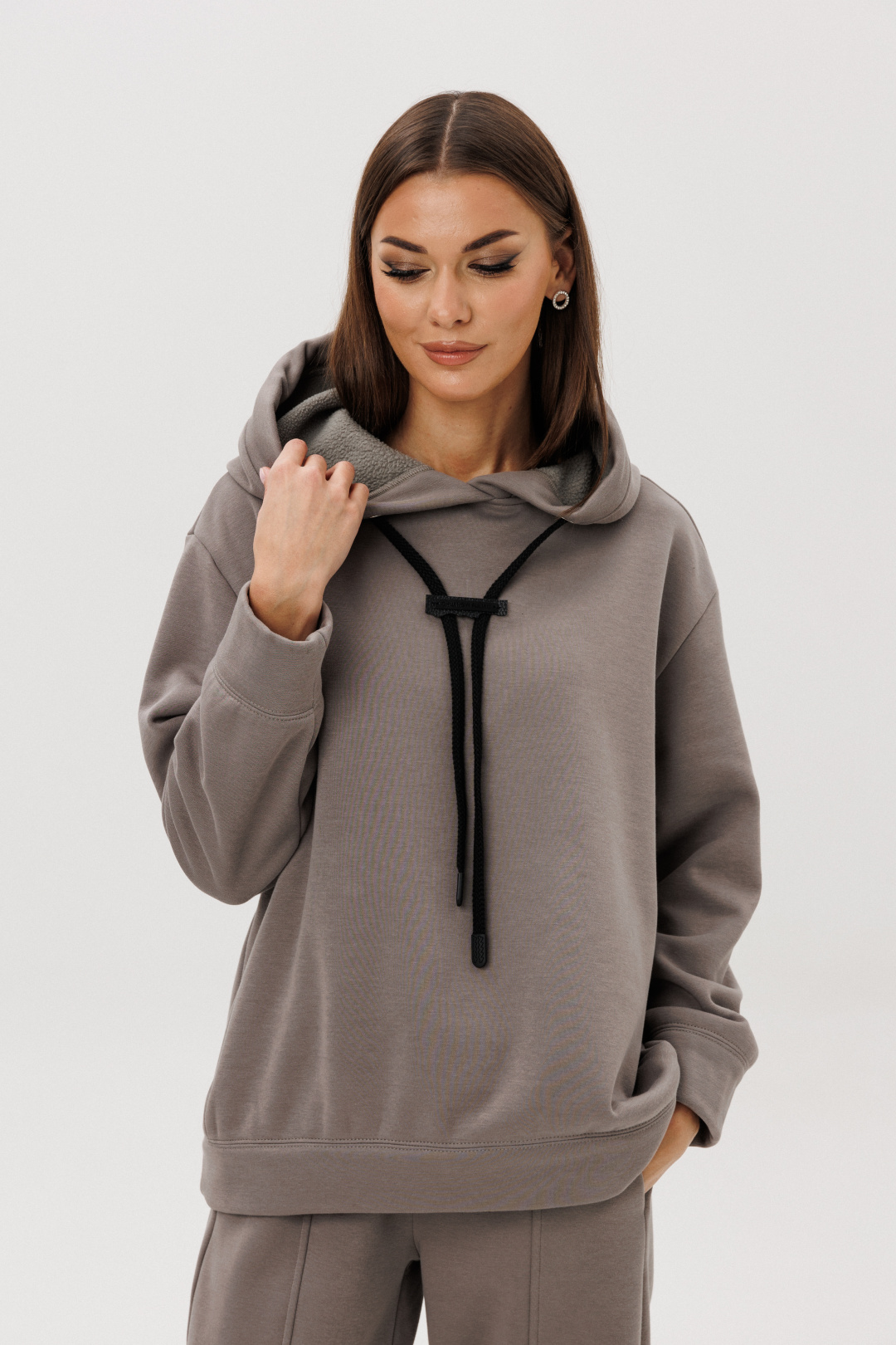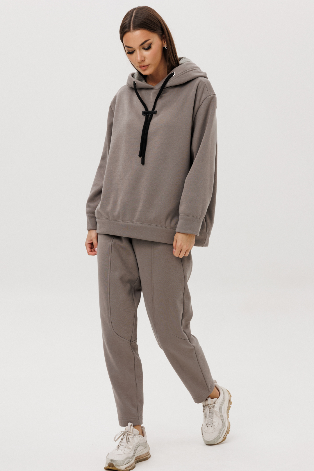 Уютный костюм из тёплого хлопчатобумажного футера с мягким начёсом «барашек» — идеальное сочетание комфорта и современного стиля. Объёмный худи с капюшоном и контрастным шнуром создаёт расслабленный силуэт, а брюки со слегка зауженным кроем и декоративными строчками добавляют образу актуальности.