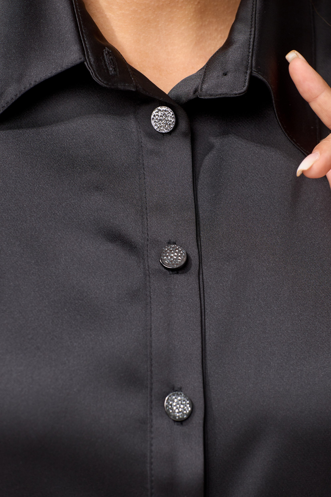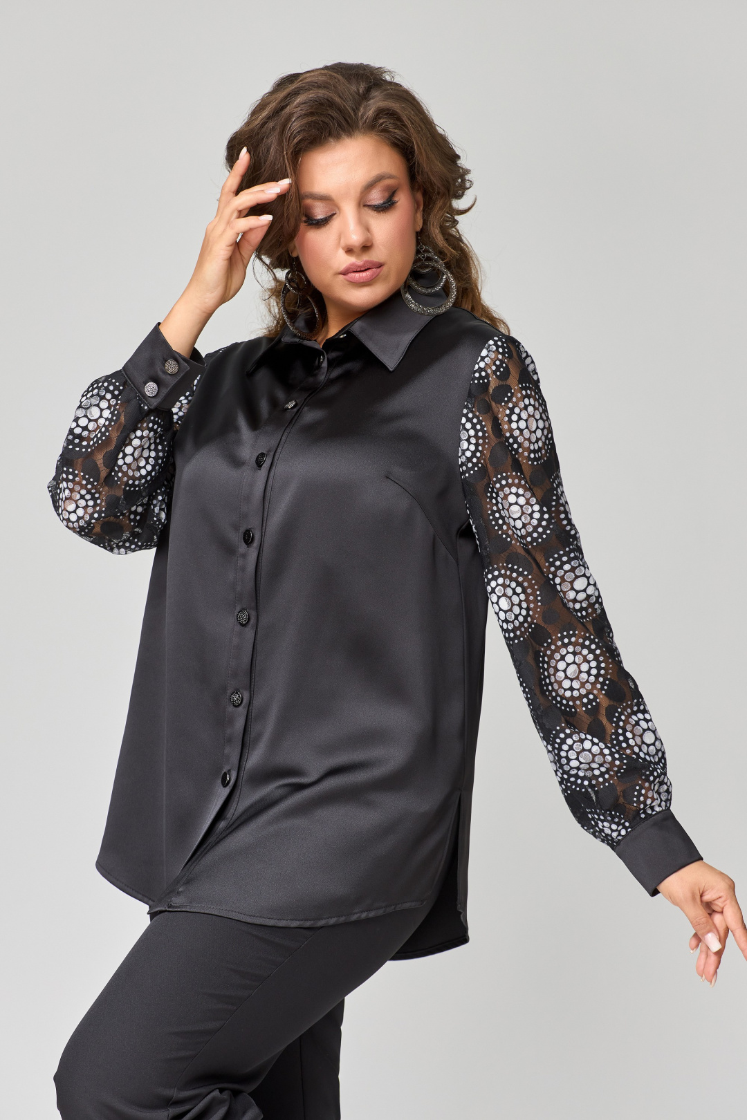 Блузка прямого силуэта с рубашечным воротником и воздушными рукавами из сетки — это игра фактур и женственности. Бантовая складка на спинке добавляет объёма, а боковые разрезы — движения.