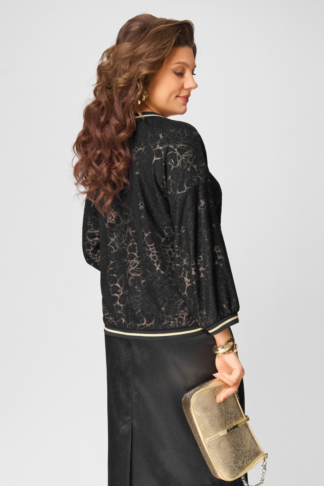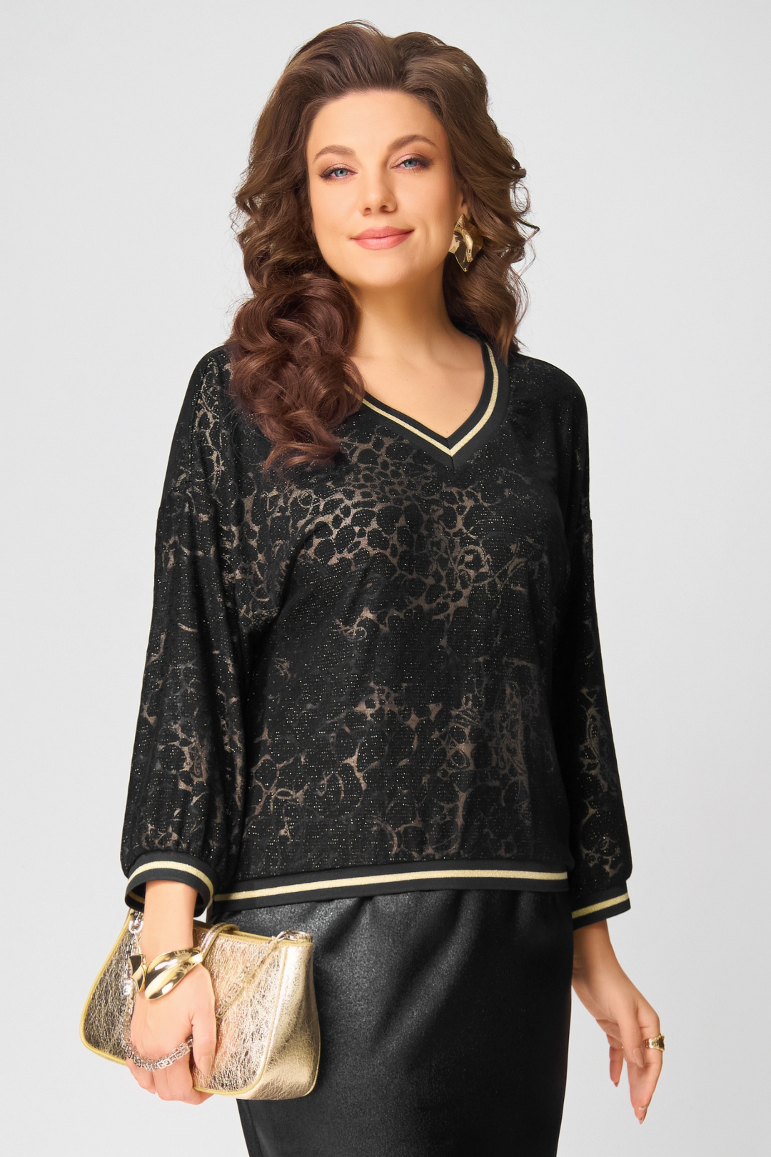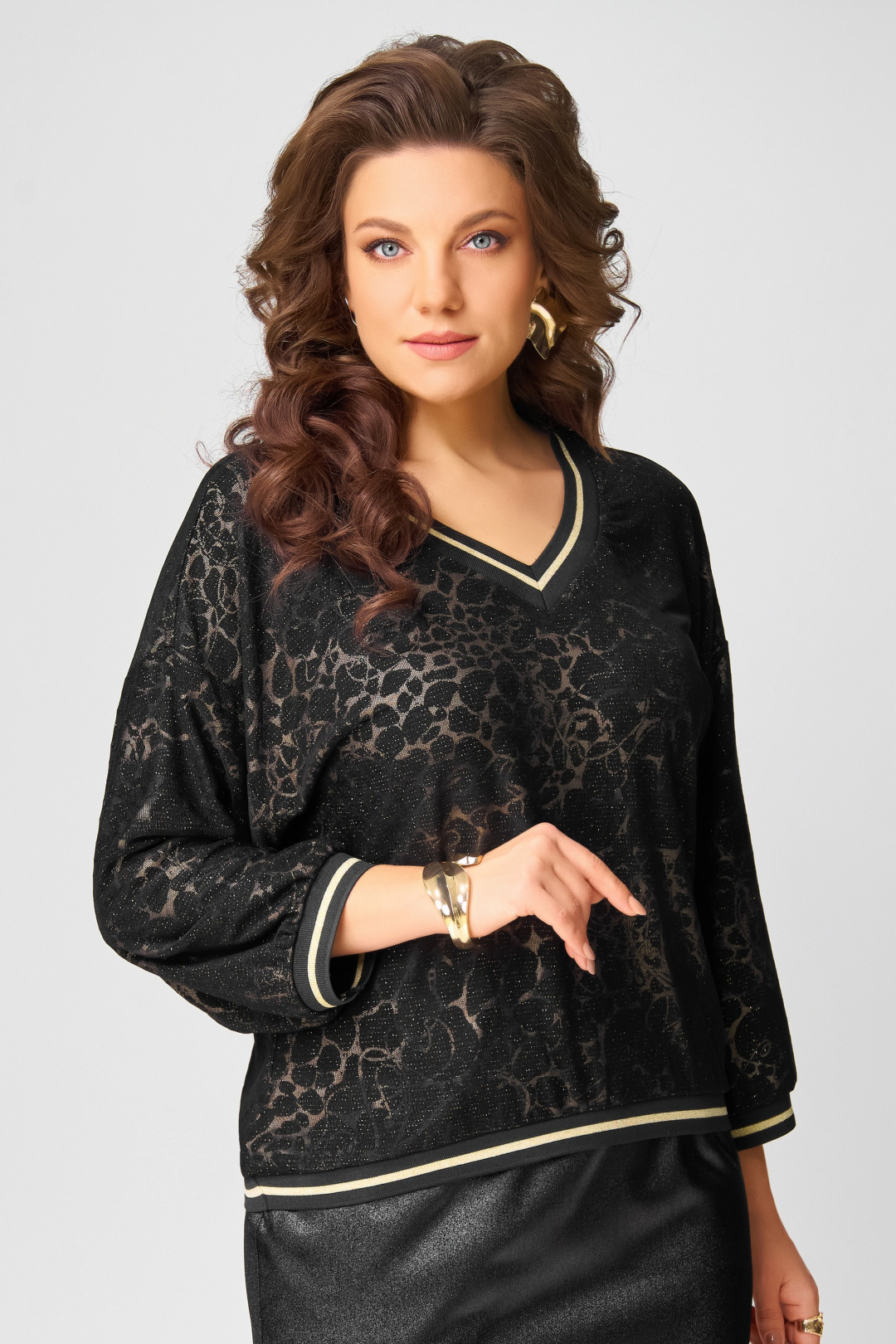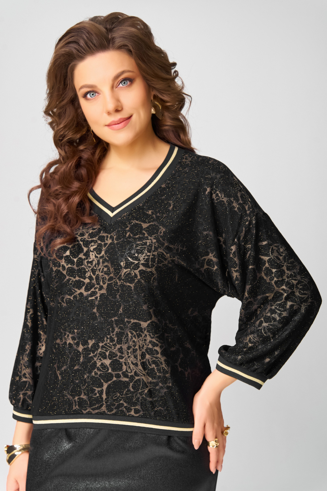 Нарядный джемпер "Ираида" свободного покроя выполнен из мягкого трикотажного полотна с декоративной сеткой, создающей эффект многослойности и воздушности.