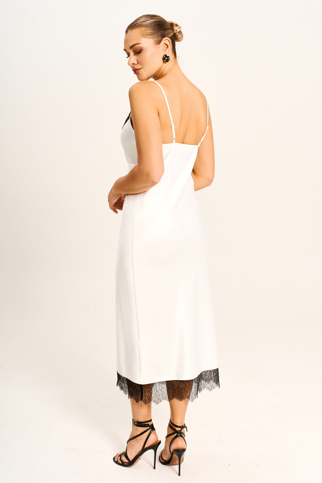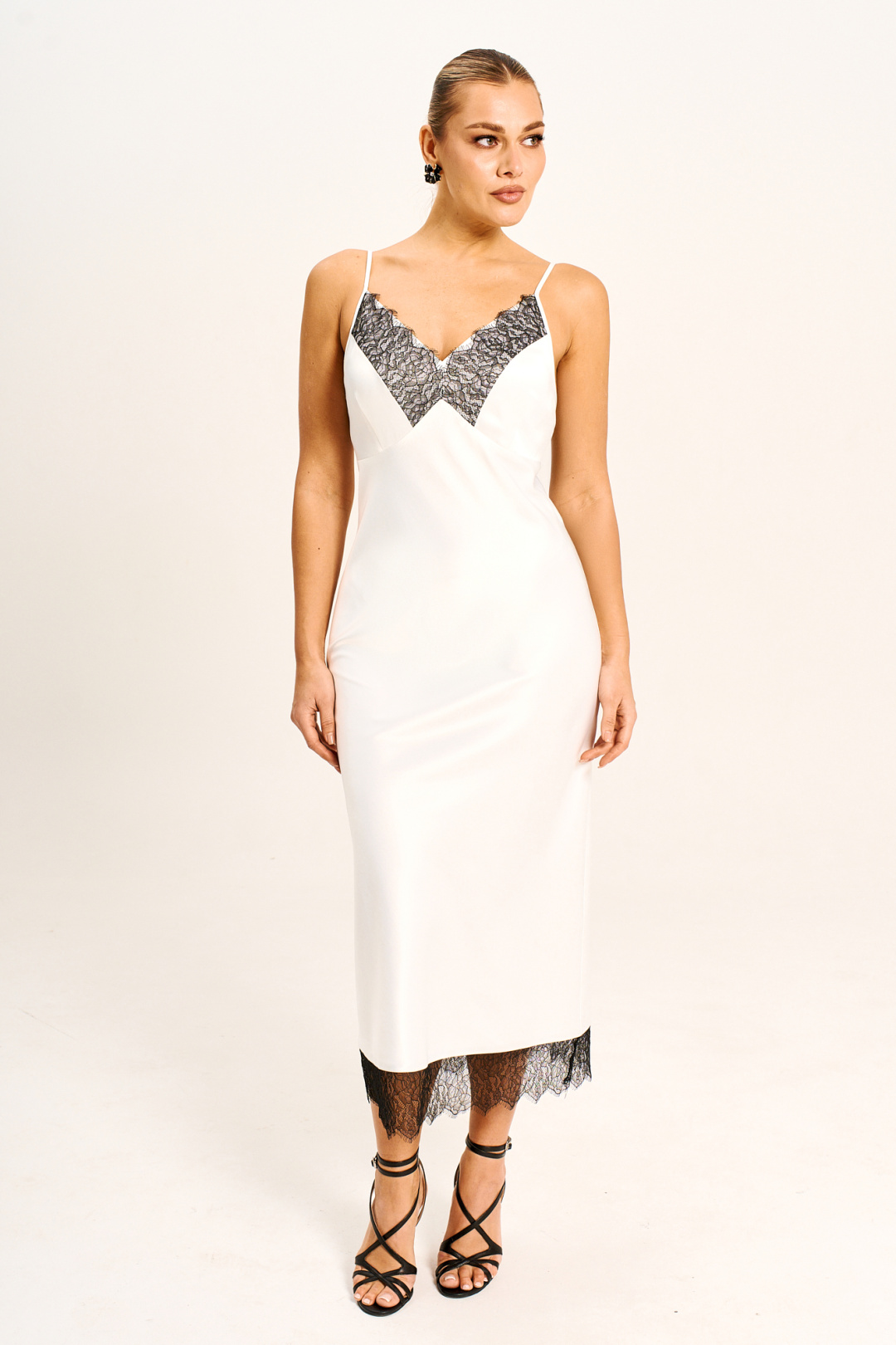 Платье - миди прилегающего силуэта выполнено из струящегося шелк - сатина на регулируемых бретелях и молнией в боковом шве. Подрезы по линии груди и низу платья дополнены мягким французким кружевом, которое держит форму. Платье полностью соответствует заявленному размеру. Пожалуйста, пользуйтесь таблицей замеров готового изделия, чтобы подобрать идеальный размер.