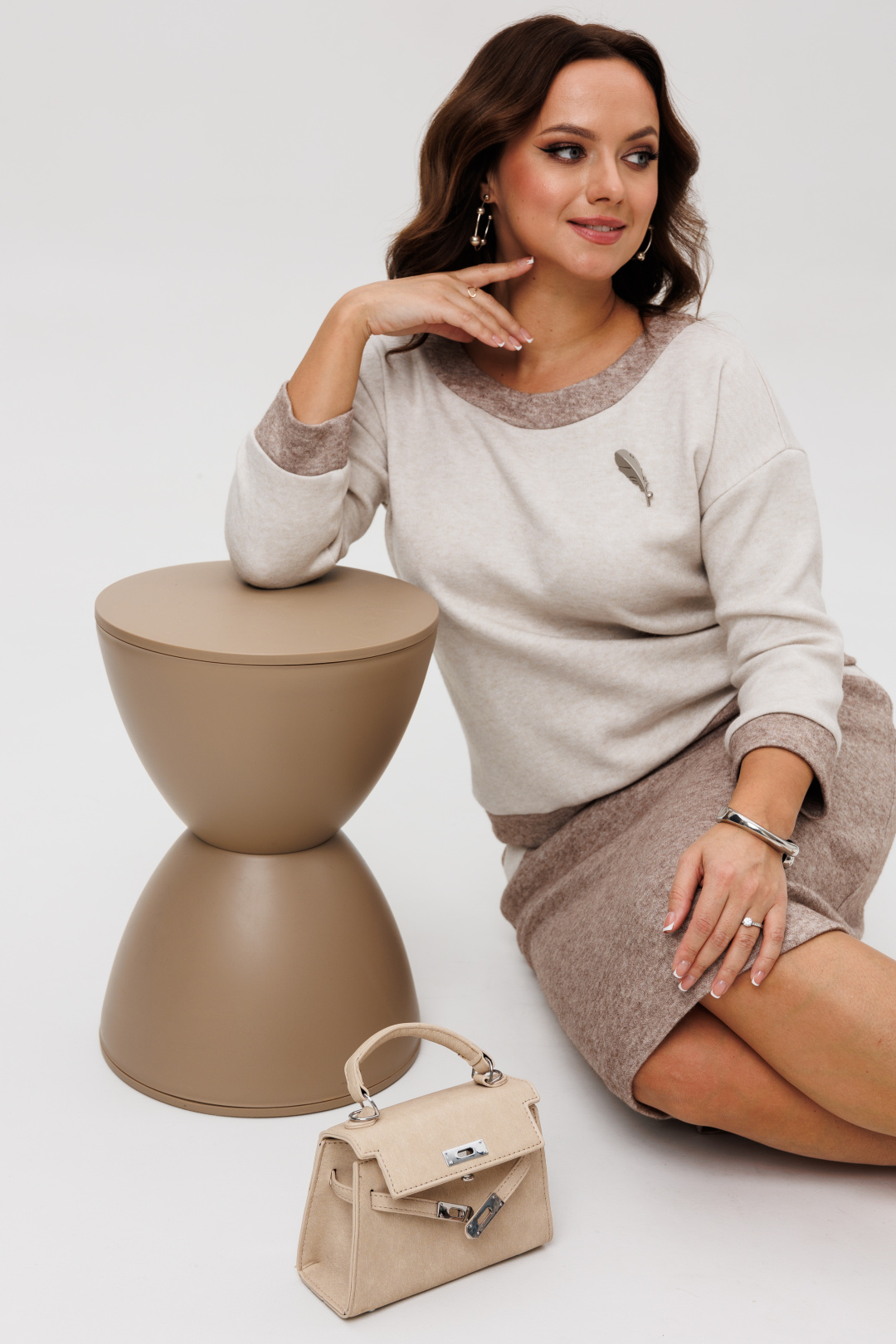 Элегантный женский костюм, состоящий из жакета и юбки, идеально подходит для офиса или деловых встреч. Жакет коричневого цвета с длиной изделия 53 см и длиной рукава 37 см, оформлен минималистично, подчеркивая строгость и элегантность. Прилегающая юбка длиной 61 см выполнена из ткани приятного коричневого оттенка, что добавляет контраста и утонченности образу. Этот костюм будет выглядеть актуально и стильно, обеспечивая комфорт на протяжении всего дня.
