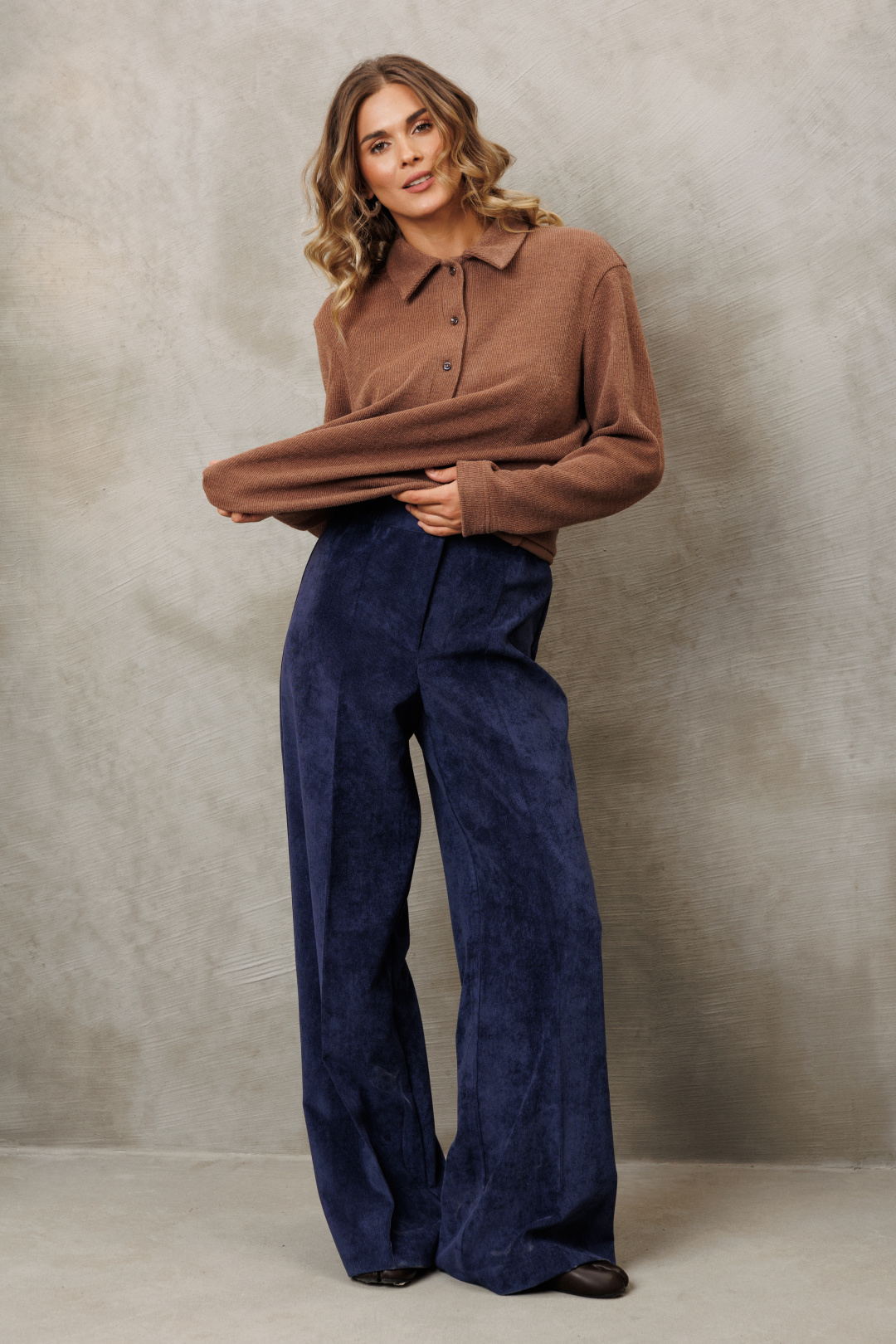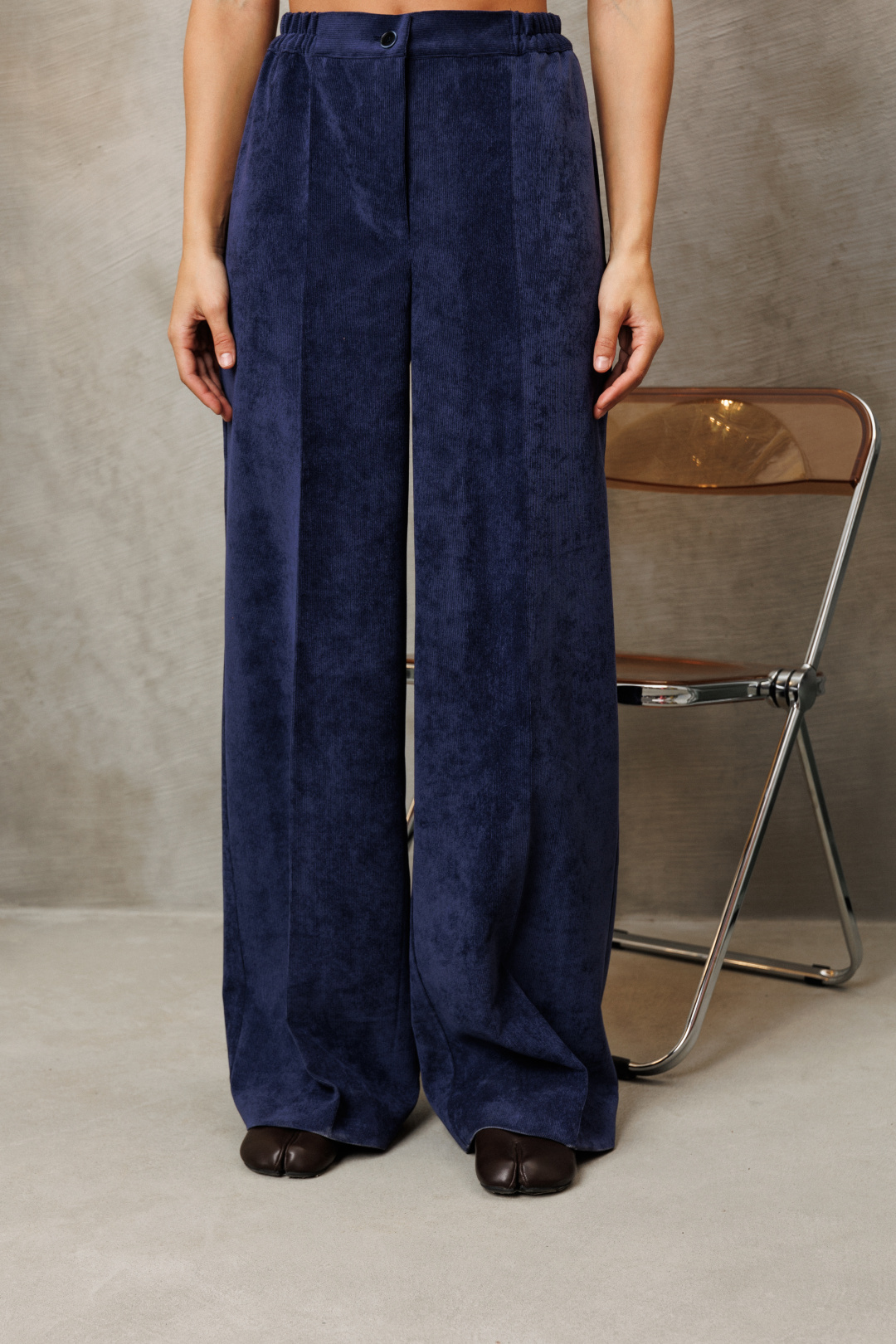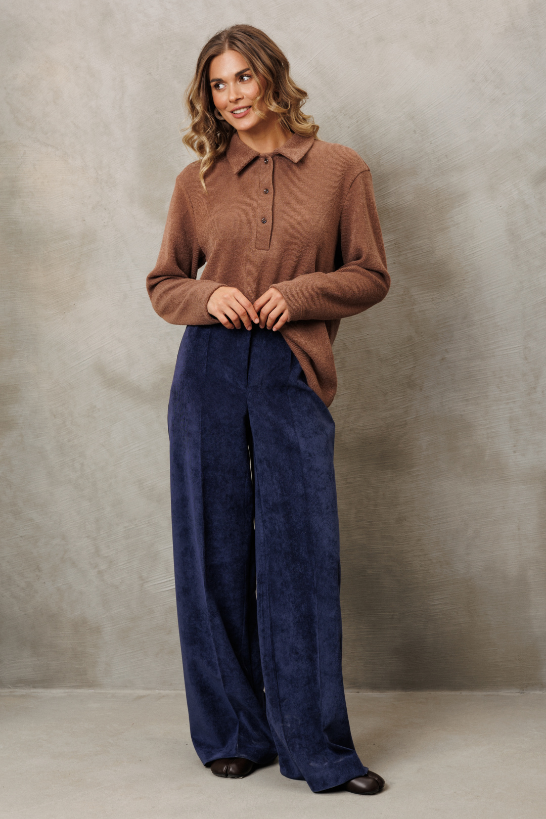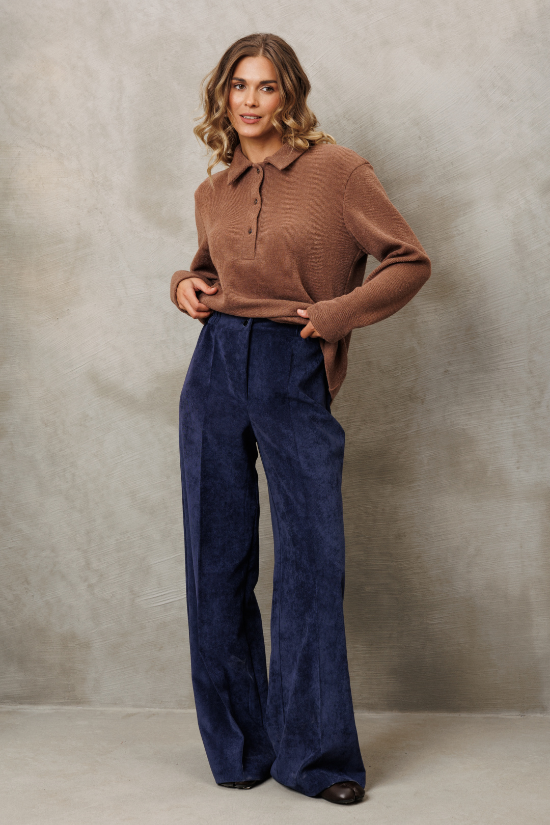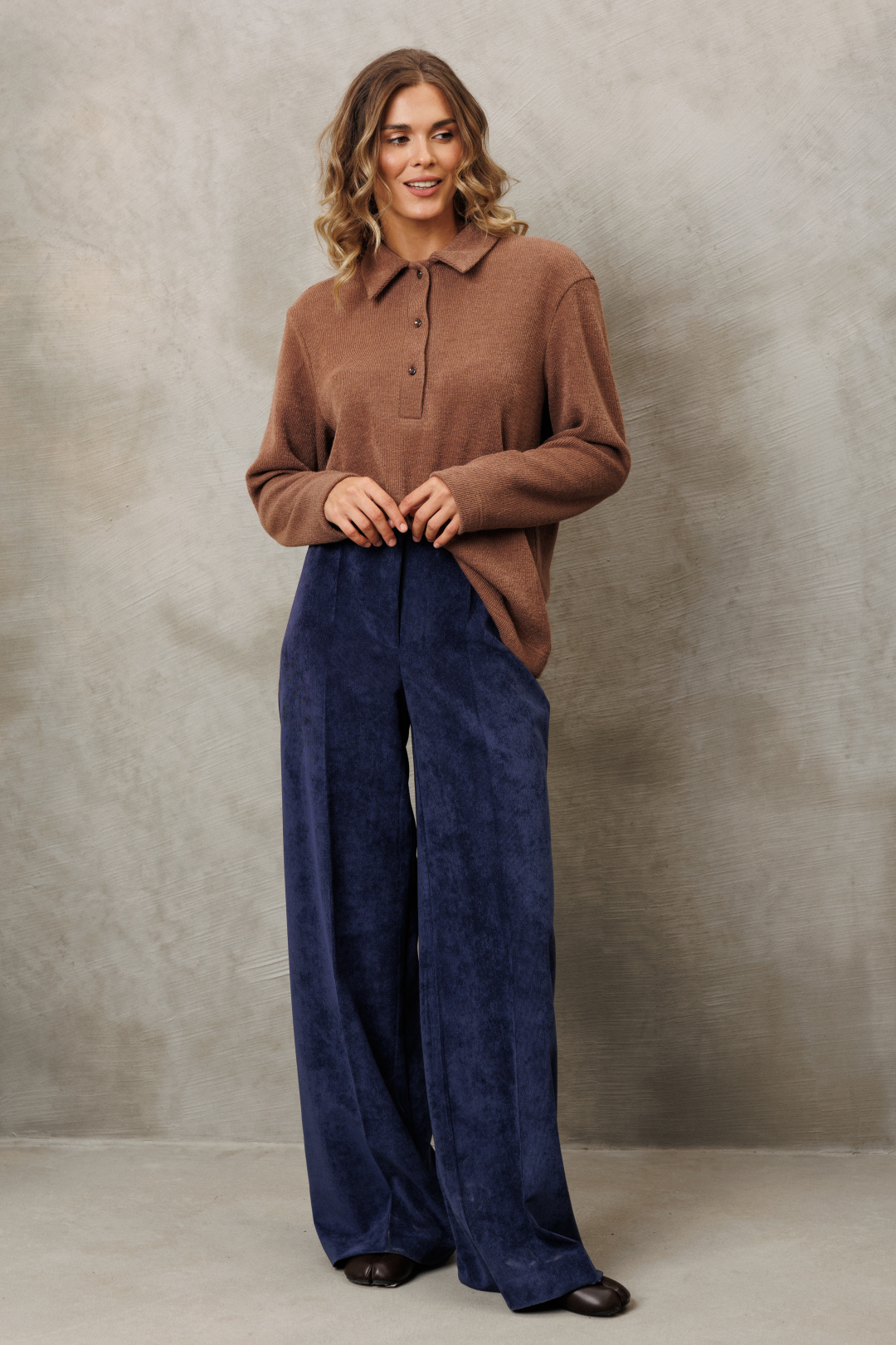 Костюм состоит из джемпера и брюк. Джемпер прямого силуэта с воротником поло из теплого трикотажного полотна. Рукав втачной одношовный. Брюки палаццо с притачным поясом из мягкой вельветовой ткани. Спереди застежка гульфик на молнии и петлей и пуговицей по поясу. По задней частям брюк вытачки. Пояс с резинкой в боковых частях. Брюки с заутюженными стрелками. Длина джемпера- 66 см, длина рукава - 60 см. Длина брюк с учетом пояса - 109 см.