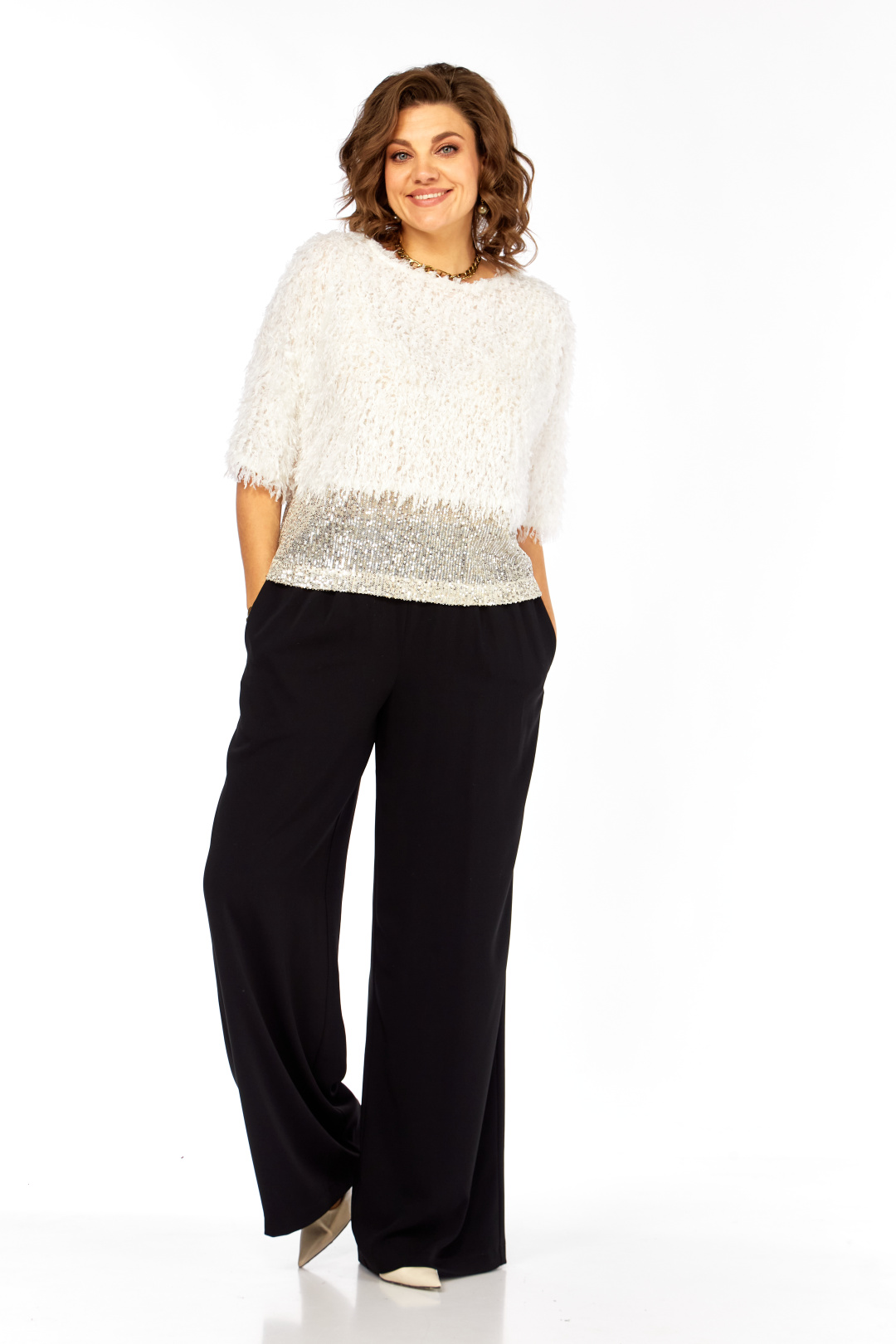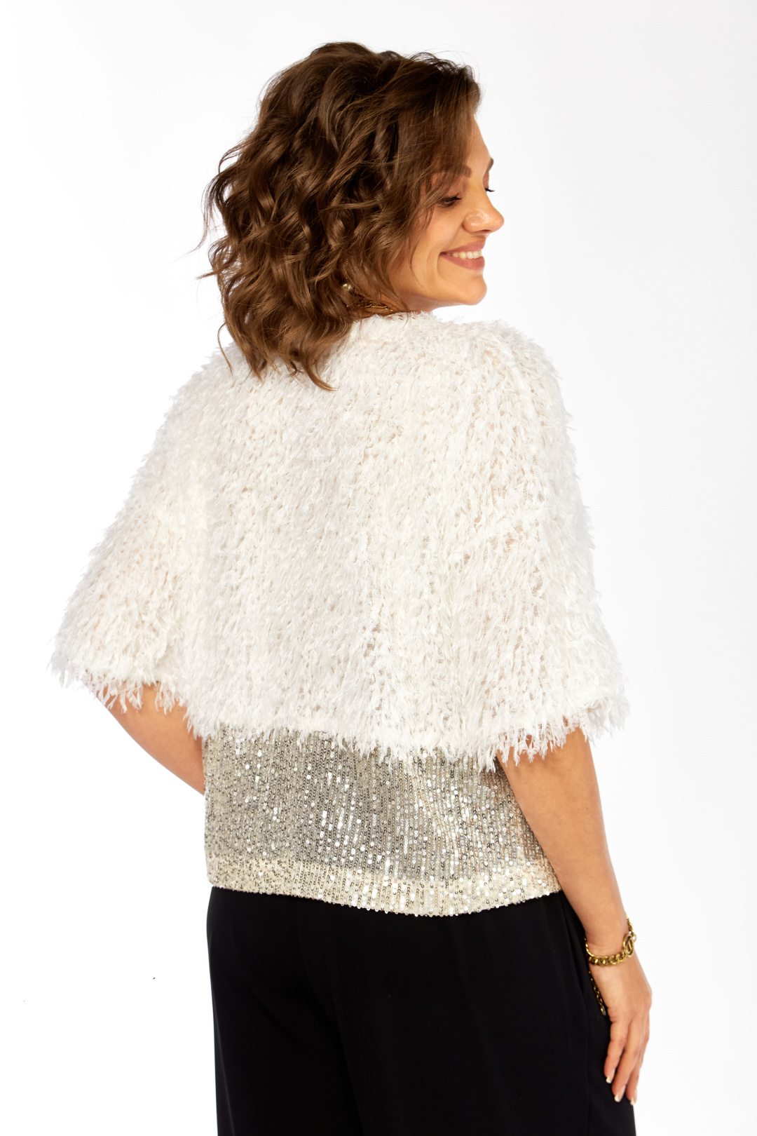 Элегантная женская блузка нарядного прямого силуэта, выполнена из уникальной текстурированной ткани с добавлением бахромы, что придает изделию особенный шарм и объем. Основной цвет блузки - мягкий белый, дополнен нижним слоем из блестящих серебристых пайеток, создающих деликатный переход и добавляющих праздничности. Вырез горловины округлой формы аккуратно подчеркивает линию шеи. Рукава длиной 3/4, спущенные, добавляют комфортности и свободы. Общая длина блузки составляет 55 см, а длина рукава от горловины — 41,5 см, делая её идеальным выбором для торжественных событий или для создания эффектного повседневного образа.