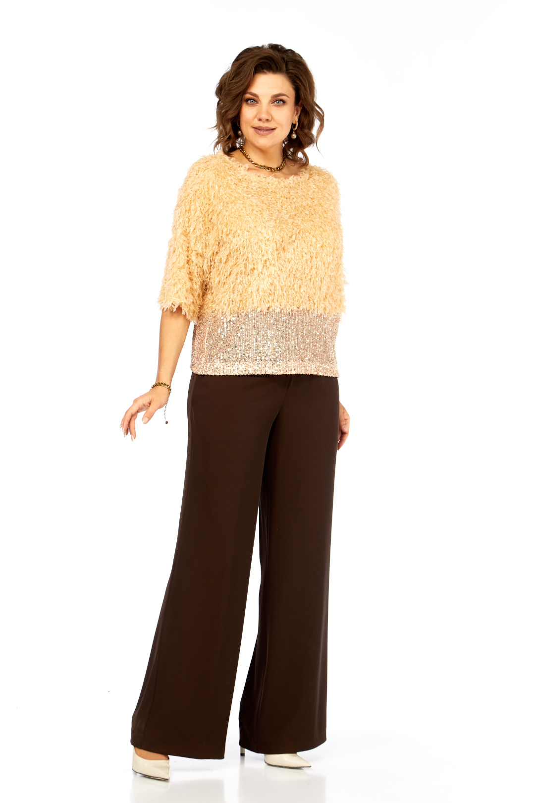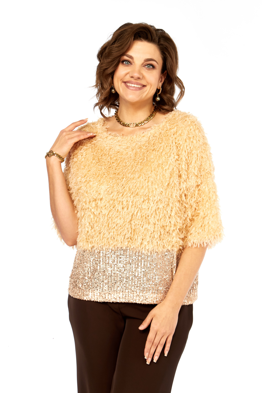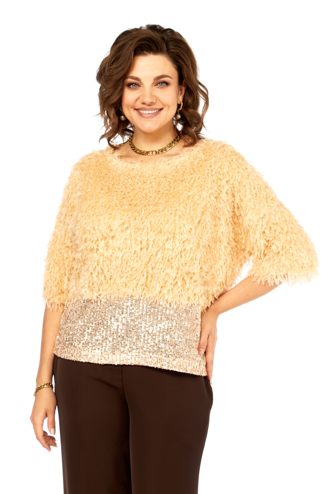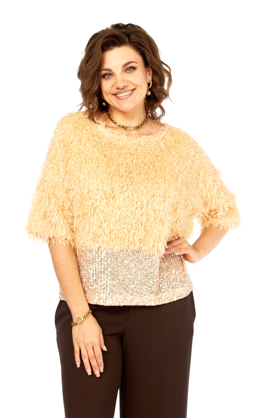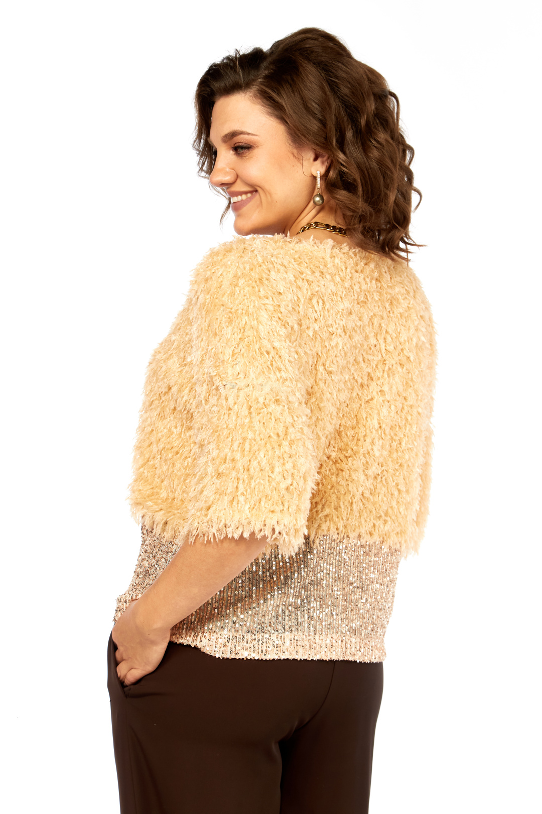 Эта нарядная блузка прямого силуэта станет изысканным добавлением к вашему гардеробу. Изготовлена из уникальной текстурированной ткани с мягкими ворсинками нежно-бежевого цвета, которая переходит в эффектный нижний край, украшенный пайетками золотистого оттенка. Вырез горловины округлой формы дополняет образ, а спущенные рукава 3/4 добавляют изящества. Длина блузки составляет 55 см, а длина рукава от горловины - 41,5 см, что делает её идеальной для сочетания как с классическими брюками, так и с элегантными юбками.