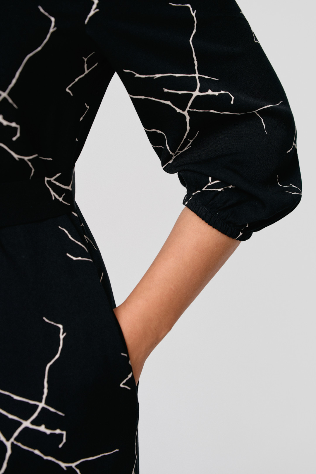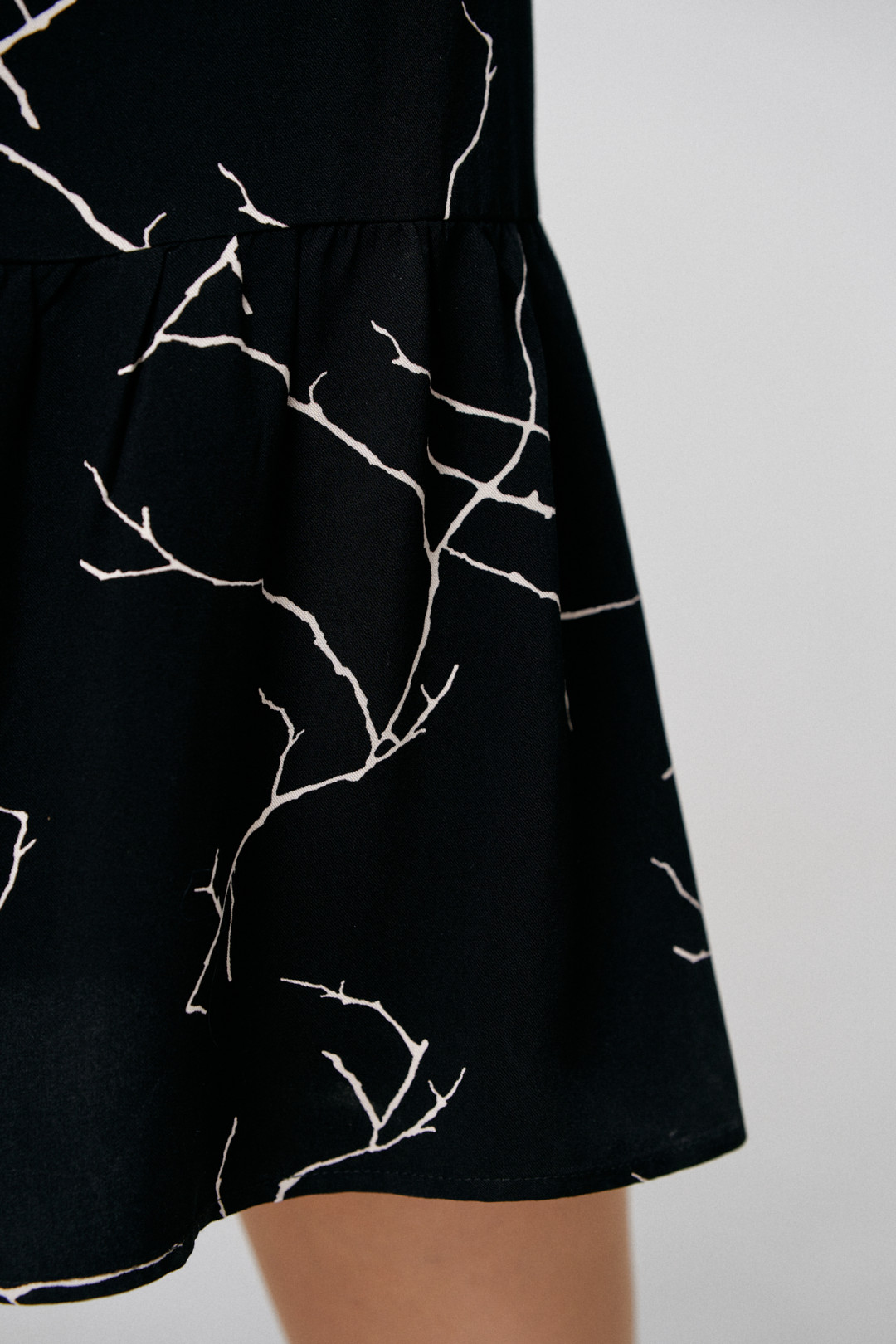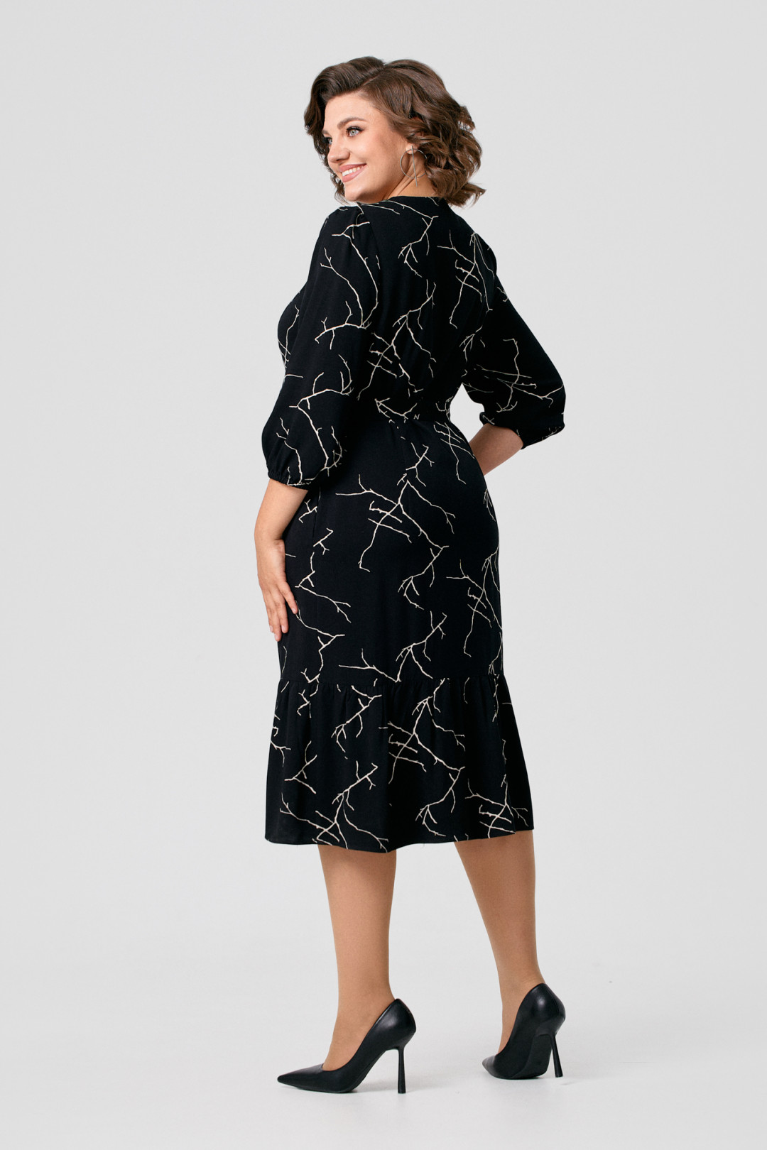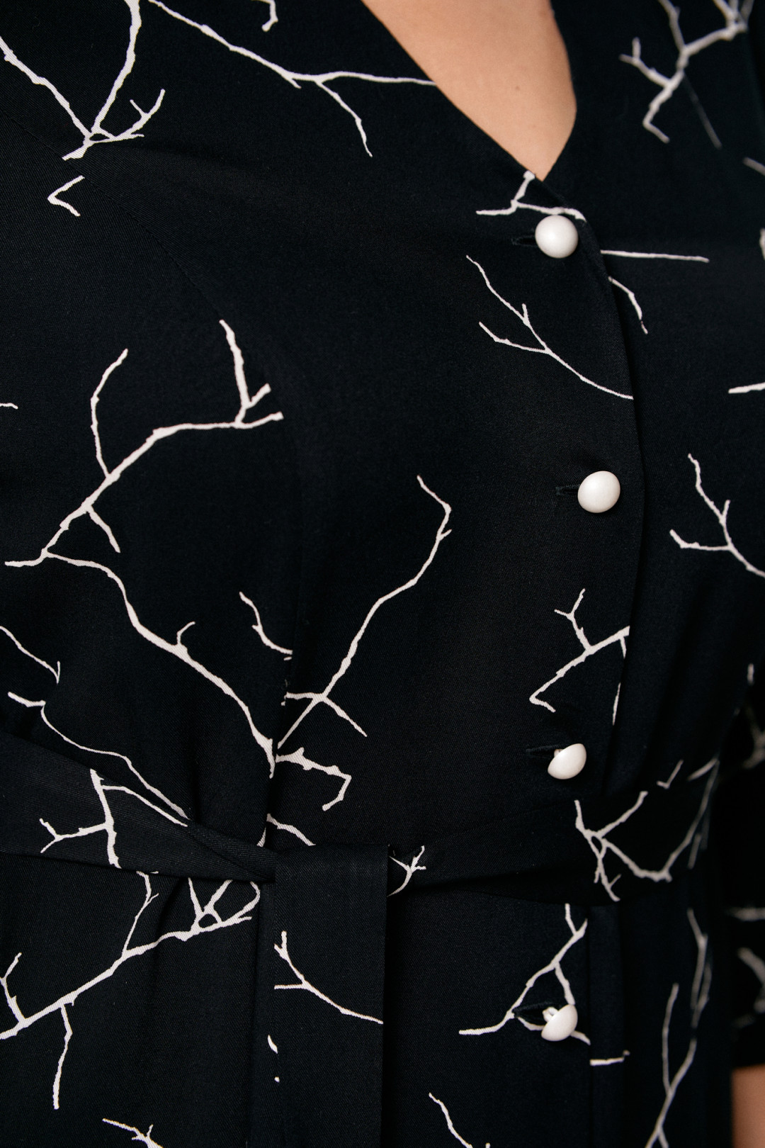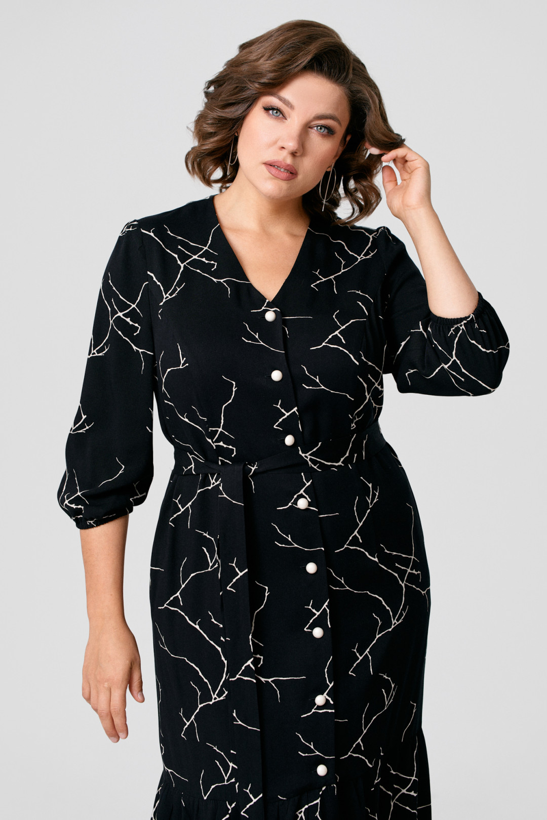 Классическое женское платье полуприлегающего силуэта из мягкой приятной к телу непросвечивающейся натуральной вискозы. Платье с V-образным вырезом горловины и втачными рукавами на резинке по низу застегивается на петли и пуговицы. По низу изделия отрезной валан с небольшой сборкой. В комплект входит съемный пояс.