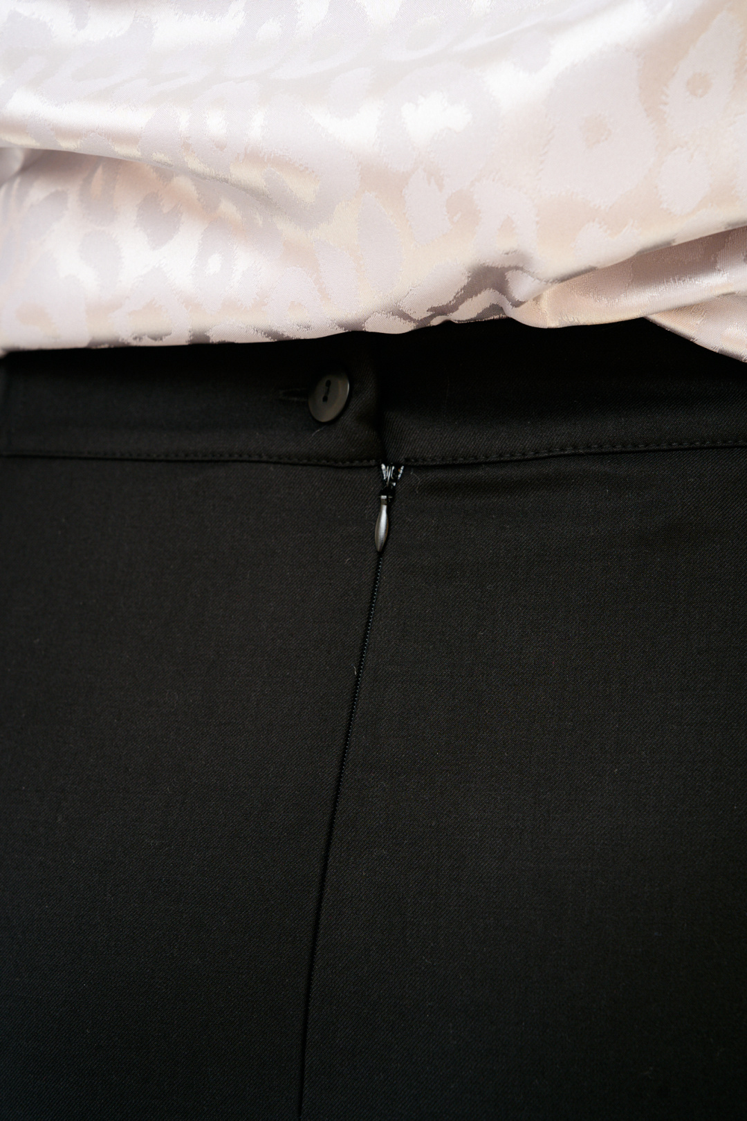 Женский костюм состоит из жилета, юбки и блузы. Двубортный жилет полуприлегающего силуэта на подкладке длины до середины бедра с фигурной горловиной V-образной формы и функциональными прорезными карманами по переду застегивается на петли и пуговицы. Юбка классическая "карандаш" на подкладке с завышенной линией талии на поясе-обтачке застегивается на тесьму-молнию и имеет сзади шлицу. Юбка и жилет выполнены из высококачественной ткани с содержанием вискозы 70%.
