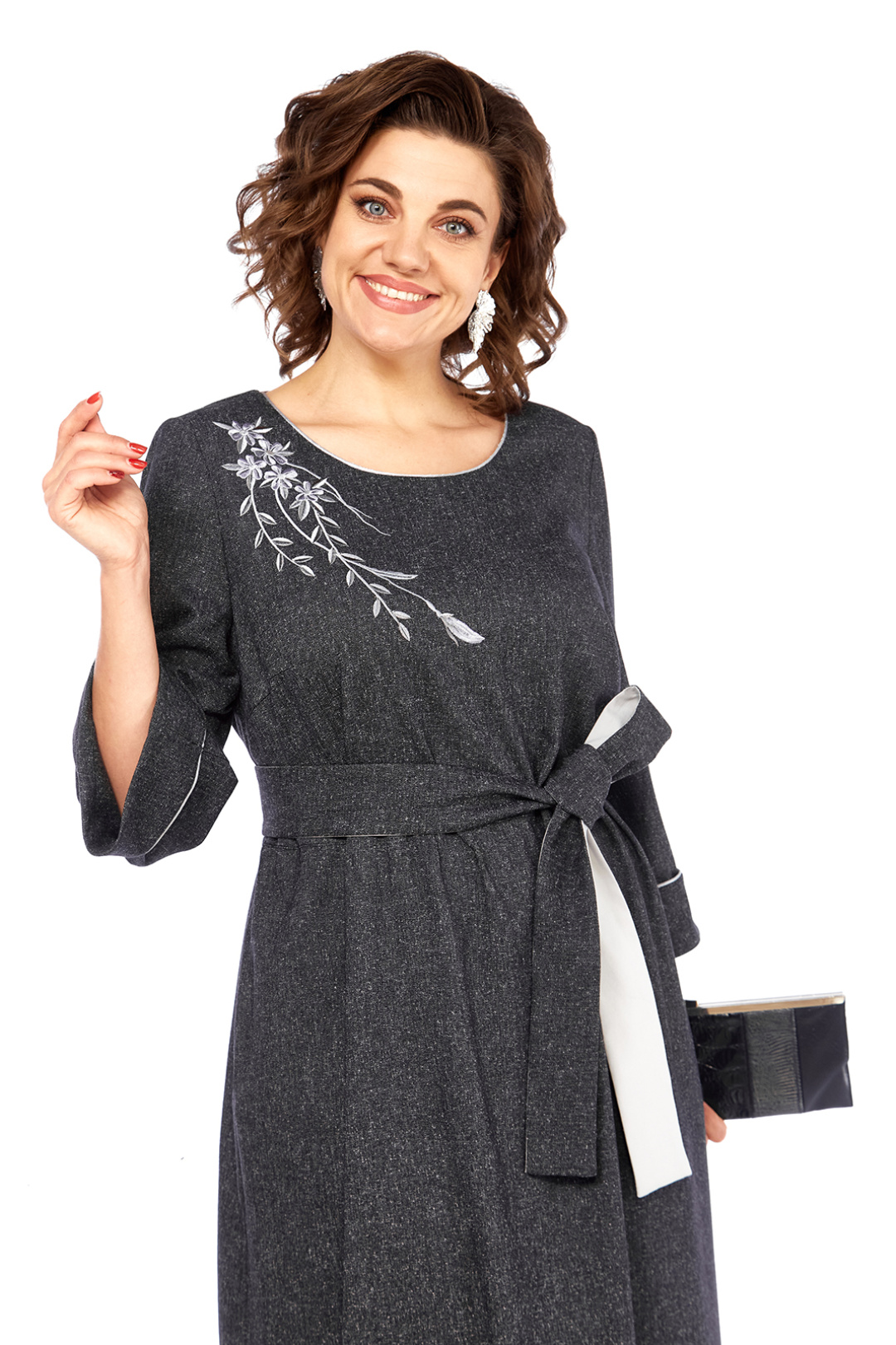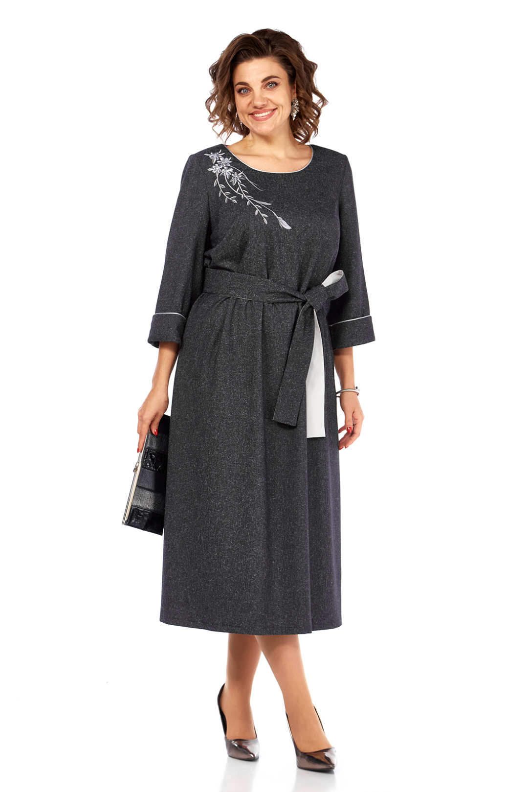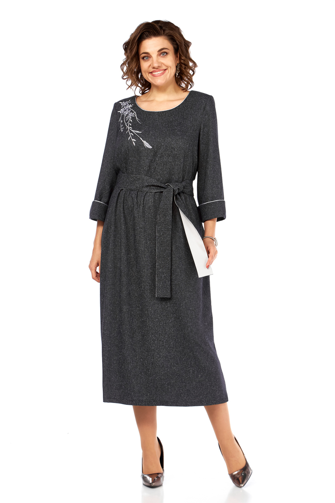 Элегантное женское платье свободного кроя, изготовлено из высококачественной костюмно-плательной ткани темно-серого цвета. Модель с круглой горловиной, оформленной кантом, дополнена дизайнерской серебристой вышивкой на передней части, добавляющей изысканности образу. Платье имеет втачные рукава 3/4 с отложными манжетами, также декорированные кантом. Удобные карманы встроены в боковые швы. Съемный пояс из основной и отделочной ткани подчеркивает талию, а сборка по линии талии придает юбке дополнительный объем. Длина платья по спинке составляет 121 см, что придает изделию утонченность и практичность. Представлено в размерах от 52 до 58. Обратите внимание, оттенок платья на экране может незначительно отличаться от реального. Это платье — прекрасный выбор для создания элегантного и комфортного образа на каждый день.
