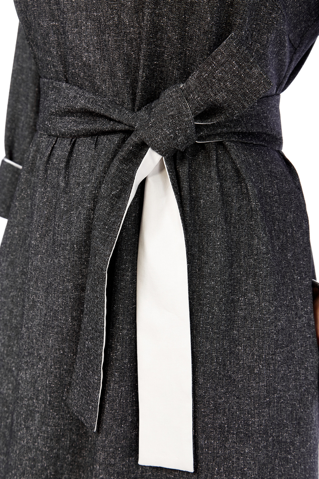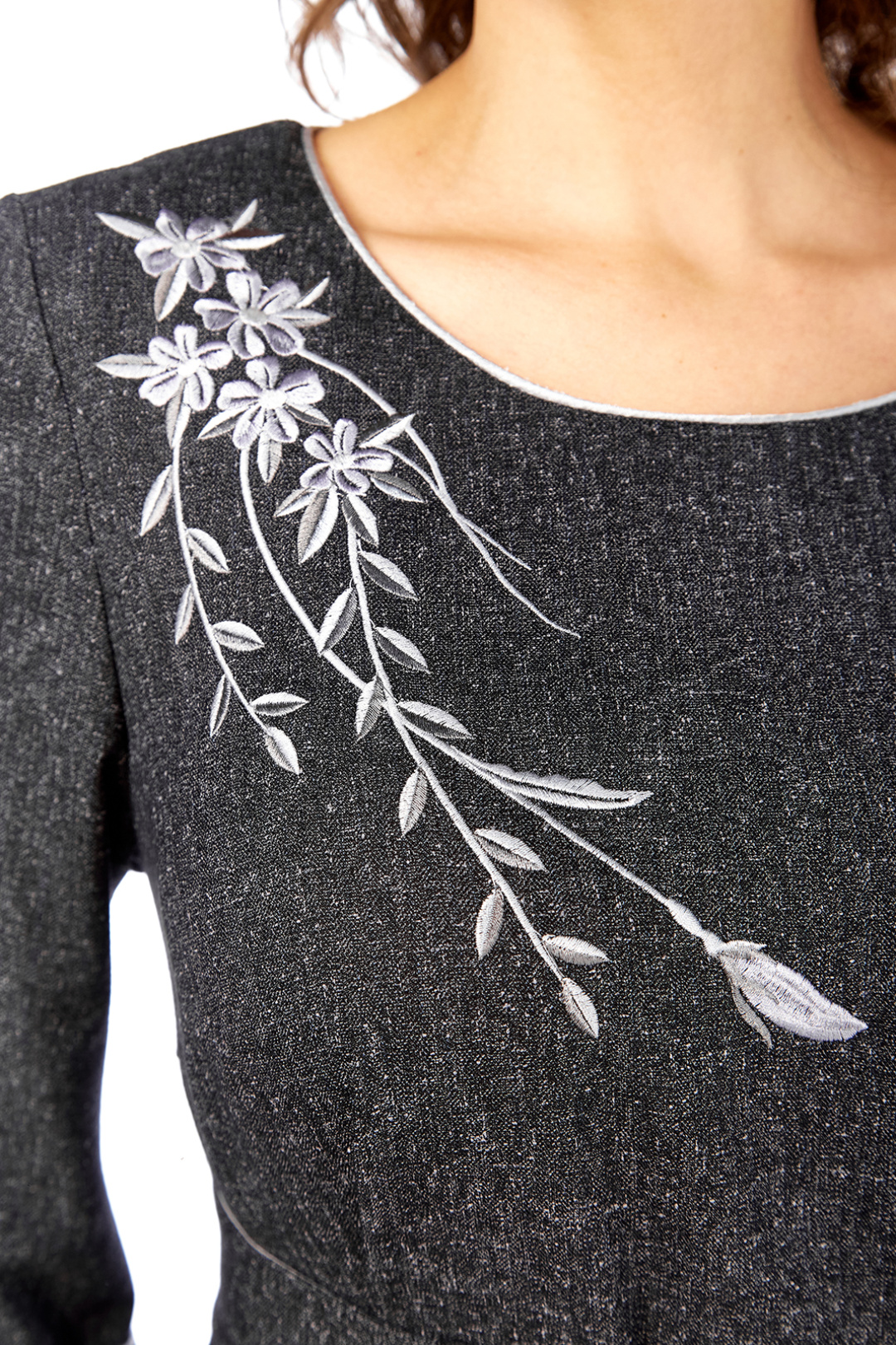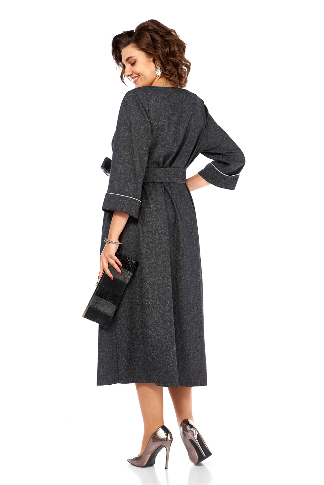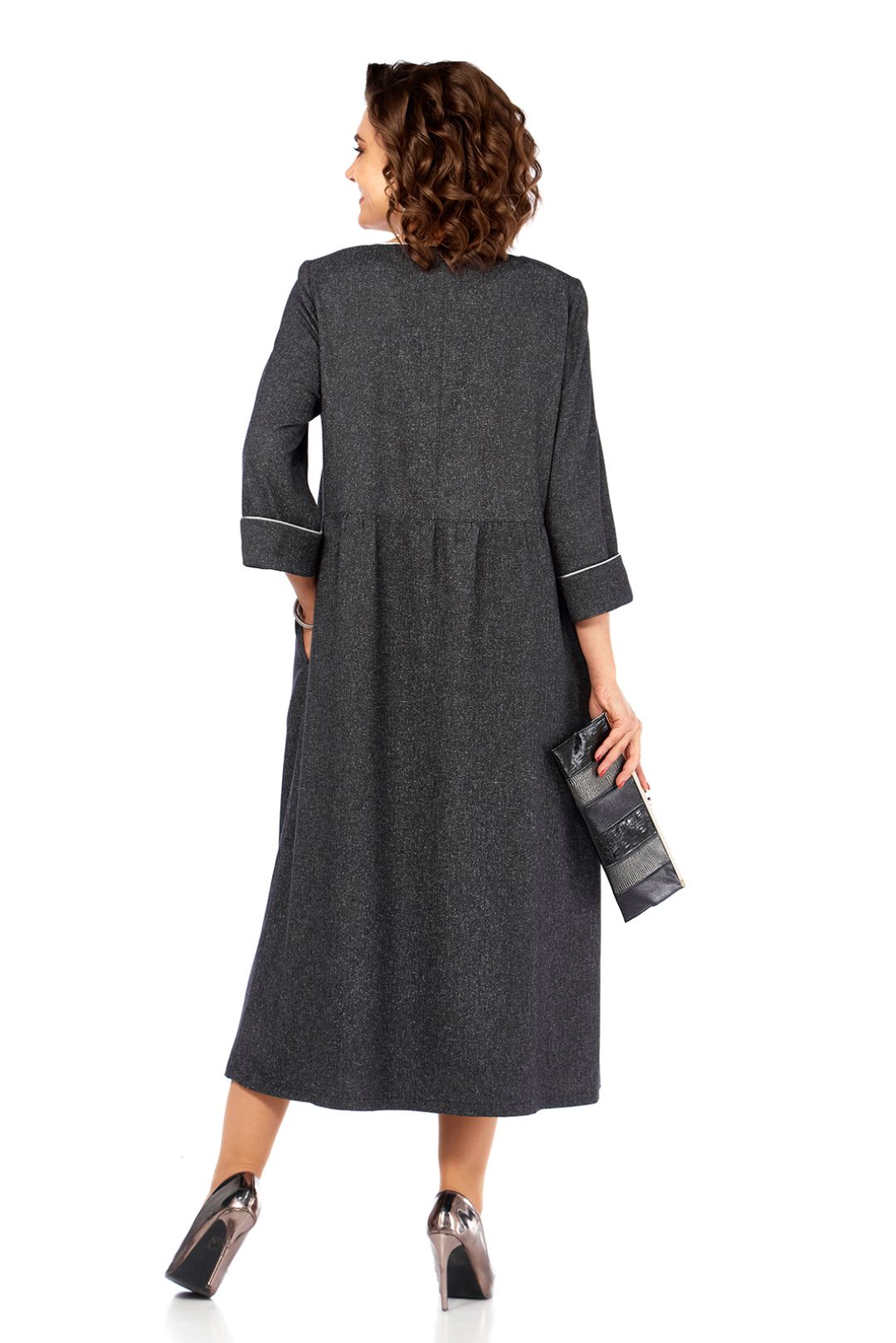 Элегантное женское платье свободного кроя, изготовлено из высококачественной костюмно-плательной ткани темно-серого цвета. Модель с круглой горловиной, оформленной кантом, дополнена дизайнерской серебристой вышивкой на передней части, добавляющей изысканности образу. Платье имеет втачные рукава 3/4 с отложными манжетами, также декорированные кантом. Удобные карманы встроены в боковые швы. Съемный пояс из основной и отделочной ткани подчеркивает талию, а сборка по линии талии придает юбке дополнительный объем. Длина платья по спинке составляет 121 см, что придает изделию утонченность и практичность. Представлено в размерах от 52 до 58. Обратите внимание, оттенок платья на экране может незначительно отличаться от реального. Это платье — прекрасный выбор для создания элегантного и комфортного образа на каждый день.