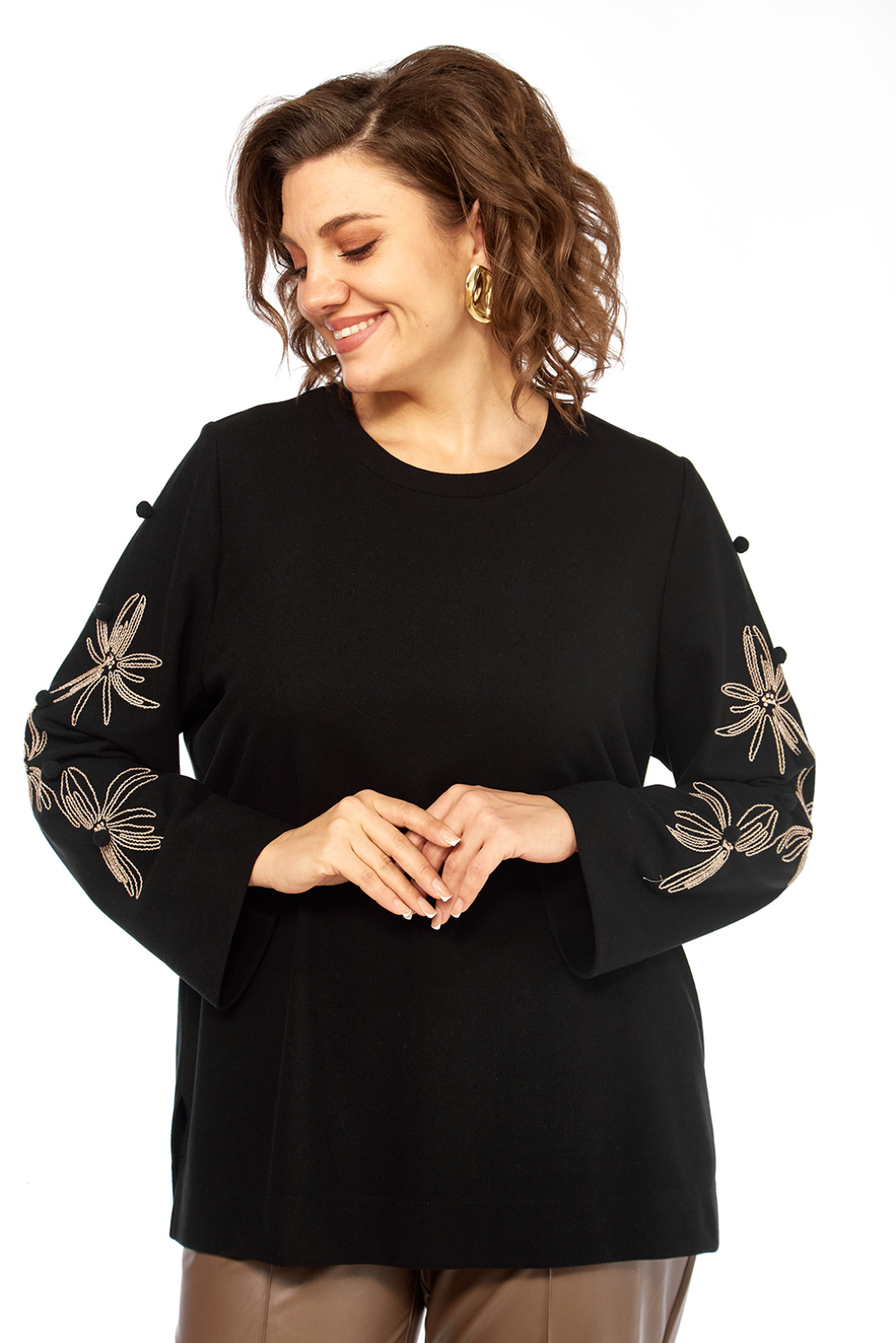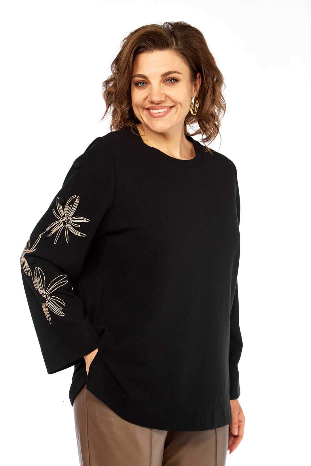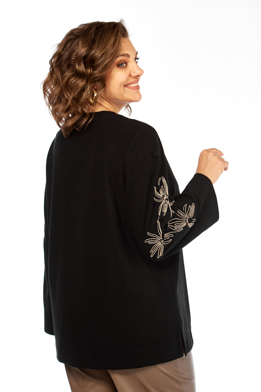 Элегантный женский джемпер черного цвета, созданный для комфорта и стиля. Изготовлен из мягкого трикотажного полотна, дизайн этой модели предусматривает цельнокроеную переднюю часть и спинку. Круглая горловина дополнена классическим вырезом, обеспечивая лаконичную и одновременно изысканную эстетику. Рукава длинные, втачные, привлекают внимание оригинальными декоративными элементами в виде вышивок с цветочными мотивами и изящных помпонов, размещенных на нижней части рукавов. Детали: - Длина джемпера по спинке: 69 см - Длина плеча: 10 см - Длина рукава: 62 см - Доступные размеры: - Размер 52: ПОГ 56 см, ПОБ 60 см - Размер 54: ПОГ 58 см, ПОБ 62 см - Размер 56: ПОГ 60 см, ПОБ 64 см Обратите внимание, что цвет на экране может отличаться от реального цвета изделия. Данный джемпер является прекрасным выбором для создания как повседневных, так и более элегантных образов.