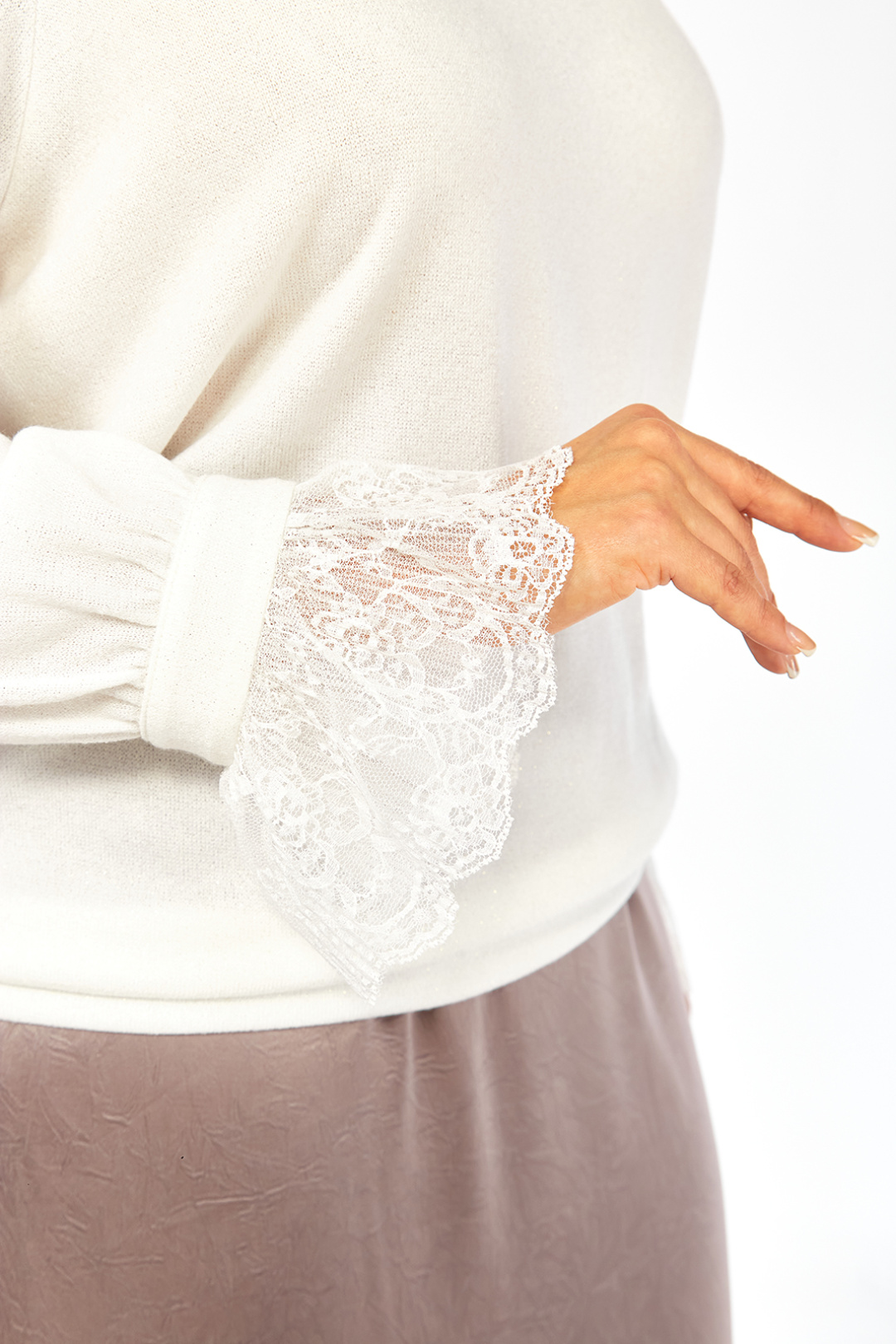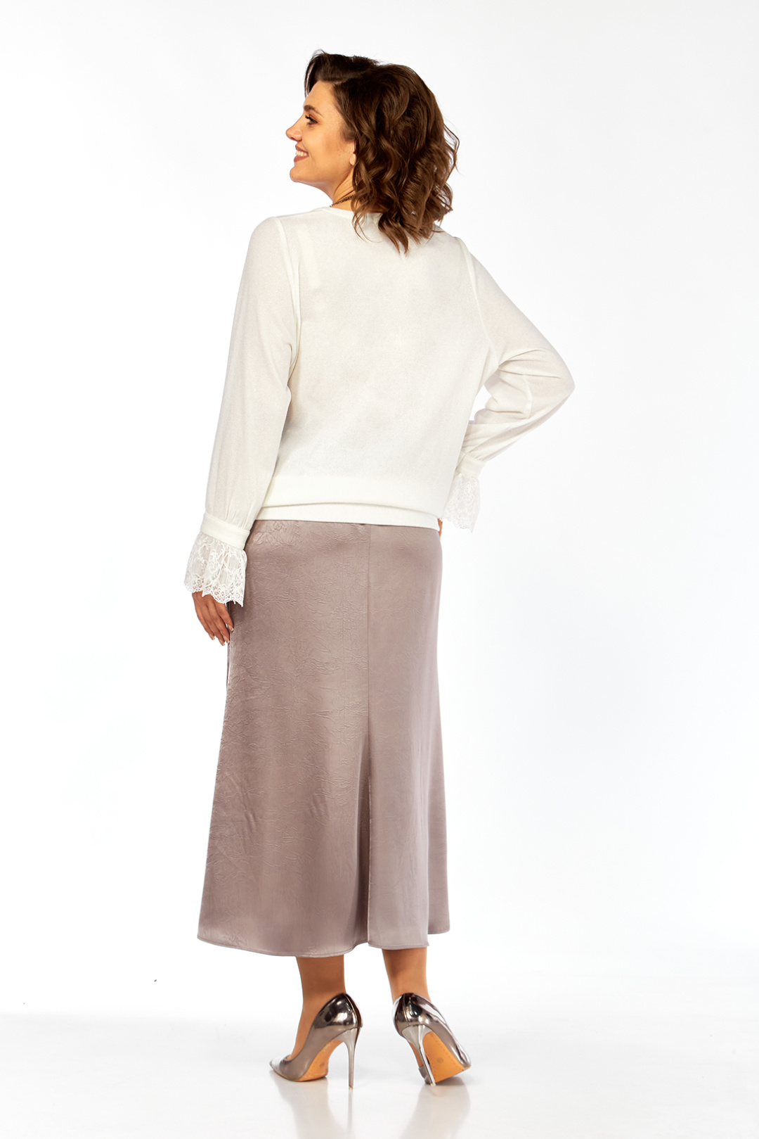 Элегантный женский костюм, идеально подходит для торжественных случаев. Комплект состоит из джемпера и юбки-годе. Джемпер изготовлен из нежного трикотажного полотна с искринкой, придающей изделию особый шик. Оформлен круглой горловиной и втачными рукавами с оригинальным декоративным кружевным элементом по низу. Юбка выполнена из качественной ткани, дополнена потайной застёжкой-молнией на заднем шве и подкладкой для дополнительного комфорта. Длина юбки составляет около 90 см, что идеально сочетается с джемпером, длина которого по спинке — 67 см. Этот комплект доступен в различных размерах: от 52 до 56, что позволяет подобрать идеальный вариант по фигуре. Изделия идеально смотрятся в сочетании и могут служить основой для элегантного и притягательного образа. Обратите внимание, что реальный цвет изделия может слегка отличаться от представленного на экране.