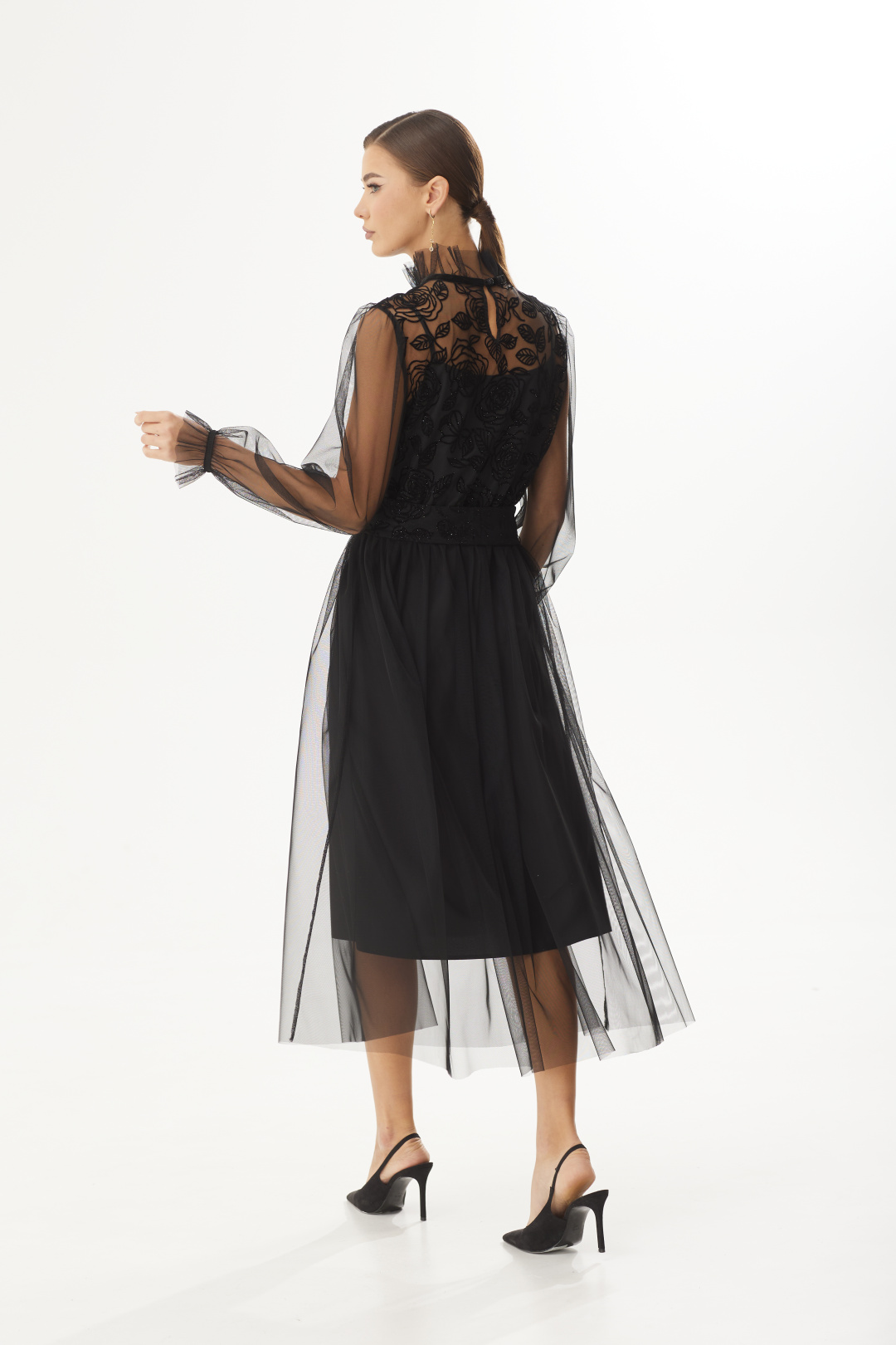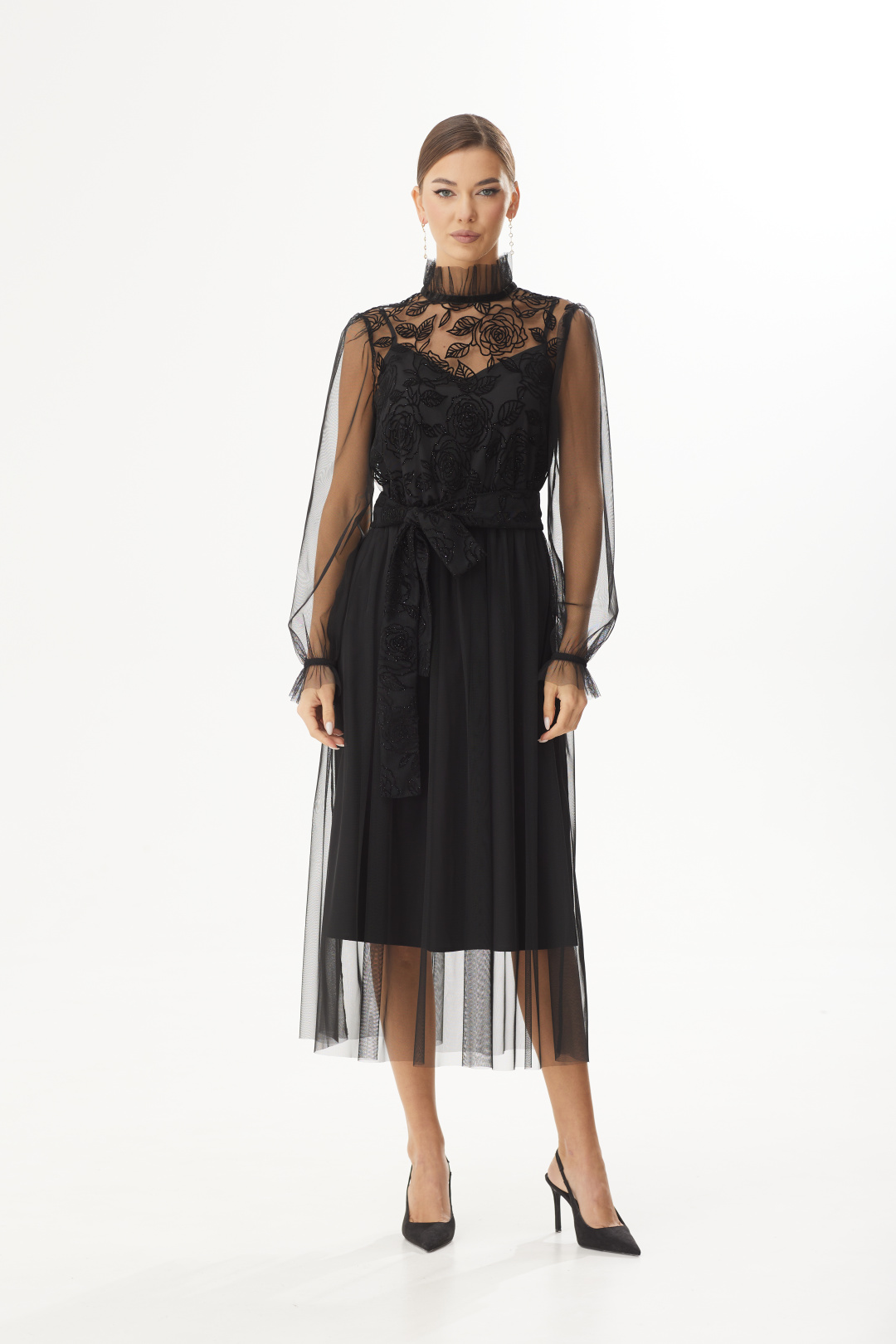 Платье двухслойное полуприлегающего силуэта, отрезное по линии талии. Верхний лиф выполнен из фатина с флоком. Перед и спинка цельнокроеные. В области горловины обработана застежка-капелька на навесную петельку и пуговицу. Нижняя юбка прямая, верхняя юбка собрана по линии талии. Рукав длинный, втачной, по низу оборка, на запястье просборен на резинку. Горловина округлой формы, декорирована тесьмой. В комплекте съемный пояс.