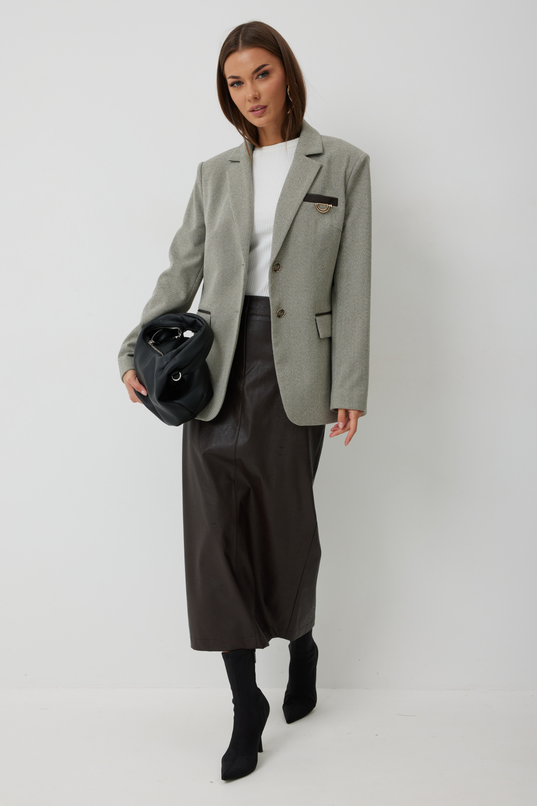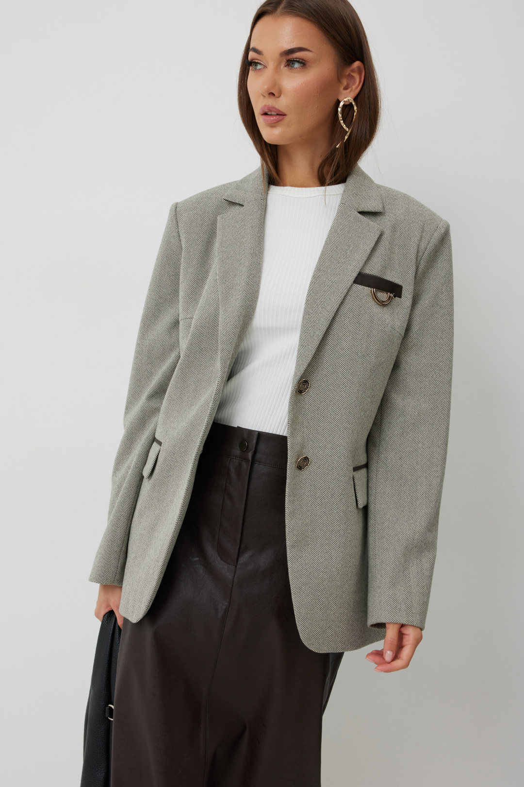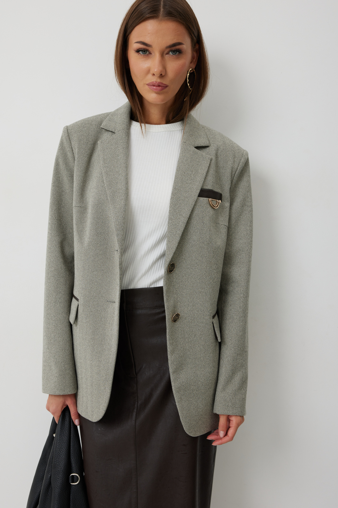 Жакет женский однобортный на подкладке прямого силуэта из трикотажной ткани. На передних частях жакета отрезной бочок с нагрудными вытачками. Обработаны прорезные карманы «в рамку» с клапаном. На левой части переда обработан карман с листочкой и декоративной пришивной деталью. Листочка, рамки кармана и нижний воротник выполнены из искусственной кожи. Спинка со шлицей в среднем шве. Рукав втачной двухшовный. Горловина обработана втачным воротником с отложными лацканами. Низ передних частей имеет закругленную форму. Жакет застегивается н а 2 декоративный пуговицы.