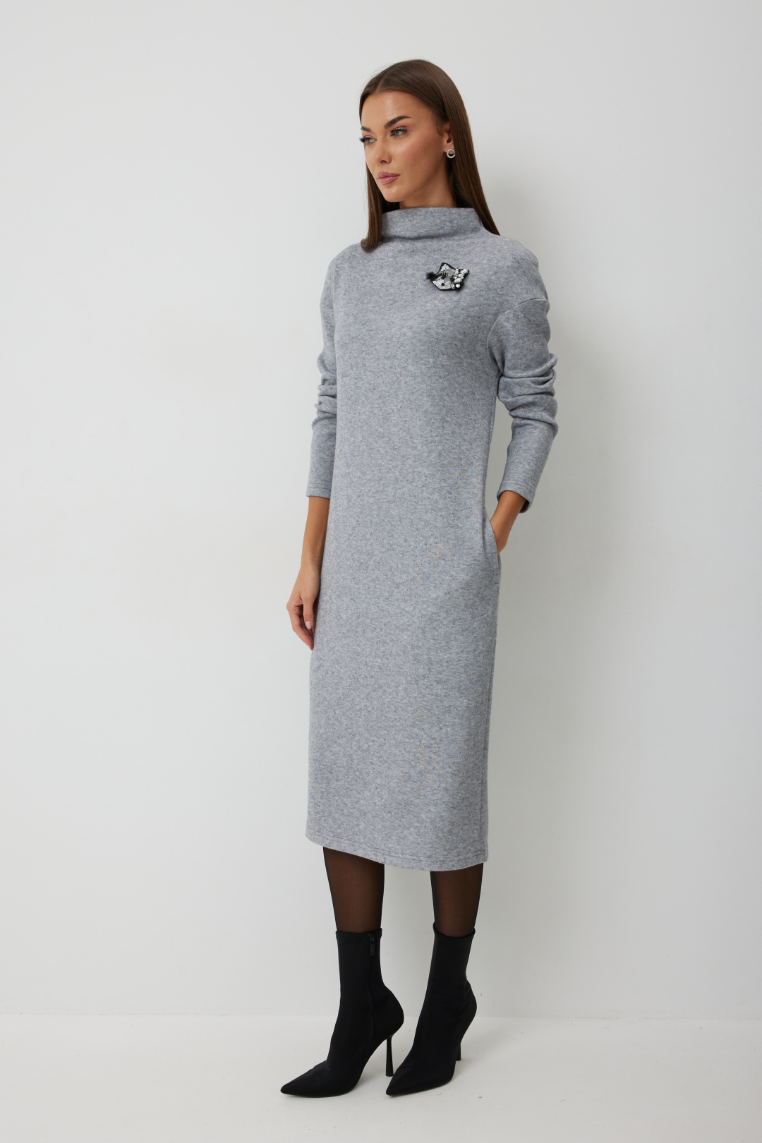 Платье трикотажное полуприлегающего силуэта с карманами в боковом шве. Длина платья до середины икры. Платье с цельнокроеной горловиной и спущенной линией плеча. Спинка со средним швом. Платье дополнено съемным авторским декором. Длина изделия по спинке 112см, длина рукава от плеча 70 см.