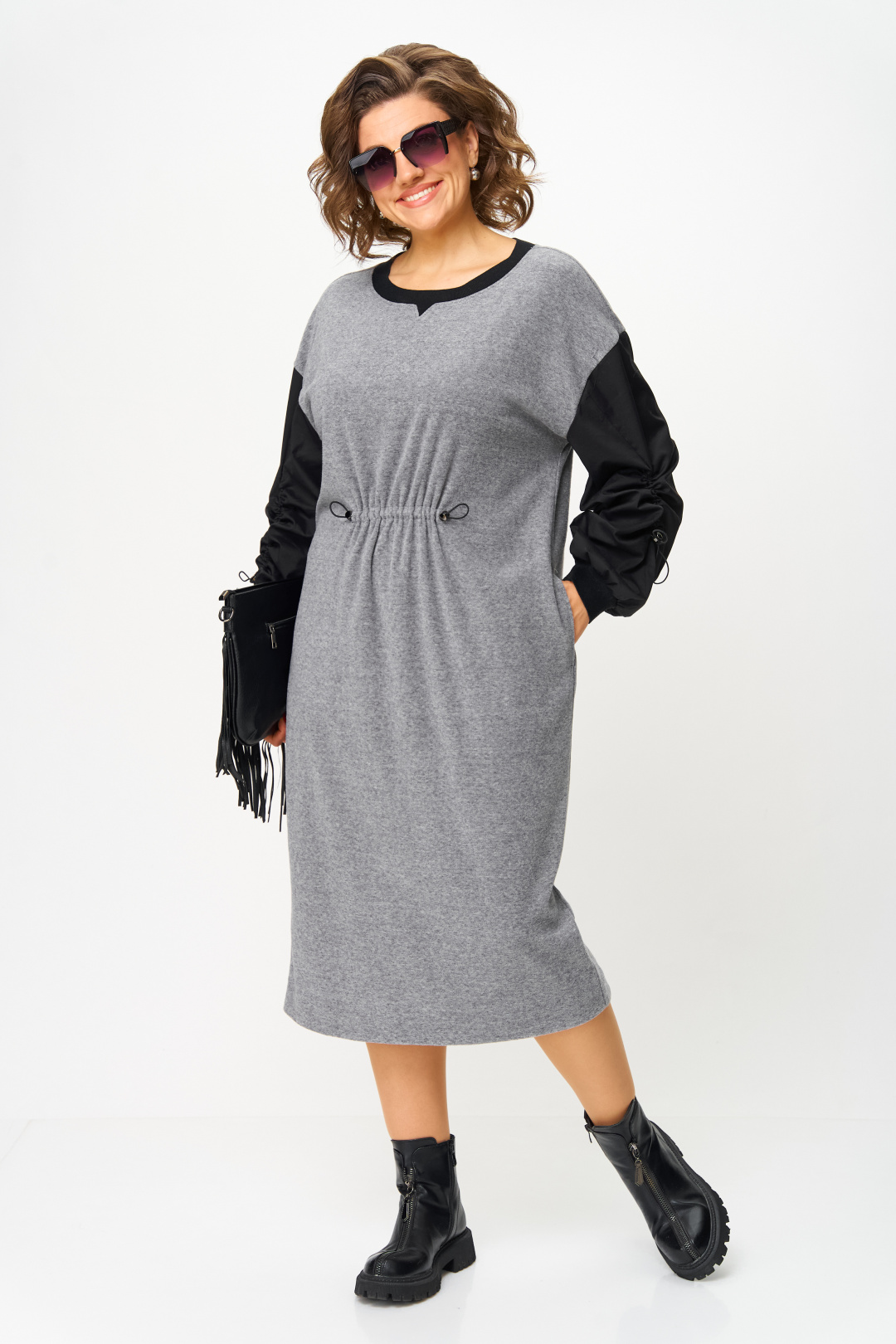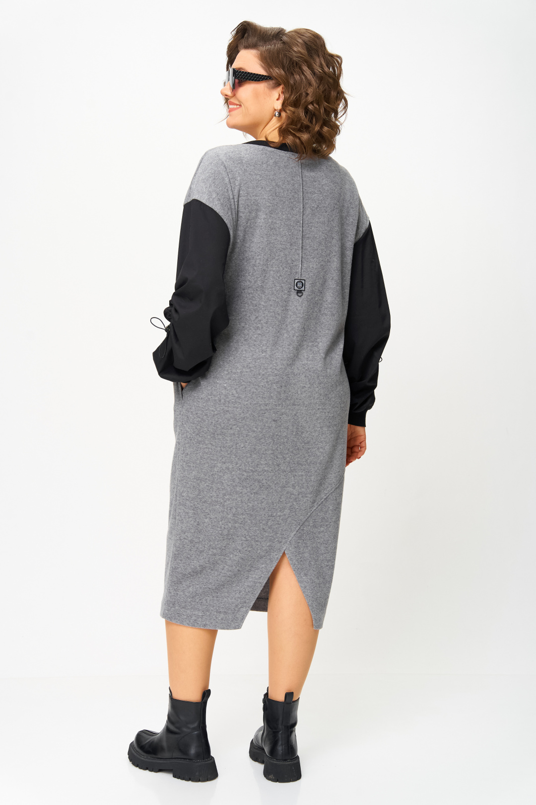 Силуэт прямой, линия плеча спущена. Горловина овальная обработана трикотажным довязом. В области талии по переду частично кулиса с 2 мя стопперами и эластичным шнуром. Карманы в боковых швах. Спинка имеет декоративные элементы: защип, нашивку, фигурный подрез в нижней части юбки.