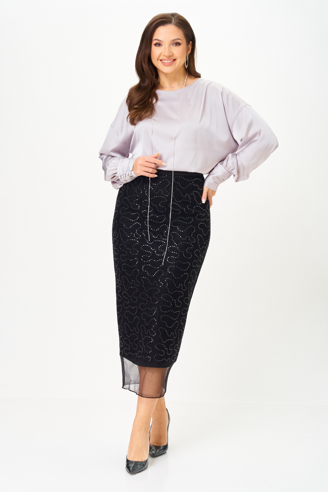 Юбка нарядная, выполнена из полотна с вышивкой и пайетками. Юбка на подкладке. Внизу юбка заканчивается фестоном из однотонной гипюровой сетки. Силуэт юбки прямой чуть зауженный к низу. Пояс притачной, застёжка в среднем шве задней половинки на потайную молнию. Разрез для хода внизу в среднем шве задней половины юбки.