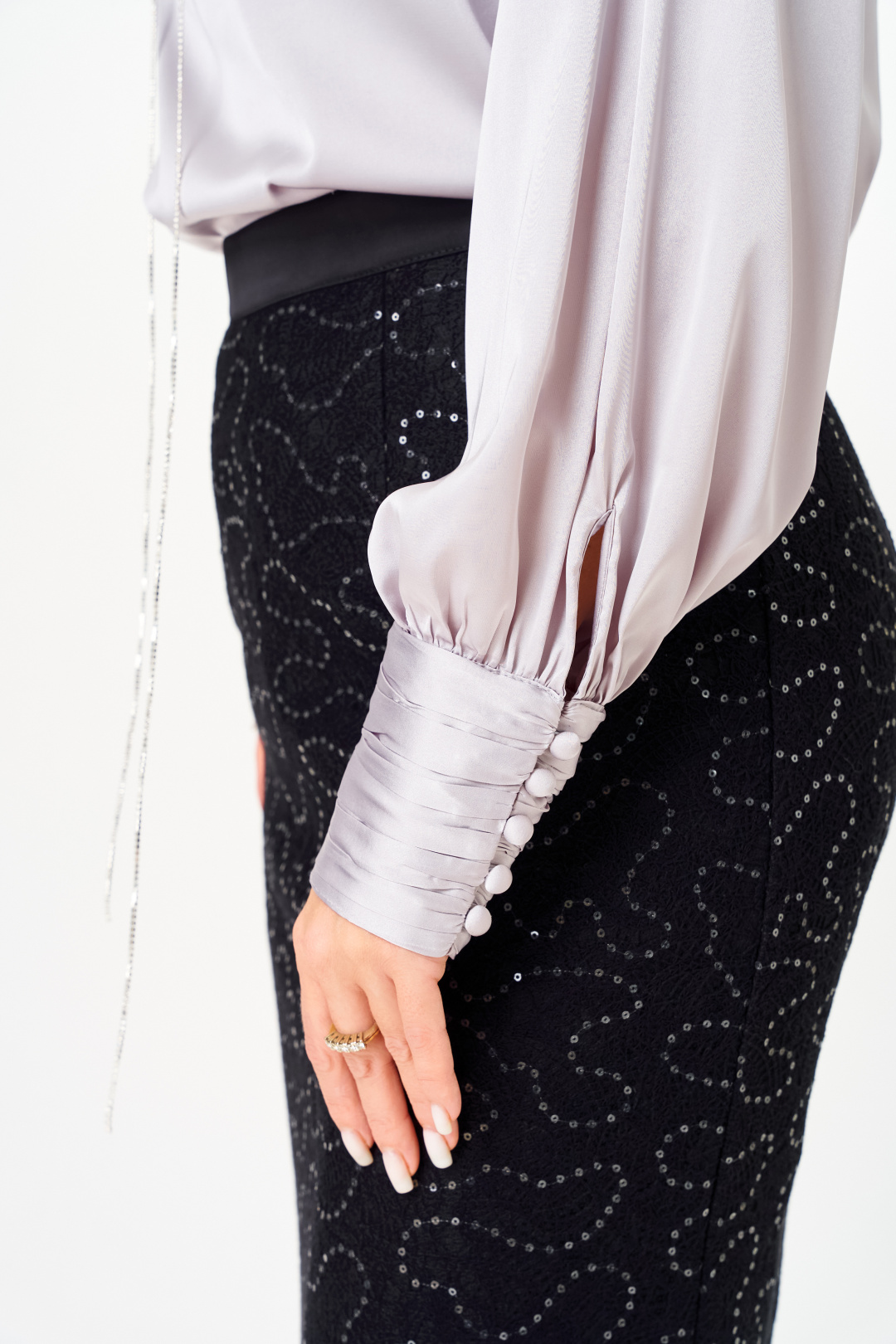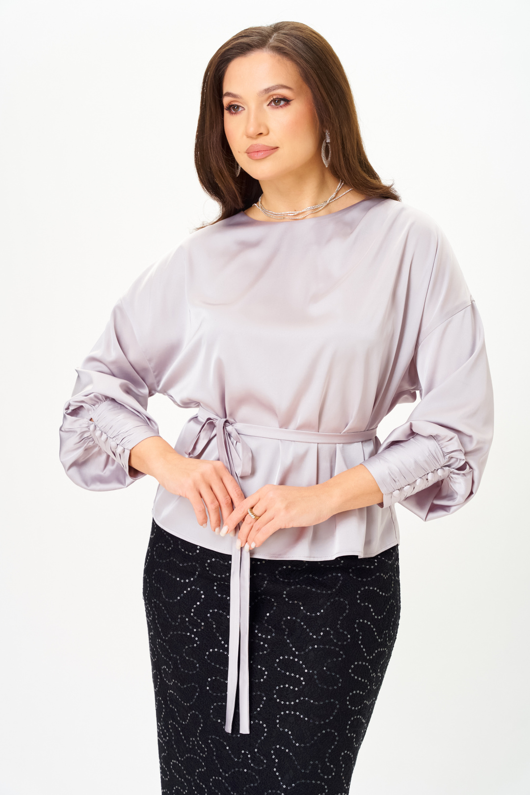 Блуза выполнена из мягкого блузочного сатина светлосерого цвета. Покрой свободный, линия плеча спущена. Горловина овальная, с одной стороны в плечевом шве заложены 2 складки. Рукав свободный широкий. Манжет рукава декорирован складками, застёжка на навесные петли и пуговицы в цвет основной ткани. Спинка блузки прямая свободная без особенностей, застёжка капелька на нависную петельку и пуговицу.