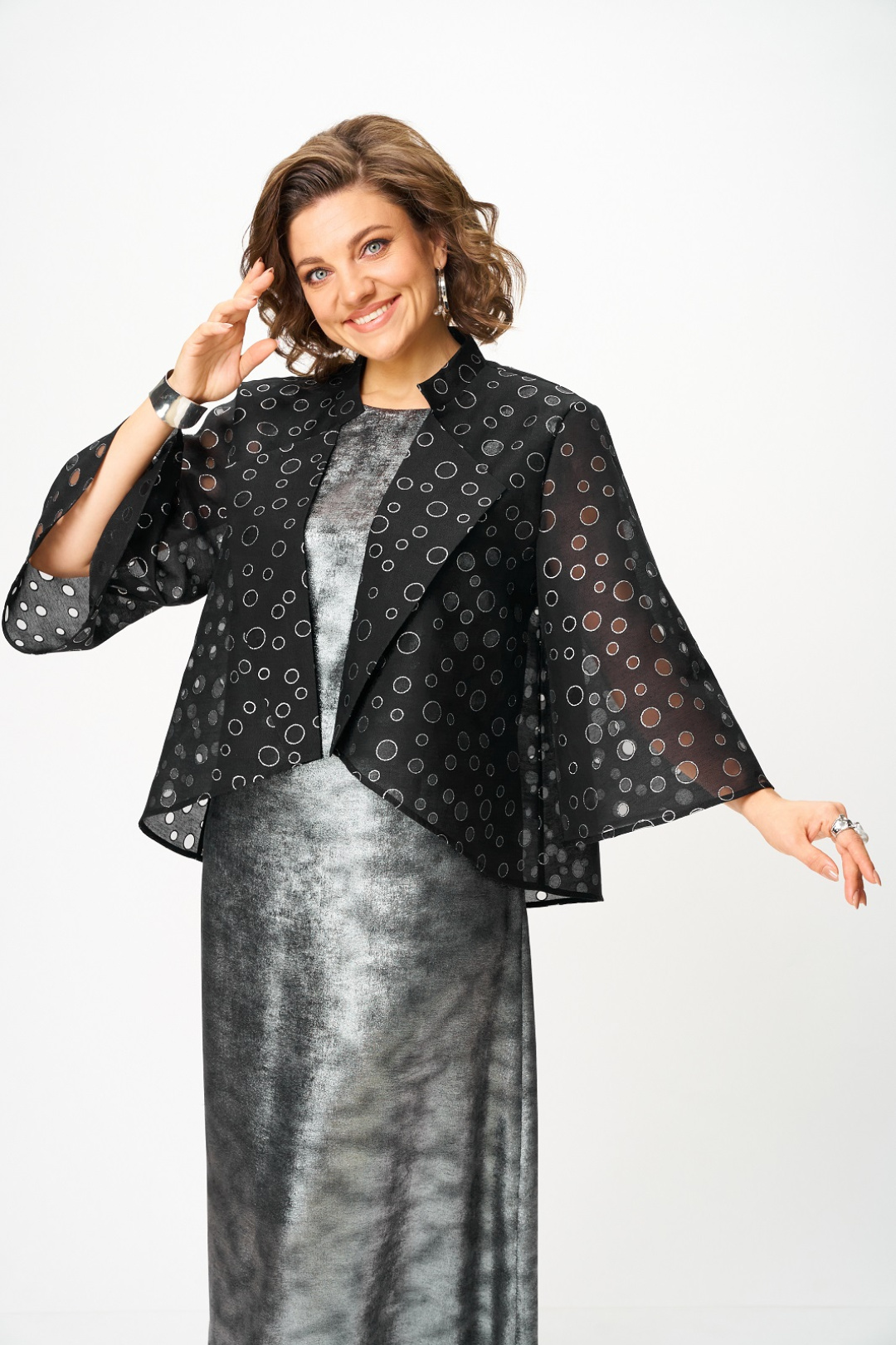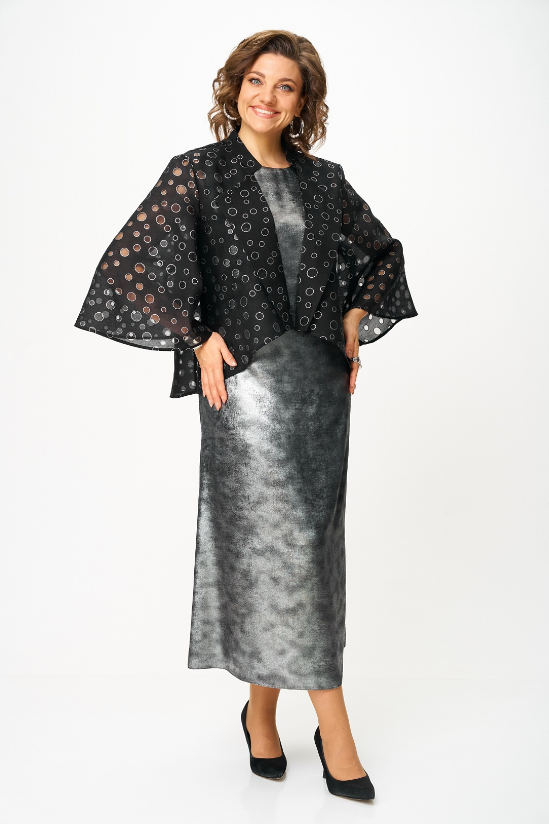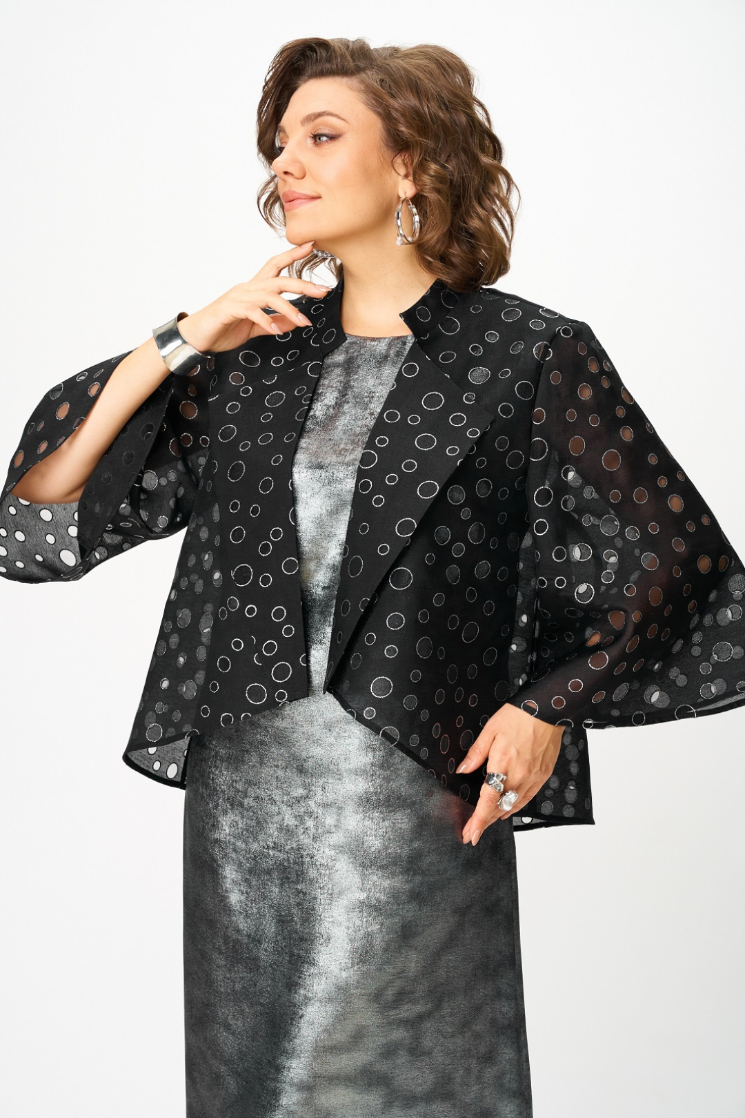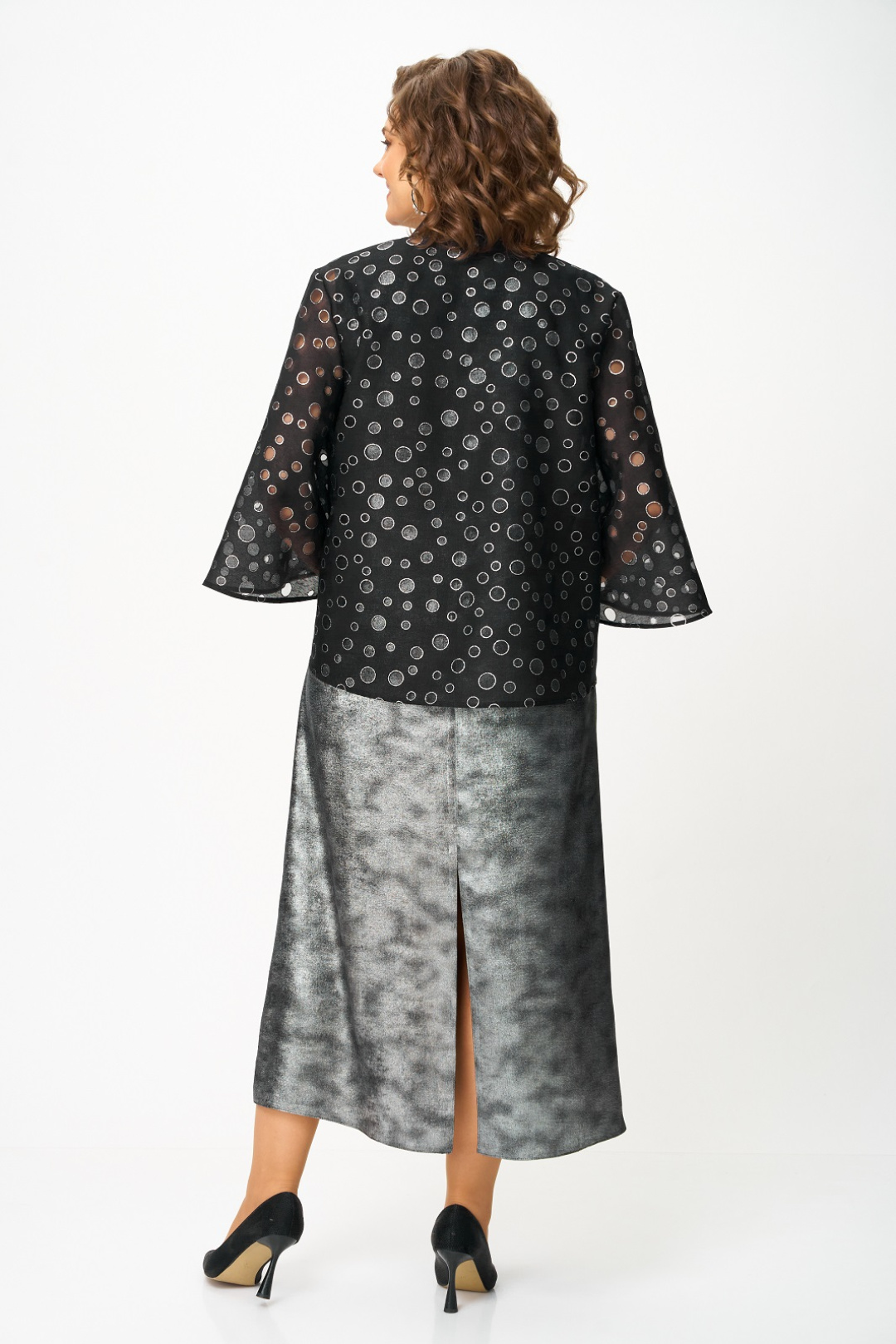 Нарядный женский комплект, состоящий из платья и блузона. Платье приталенное, удлиненное, без рукавов, с застежкой на потайную молнию по спинке. Блузон из прозрачной ткани с добавлением метонити, свободного облегания, силуэт расширенный к низу, без застежки, с воротником стойкой и отварачивающимся лацканами, рукав 7/8 расширенный к низу.