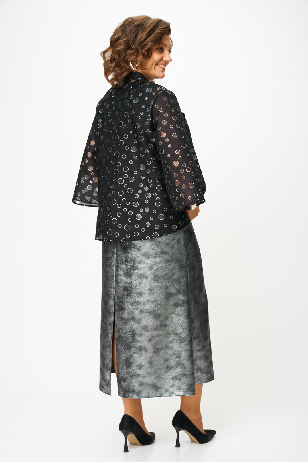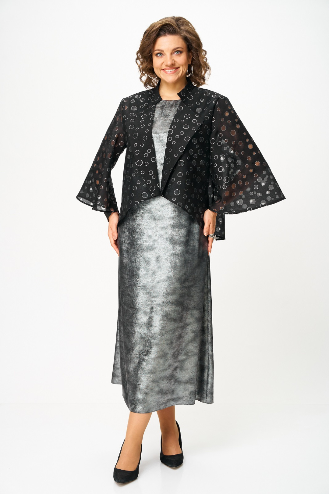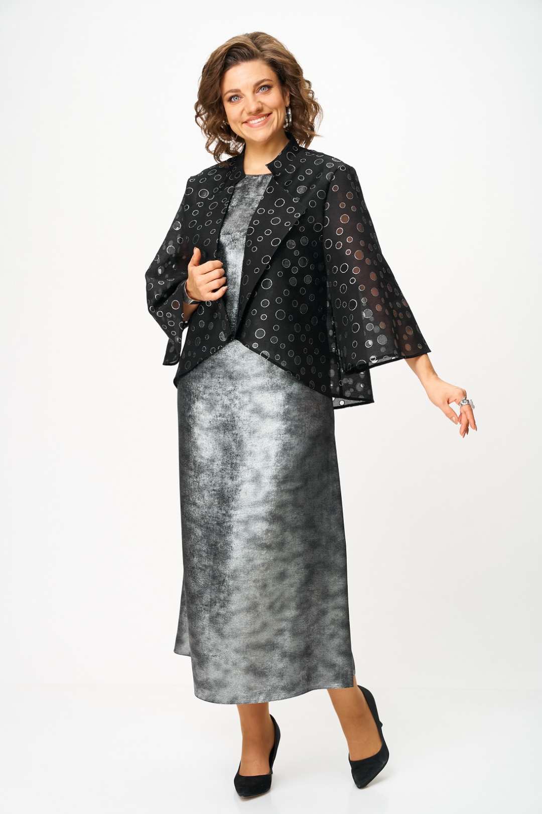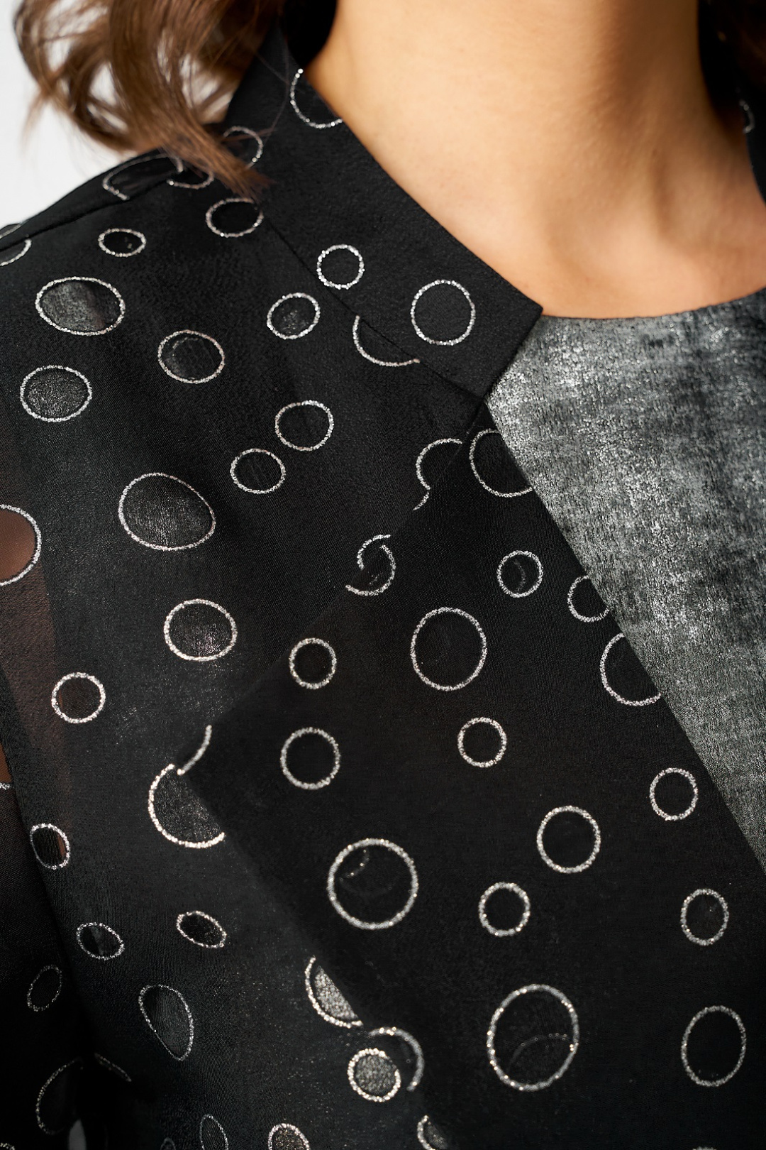Нарядный женский комплект, состоящий из платья и блузона. Платье приталенное, удлиненное, без рукавов, с застежкой на потайную молнию по спинке. Блузон из прозрачной ткани с добавлением метонити, свободного облегания, силуэт расширенный к низу, без застежки, с воротником стойкой и отварачивающимся лацканами, рукав 7/8 расширенный к низу.