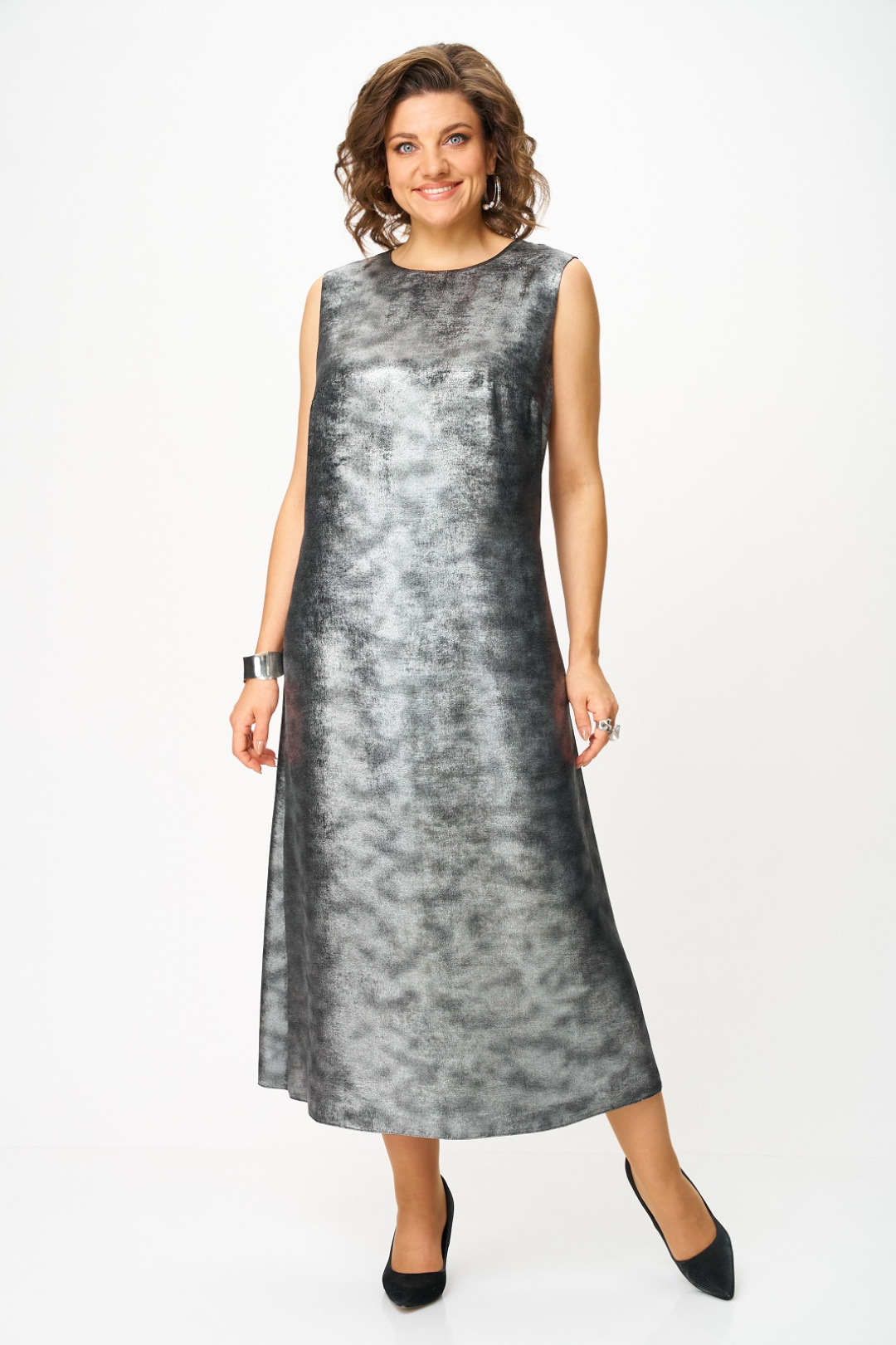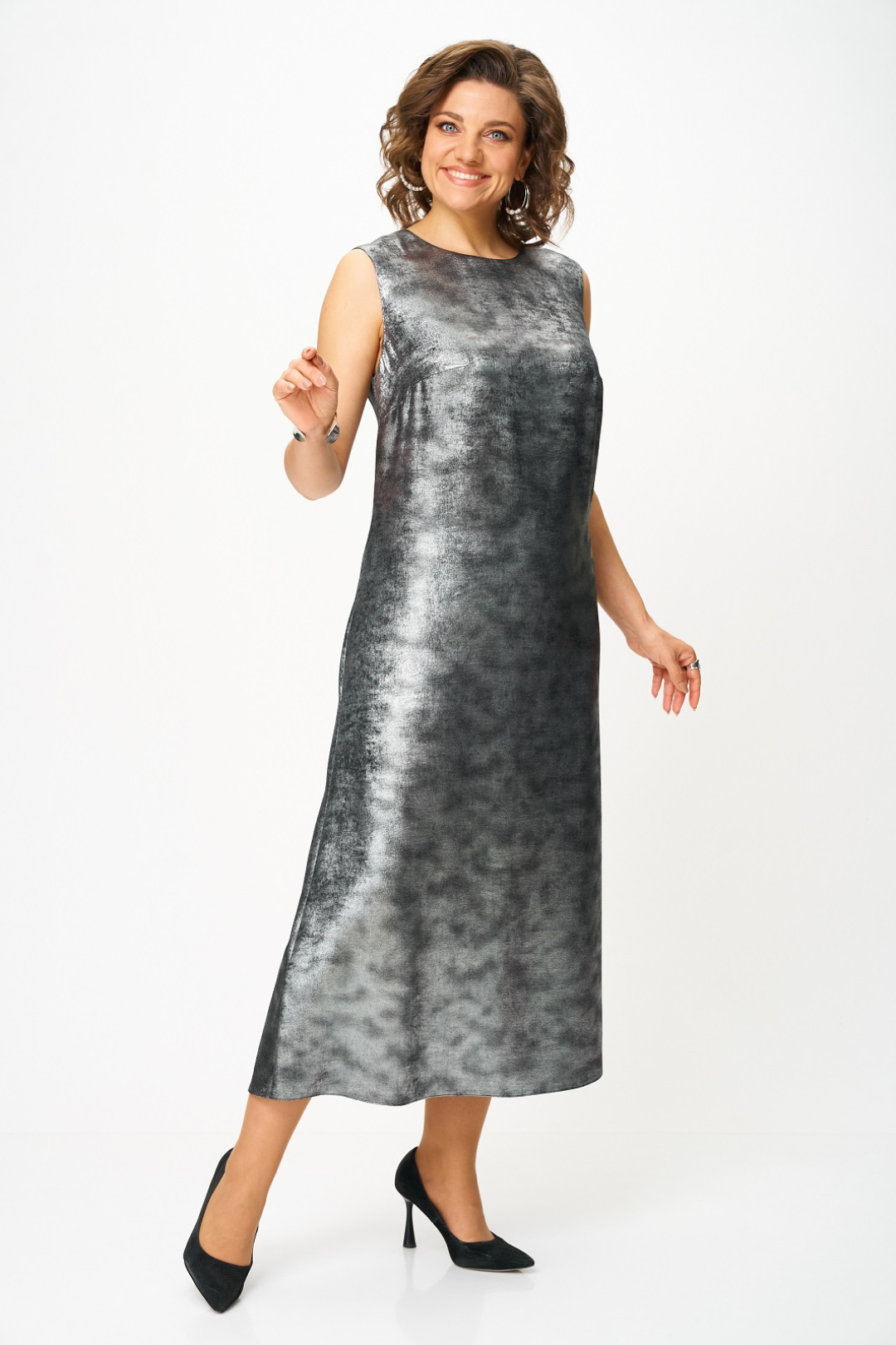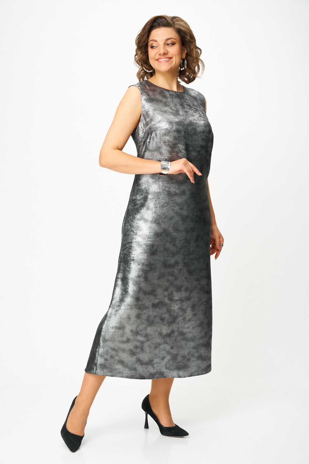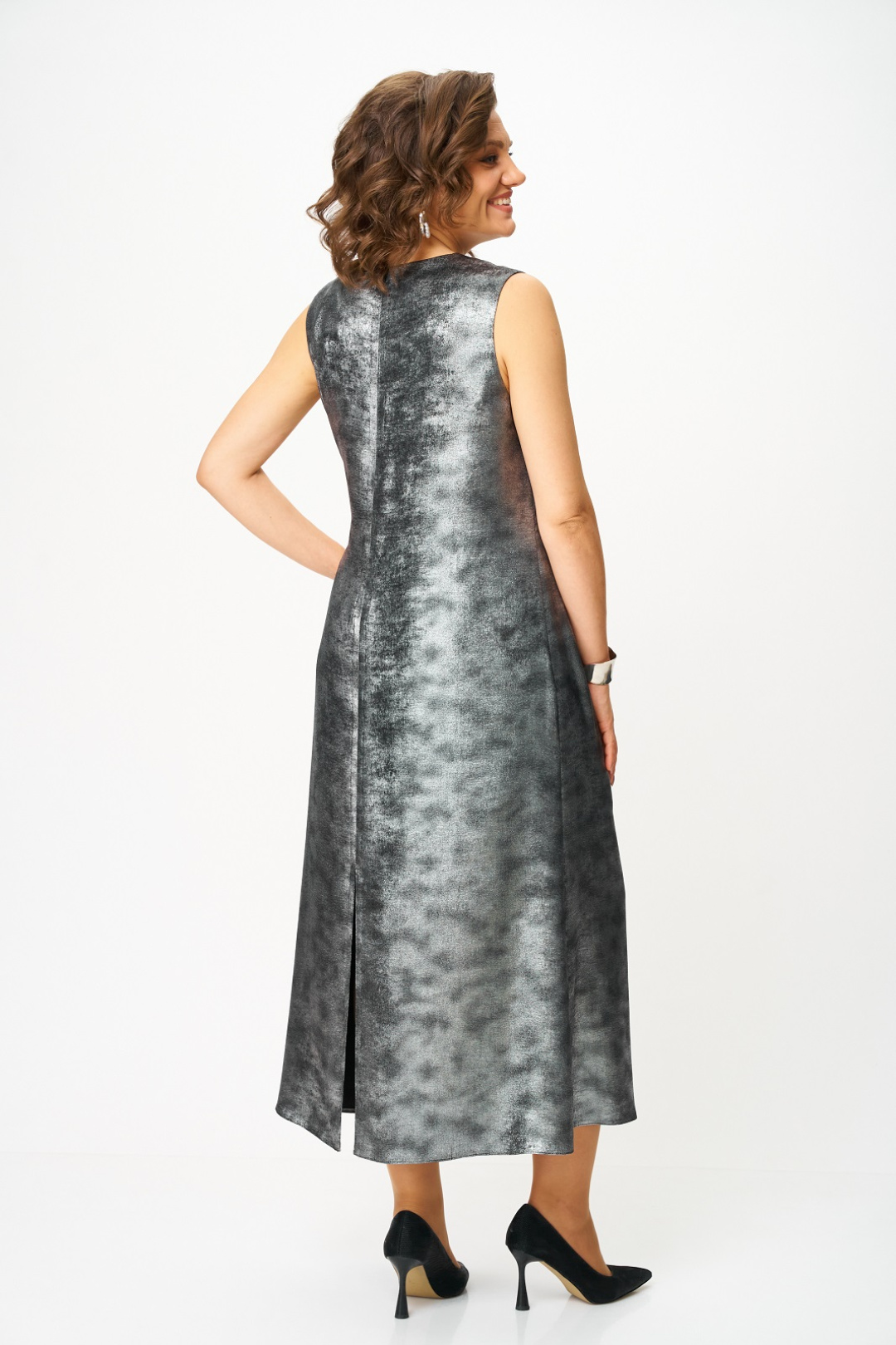 Нарядный женский комплект, состоящий из платья и блузона. Платье приталенное, удлиненное, без рукавов, с застежкой на потайную молнию по спинке. Блузон из прозрачной ткани с добавлением метонити, свободного облегания, силуэт расширенный к низу, без застежки, с воротником стойкой и отварачивающимся лацканами, рукав 7/8 расширенный к низу.