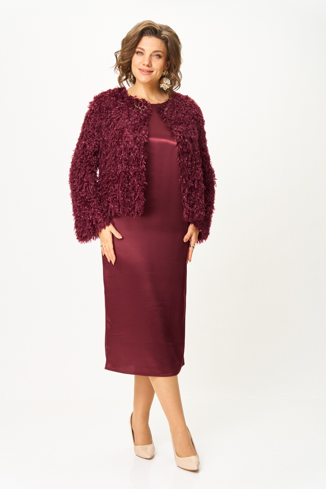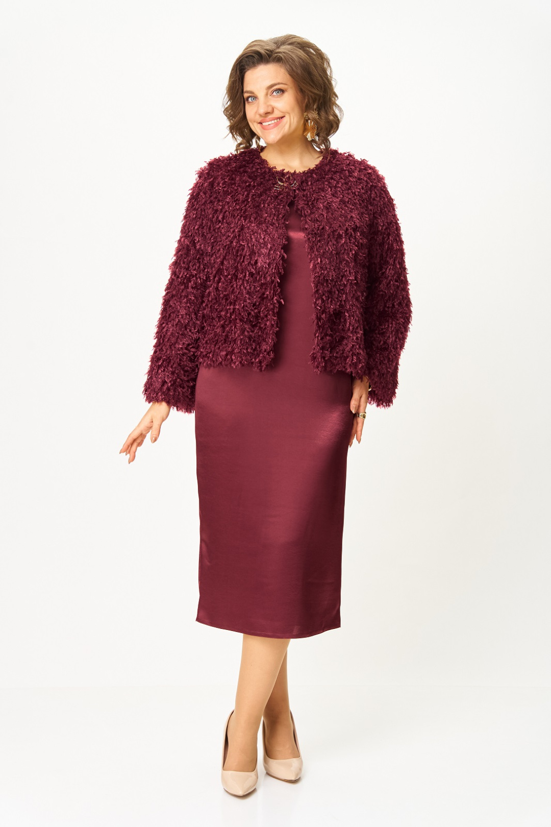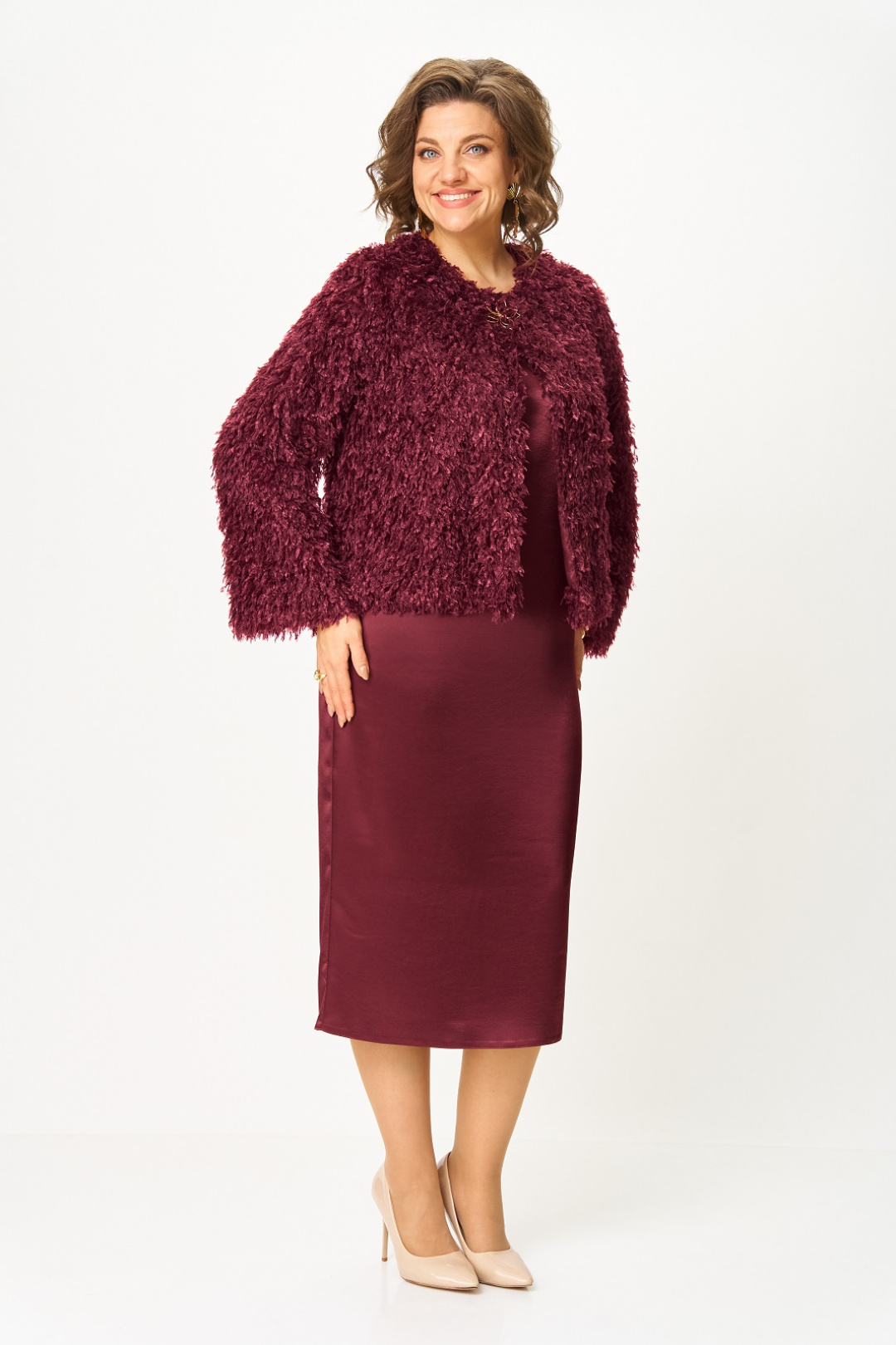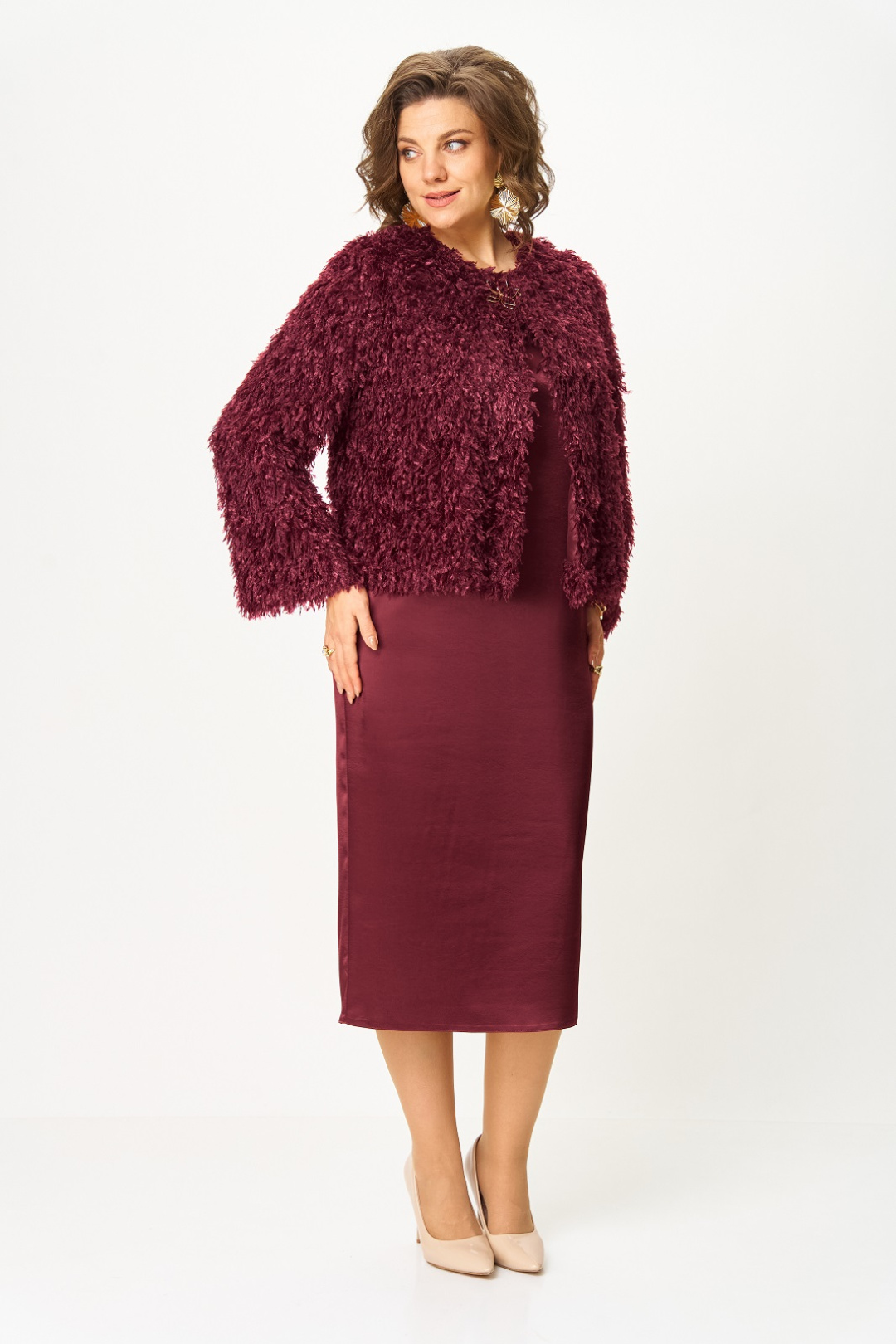 Нарядный женский комплект, состоящий из платья и жакета на подкладке. Платье из атласа с матовым блеском, с добавлением шелка. Удлиненное, полуприлегающего силуэта, вырез горловины круглый с застежкой на потайную молнию по спинке и высокой шлицей, без рукава, линия плеча слегка опущена. Жакет на подкладке, из ткани с имитацией ворса, что придает особенный шик и нарядность, вырез горловины круглый с застежкой на кнопку и декоративной брошью. Рукав длинный.