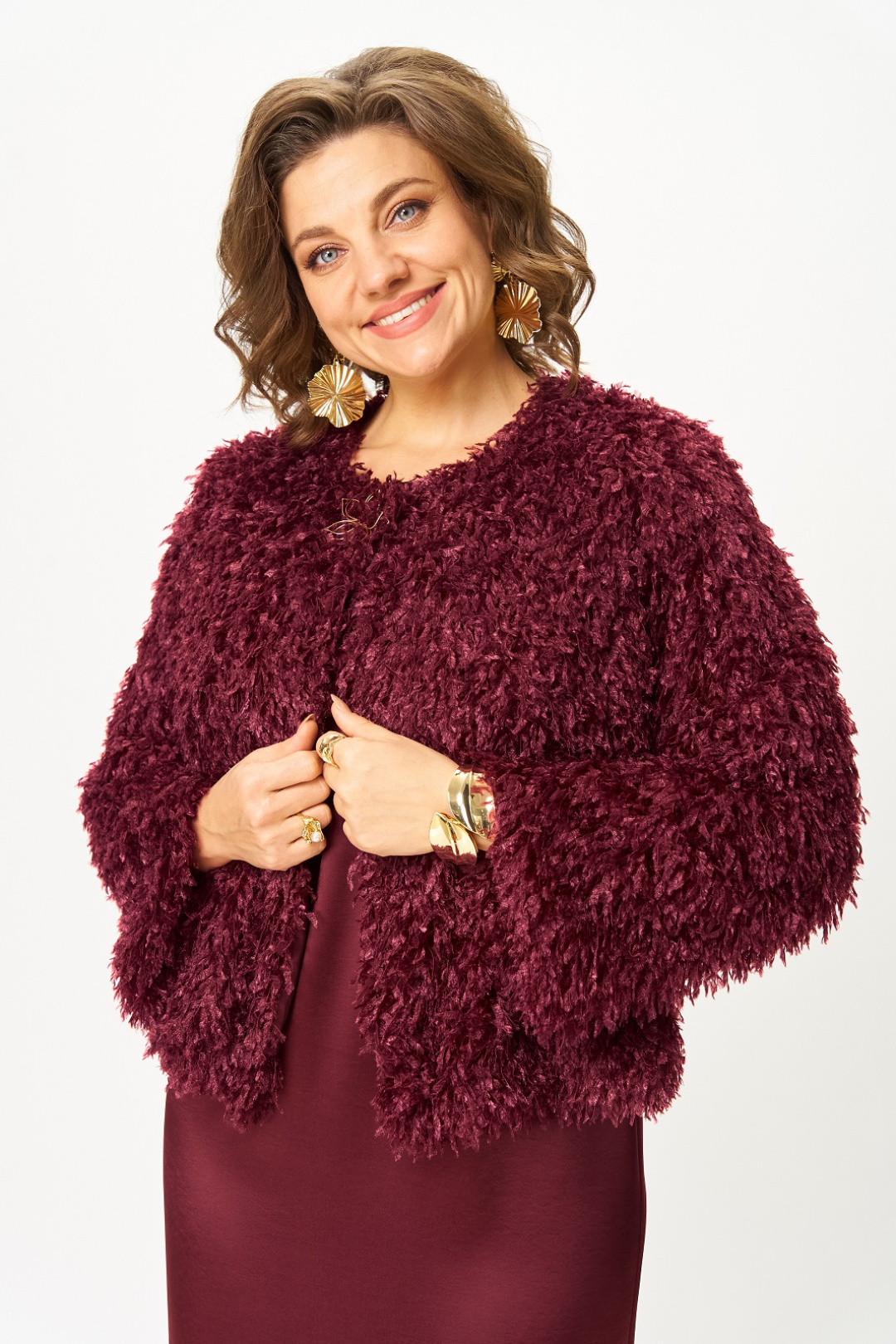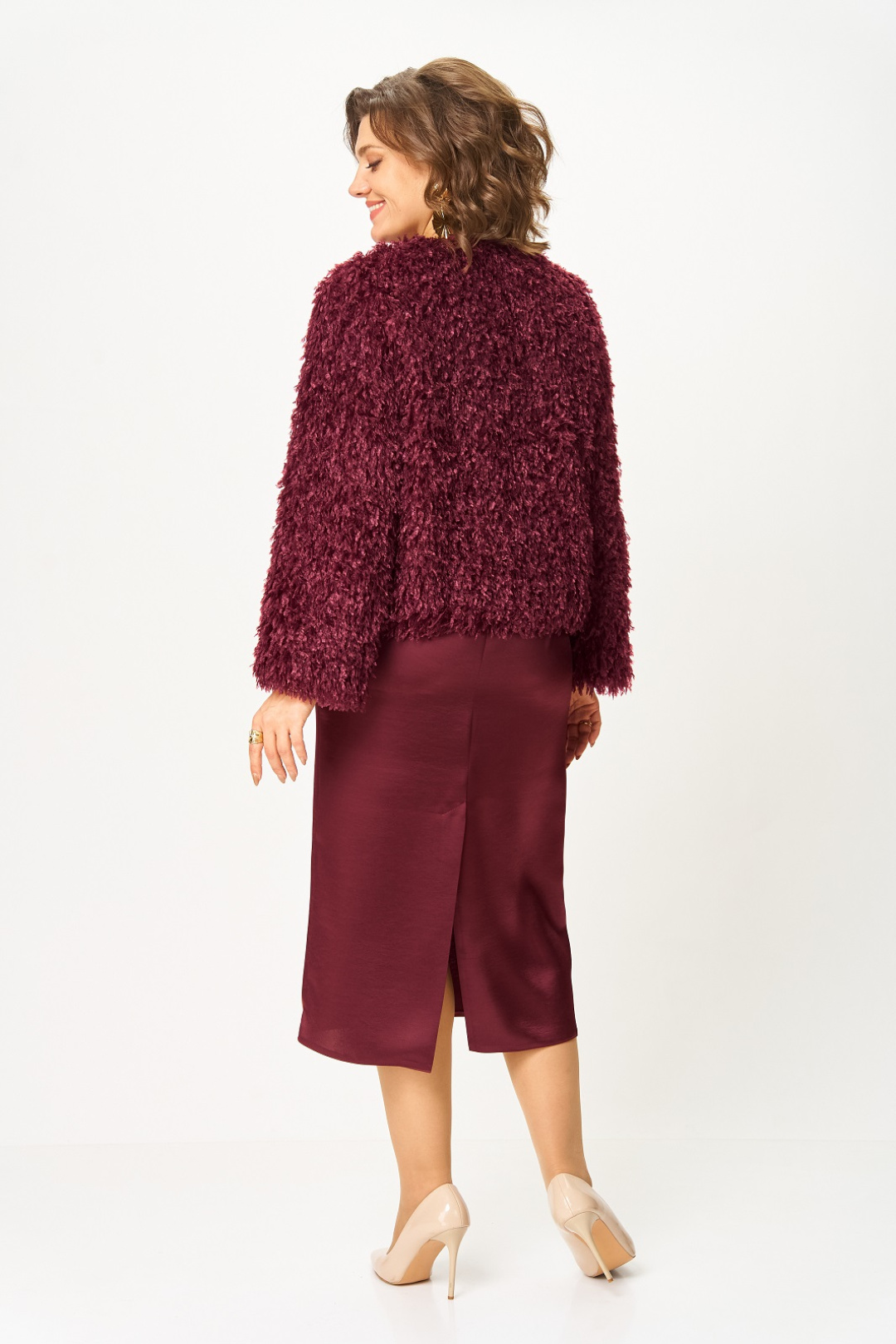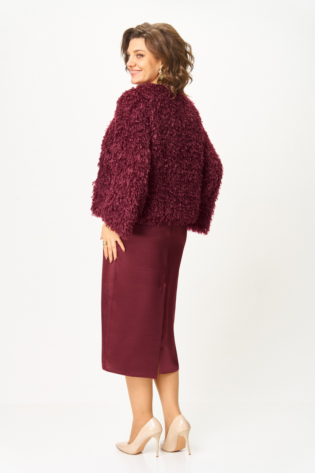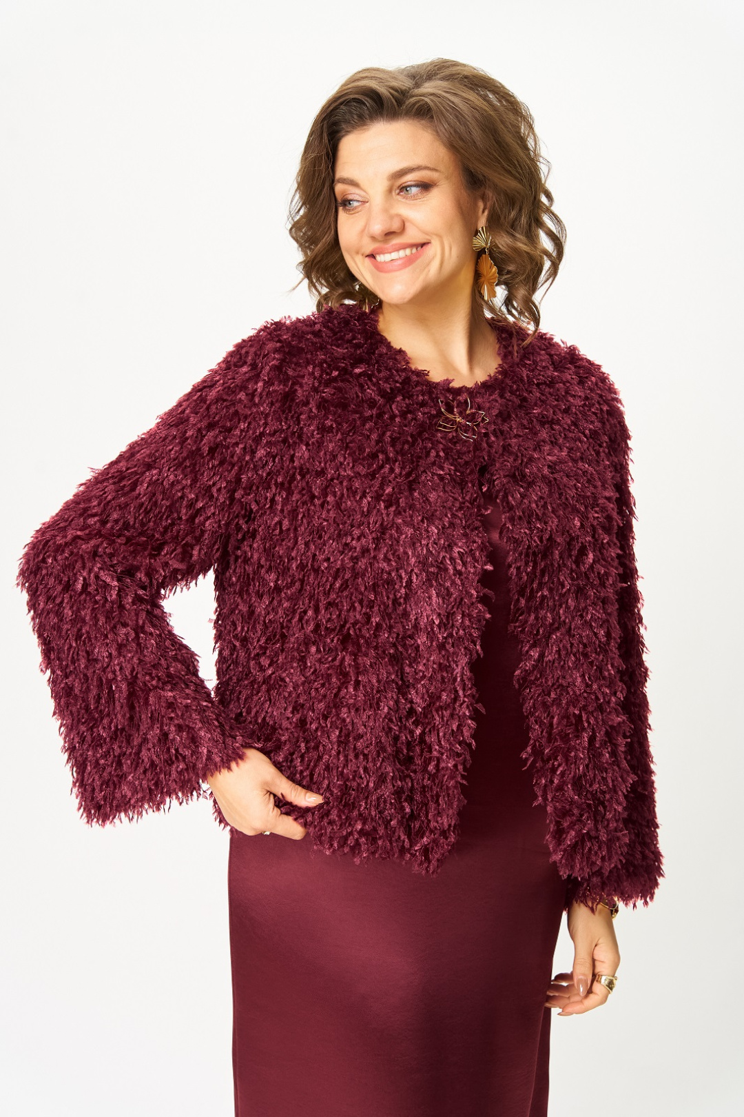 Нарядный женский комплект, состоящий из платья и жакета на подкладке. Платье из атласа с матовым блеском, с добавлением шелка. Удлиненное, полуприлегающего силуэта, вырез горловины круглый с застежкой на потайную молнию по спинке и высокой шлицей, без рукава, линия плеча слегка опущена. Жакет на подкладке, из ткани с имитацией ворса, что придает особенный шик и нарядность, вырез горловины круглый с застежкой на кнопку и декоративной брошью. Рукав длинный.