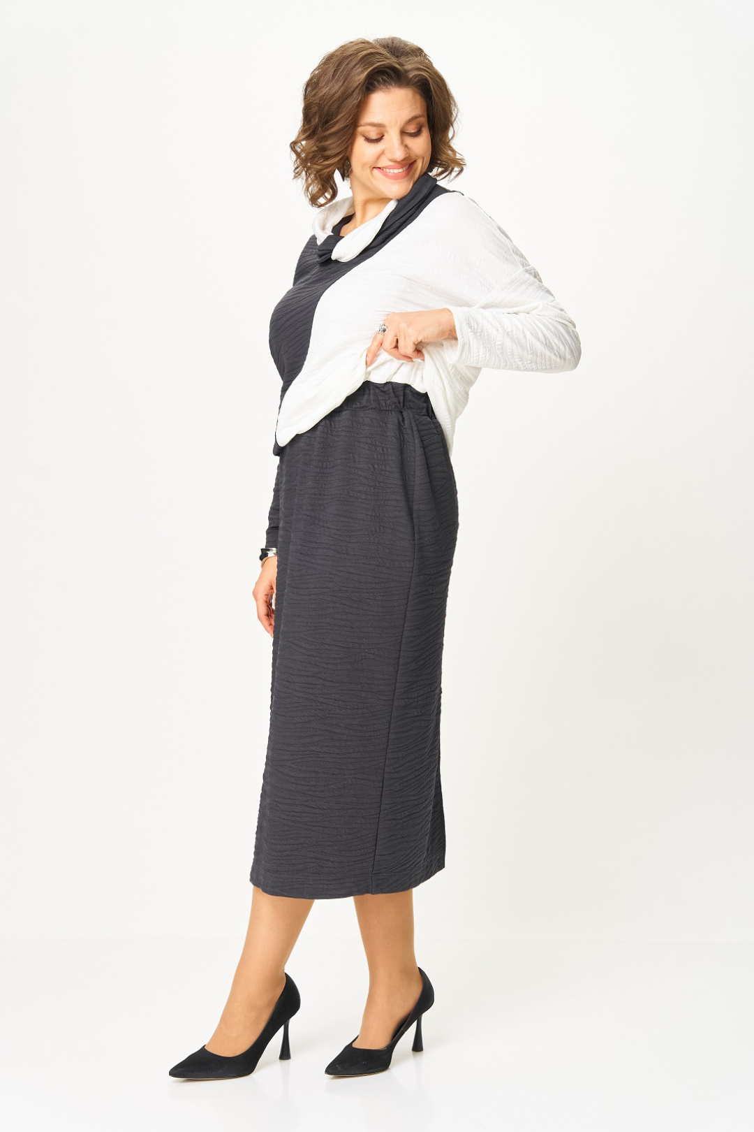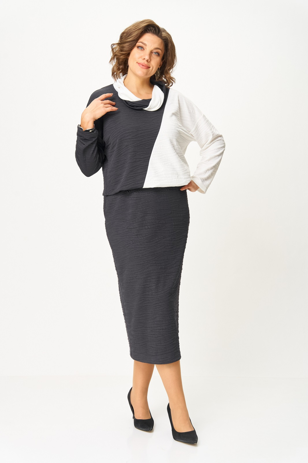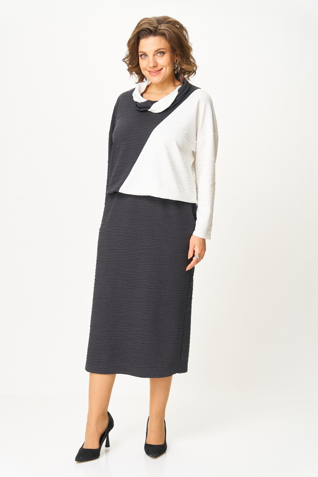Нарядное женское платье из трикотажной ткани с добавлением вискозы. Оригинальность платью придает слегка выпуклая фактура рисунк ткани и сочетание контрастных цветов. Силуэт прямой, удлиненное, вырез горловины круглый с отлетным по переду воротником - хомутом. Эффект воротника в переплетении двух цветов. Линия плеча слегка опущена, рукав длинный. Лиф и юбка соеденины отрезным поясом с резинкой, что позволяет делать напуск лифа. Юбка платья с разрезом по спинке, на подкладке.