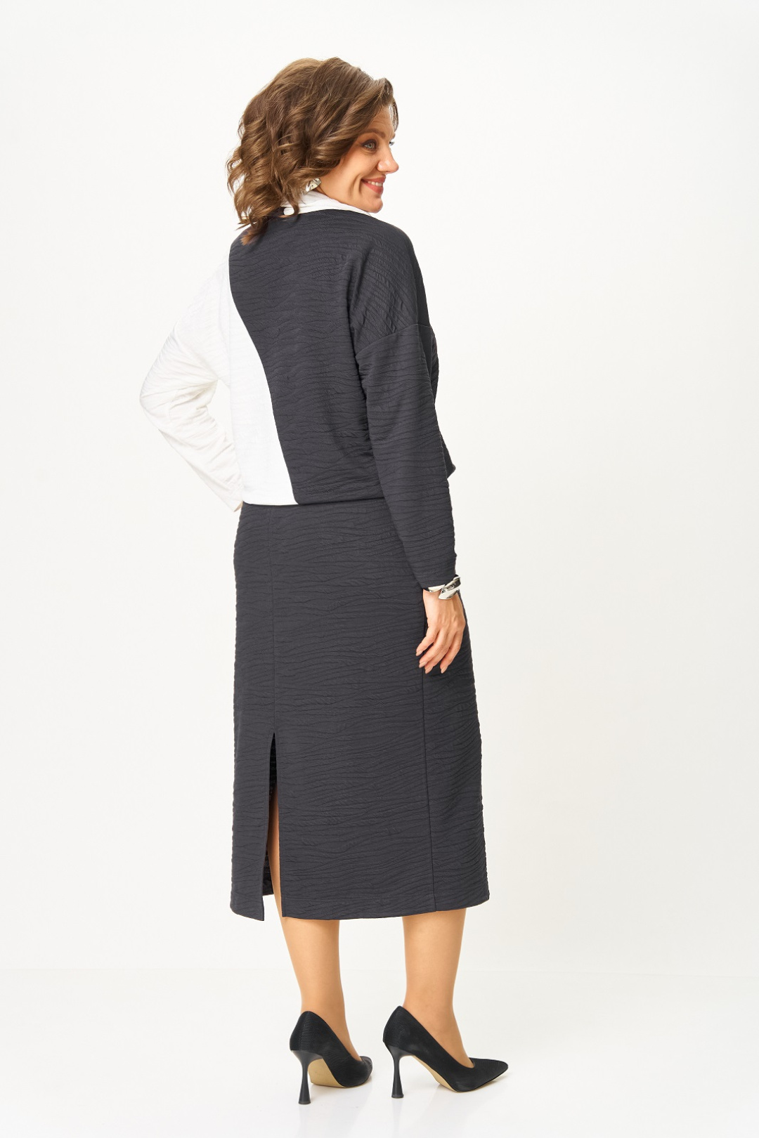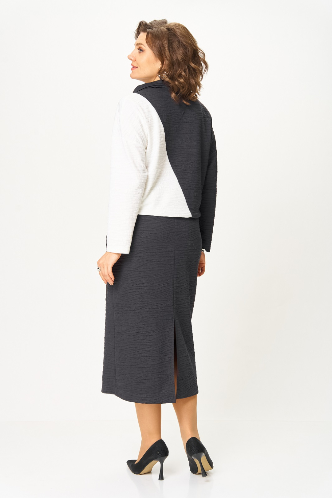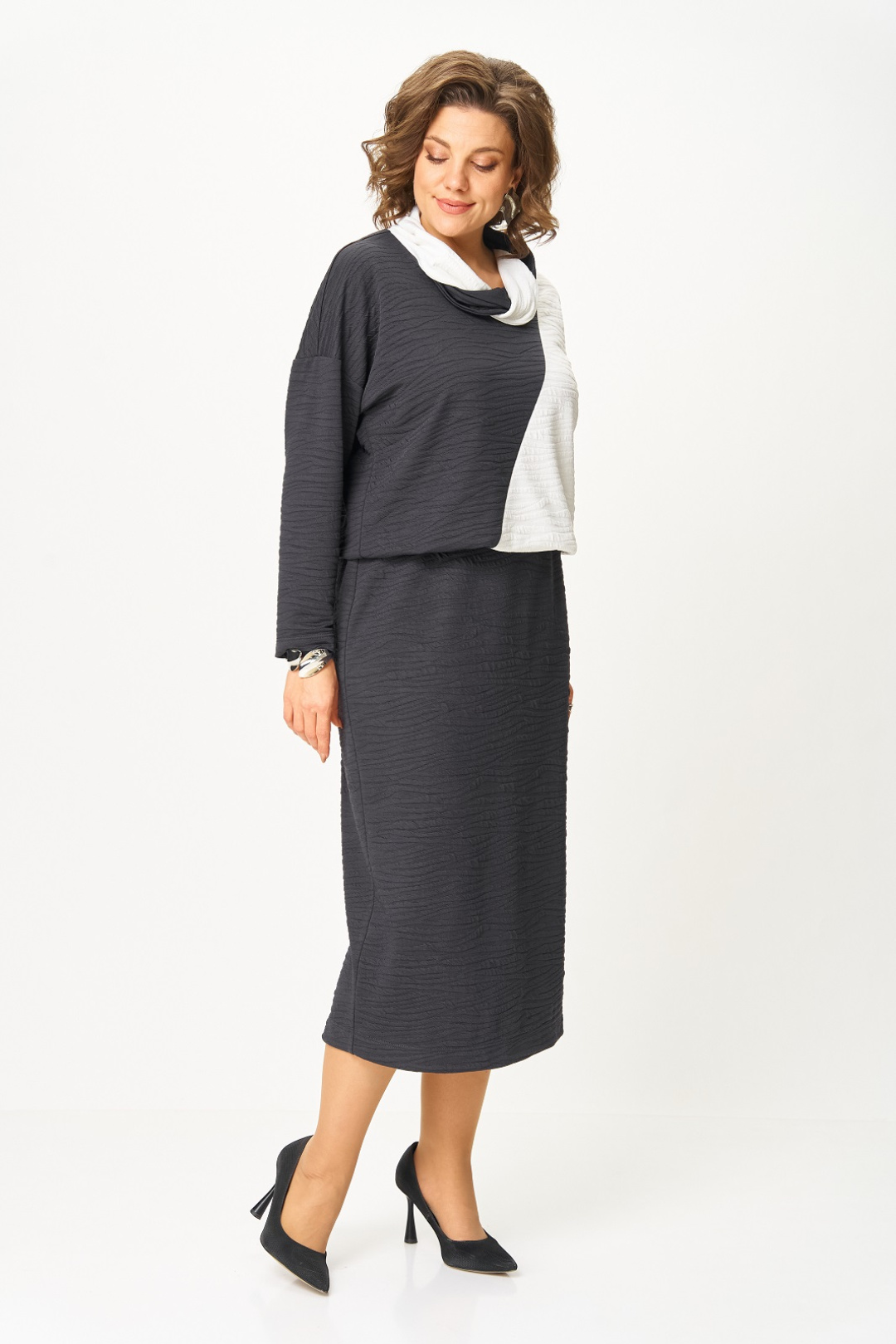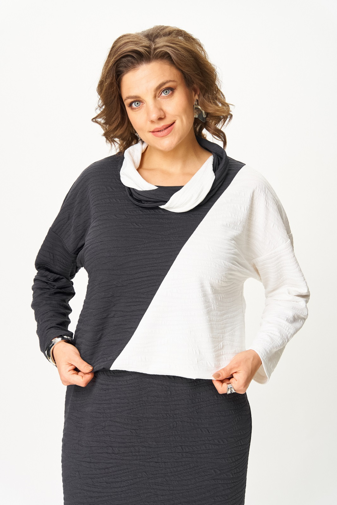 Нарядное женское платье из трикотажной ткани с добавлением вискозы. Оригинальность платью придает слегка выпуклая фактура рисунк ткани и сочетание контрастных цветов. Силуэт прямой, удлиненное, вырез горловины круглый с отлетным по переду воротником - хомутом. Эффект воротника в переплетении двух цветов. Линия плеча слегка опущена, рукав длинный. Лиф и юбка соеденины отрезным поясом с резинкой, что позволяет делать напуск лифа. Юбка платья с разрезом по спинке, на подкладке.