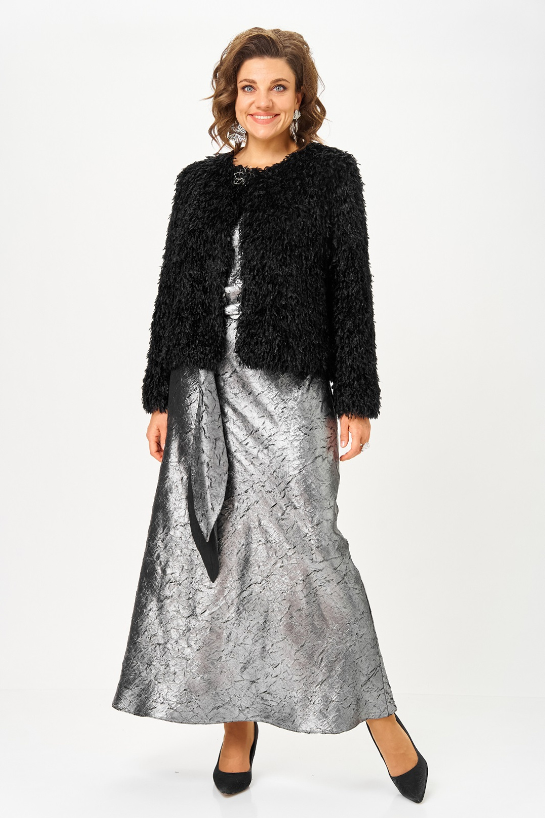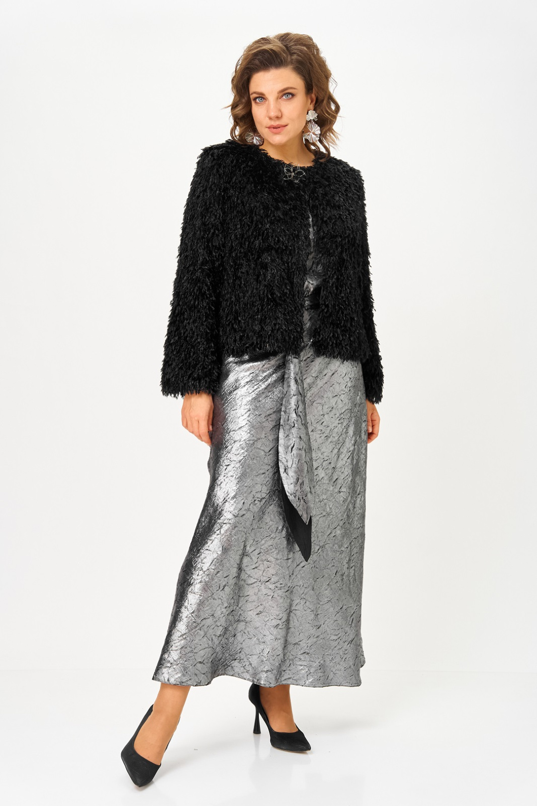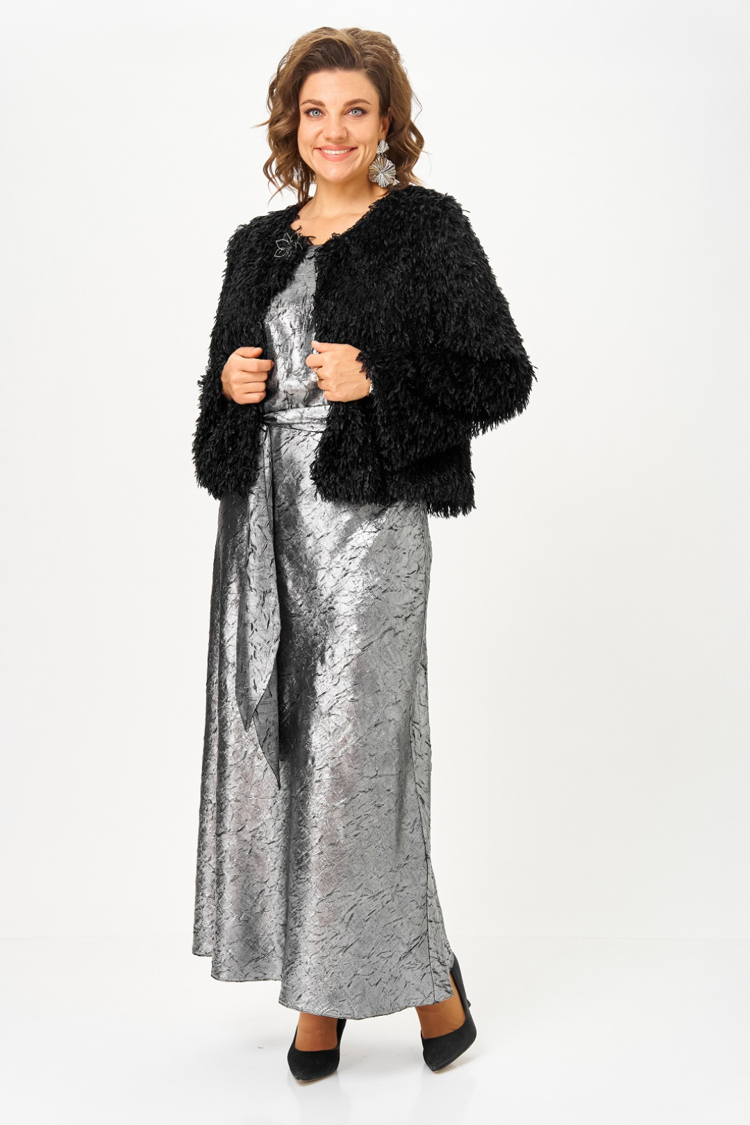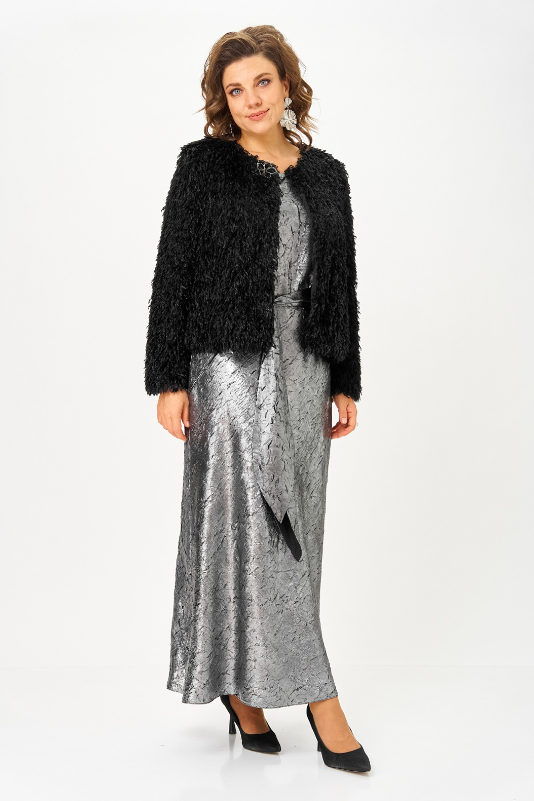 Нарядный женский комплект, состоящий из платья и жакета на подкладке. Платье из атласа с добавлением шелка, фактура ткани с эффектом "крэш". Удлиненное, отрезное по линии талии, вырез горловины круглый, рукав цельнокроенный, короткий, в боковом шве потайная молния, юбка расширена к низу, съемный пояс двухсторонний. Жакет на подкладке, из ткани с имитацией ворса, что придает особенный шик и нарядность, вырез горловины круглый с застежкой на кнопку и декоративной брошью. Рукав длинный.