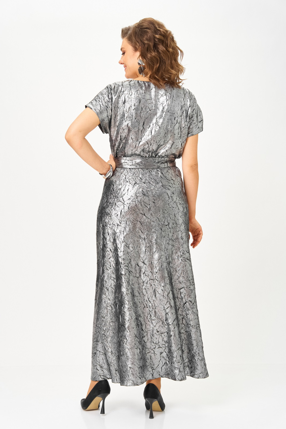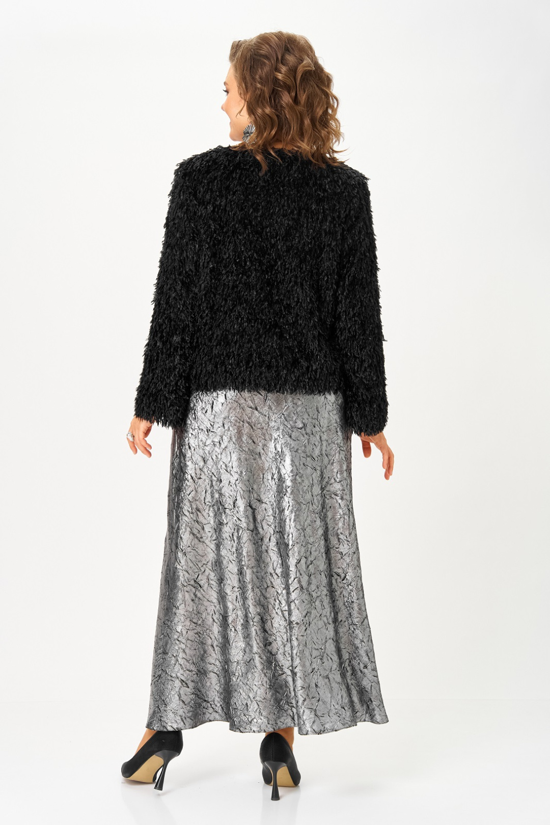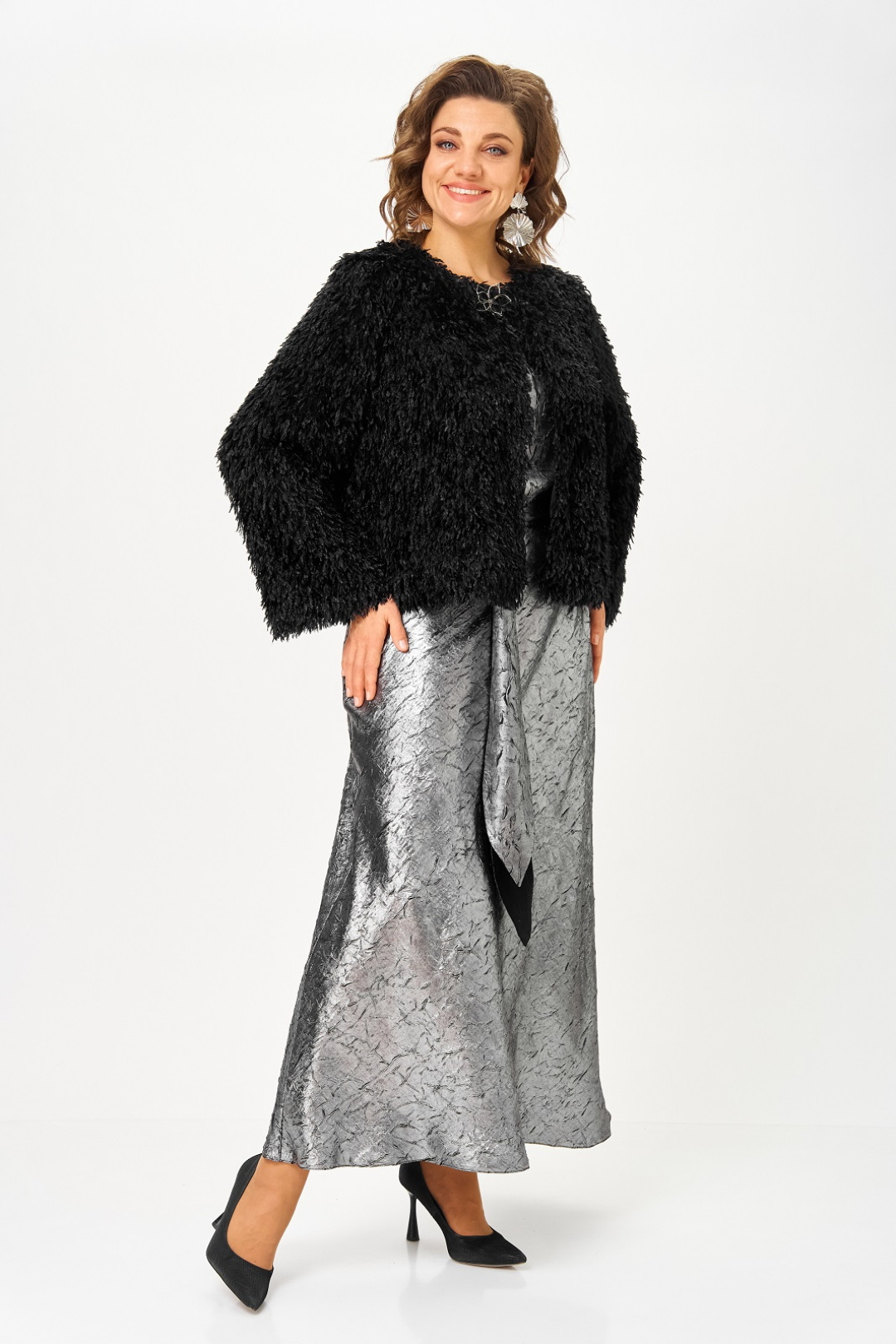 Нарядный женский комплект, состоящий из платья и жакета на подкладке. Платье из атласа с добавлением шелка, фактура ткани с эффектом "крэш". Удлиненное, отрезное по линии талии, вырез горловины круглый, рукав цельнокроенный, короткий, в боковом шве потайная молния, юбка расширена к низу, съемный пояс двухсторонний. Жакет на подкладке, из ткани с имитацией ворса, что придает особенный шик и нарядность, вырез горловины круглый с застежкой на кнопку и декоративной брошью. Рукав длинный.